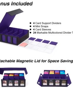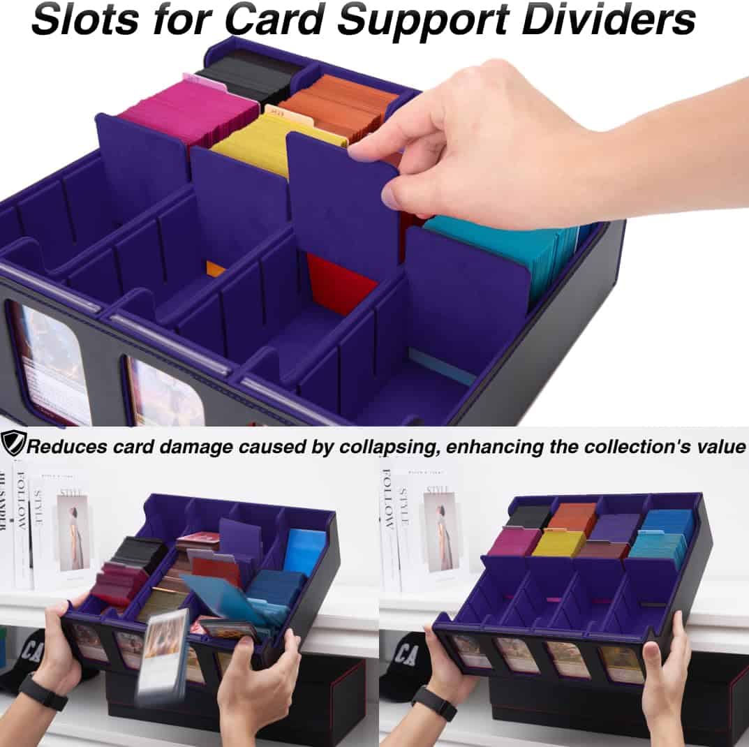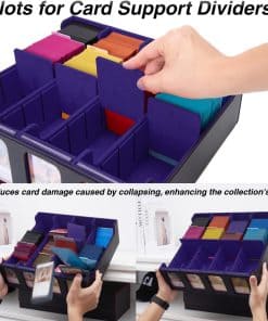 2. Soportes de tarjetas innovadoras Diseñadas para evitar que tus cartas de valor se colapsen. Incluso cuando la caja de almacenamiento de tarjetas coleccionables no está completamente llena, estos soportes de estilo ranura aseguran que tus cartas permanezcan erguidas, evitando daños y caídas tipo dominó. Esta característica no solo preserva la condición de tus cartas, sino que también aumenta el valor coleccionable de tu creciente colección al mantenerlas en forma prístina.