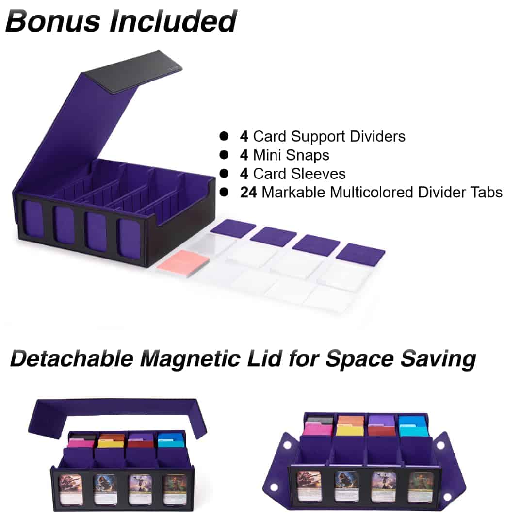 5. Caja versátil de colección de tarjetas Diseñada para jugadores y coleccionistas, nuestras cajas de cartas de mazo son perfectas para una variedad de cartas de juego y coleccionables, incluyendo Magic: The Gathering, Dragon Shield, One Piece, Pokémon, YuGiOh!, Duel Masters, cartas de deportes y cartas de Dominion con expansiones. Con una resistente carcasa de cuero PU para protección contra golpes, un interior suave de microfibra para evitar arañazos y varios imanes para un cierre seguro, esta amplia caja de cartas de comercio garantiza un transporte y organización seguros, convirtiéndola en una elección de primera categoría para jugadores de cartas!