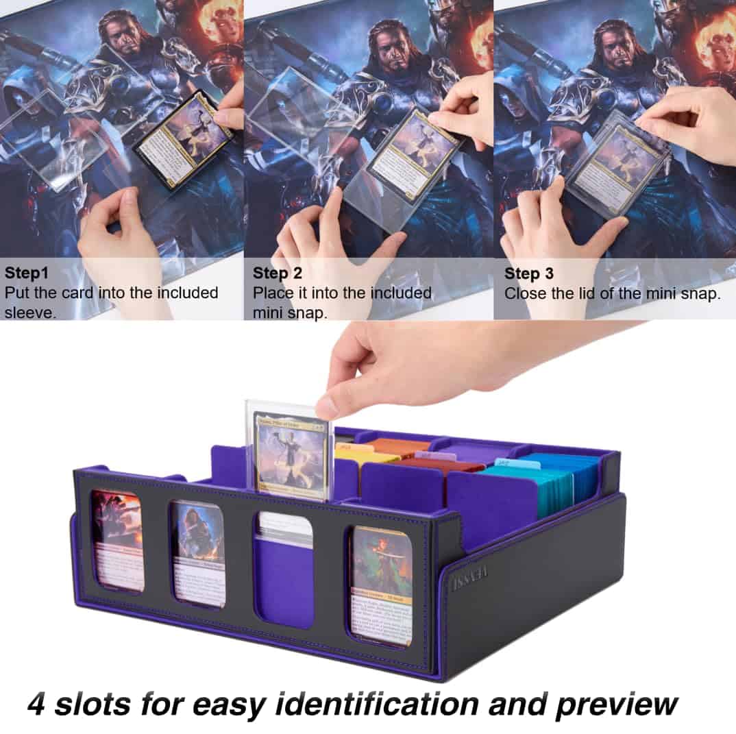 4. 4 Ranuras de exhibición para vista previa de cartas fácil Esta caja de almacenamiento cuenta con ranuras en un lado para mostrar 4 cartas, lo que te permite diferenciar fácilmente entre cajas y previsualizar su contenido. Viene con mini broches y fundas para cada carta.