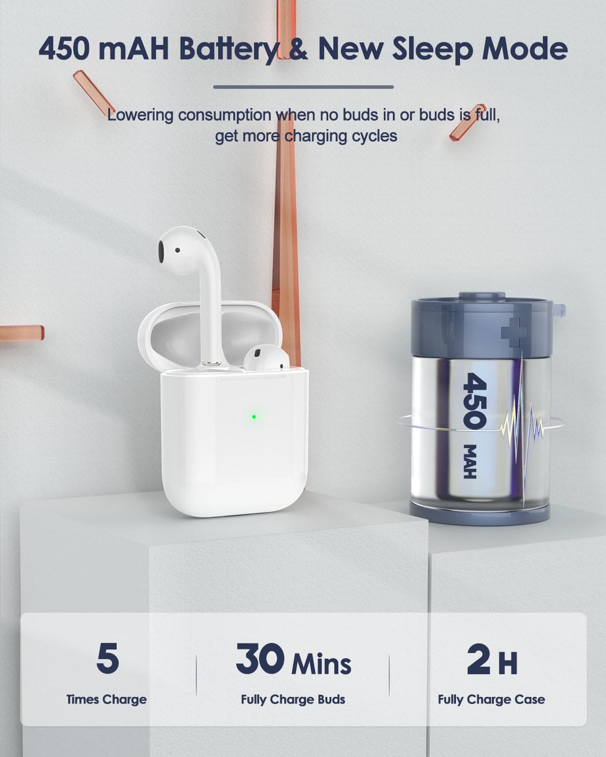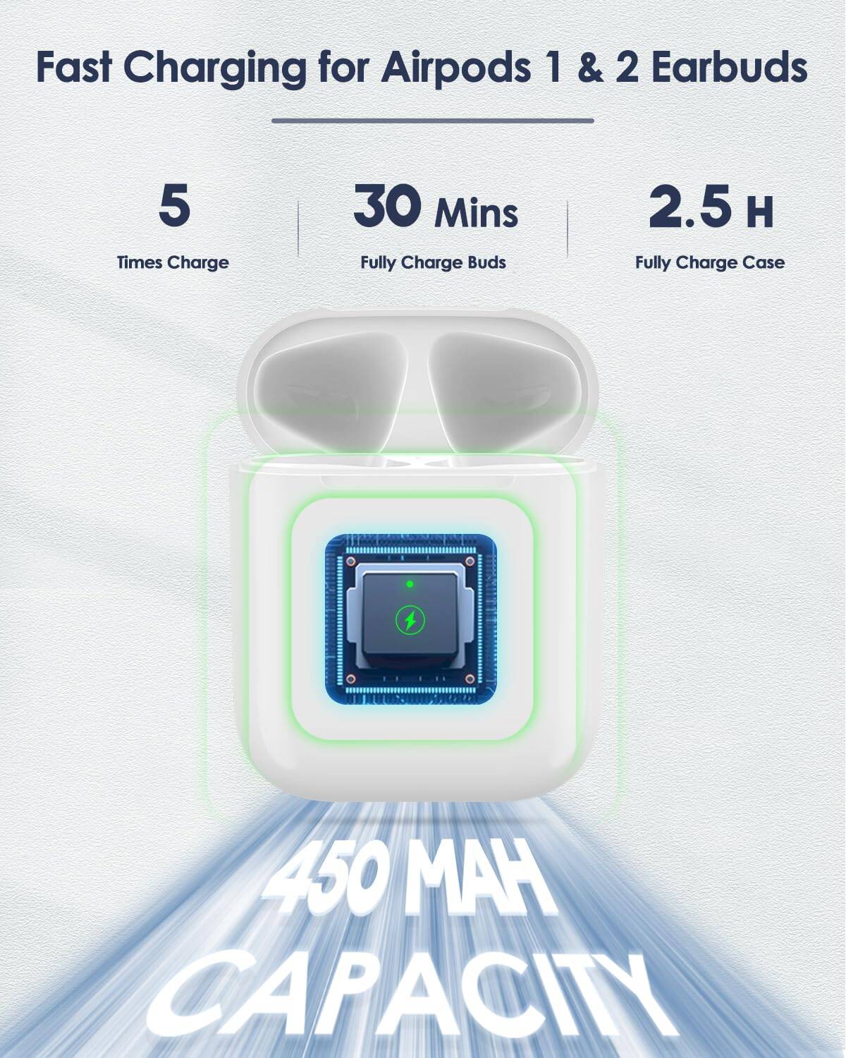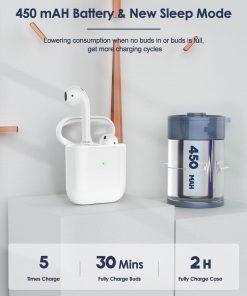2. Gran Batería y Carga Rápida: La capacidad de la batería del estuche de carga se ha mejorado a 450 mAh, lo que te puede proporcionar un día de uso. Los auriculares pueden cargarse completamente en solo 20 minutos, y el estuche puede cargarse completamente en solo 2.5 horas. La gran batería y la carga rápida te permiten sumergirte en el mundo de la música a tu gusto.