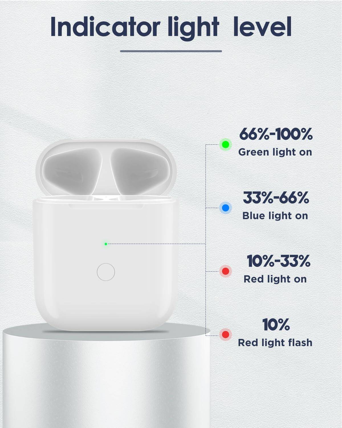 3. Luz Indicadora: El estuche de carga está equipado con una luz indicadora de energía. Puedes determinar fácilmente el nivel de carga del estuche a través del estado de la luz indicadora.