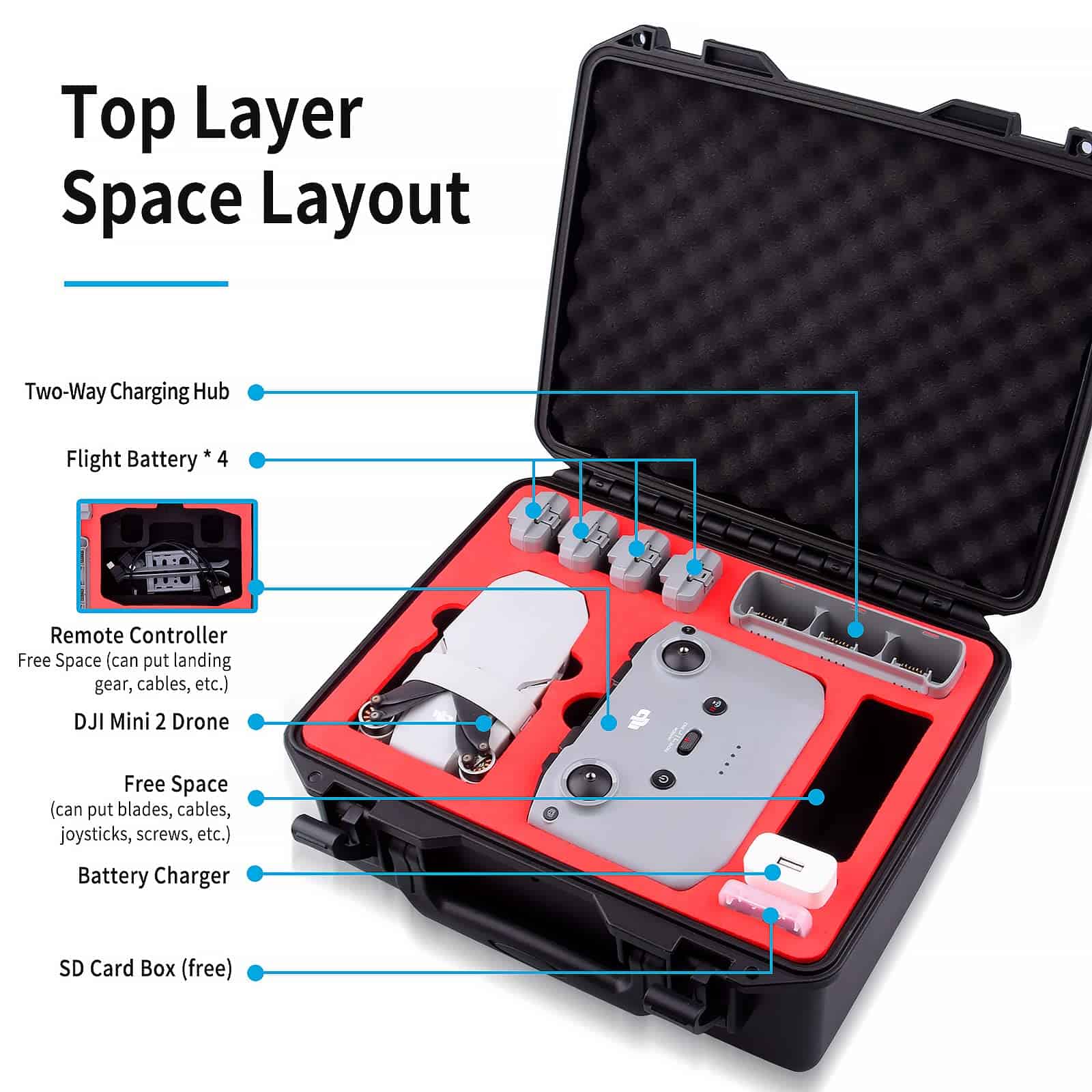 Estuche de doble capa FPVtosky DJI Mini 4K, Estuche DJI Mini 2 SE, Estuche impermeable Mavic Mini 2 Estuche rígido para DJI Mini 4K/ Mini 2 SE Drone y accesorios DJI Mini 2 SE [SOLO ESTUCHE]. Este estuche DJI Mini 4K/Mini 2 SE/ Mini 2 adopta un diseño de doble capa y un diseño espacial extremo. Puede acomodar casi todos sus accesorios comúnmente utilizados de DJI Mini 4K/Mini 2 SE/ Mini 2 SE. La capa superior puede contener el drone dji mini 2, control remoto, cargador y 8 baterías (incluye la batería del drone), hélices, cables de datos, etc. El amplio espacio en la capa inferior puede acomodar la plataforma de aterrizaje, iPad, soporte para tablet, protector solar, etc. El control remoto no necesita desmontar el joystick. El drone y el control remoto reservan espacio para los dedos, lo que es conveniente para meter y sacar. La carcasa del estuche Mavic Mini 4K/Mini 2 SE/ Mini 2 está hecha de plásticos de ingeniería resistentes, que son resistentes a los golpes, robustos e IP67 a prueba de polvo y agua. La cubierta interior es una capa completa de esponja ondulada y un espacio personalizado de material EVA para proporcionar una protección integral para su drone y accesorios DJI Mini 4K/Mini 2 SE/ Mini 2. Peso de tamaño de viaje: 3.42 libras, dimensiones externas: 12.21 x 10.04 x 5.32 pulgadas. El tamaño del estuche impermeable DJI Mini 4K/Mini 2 SE/ Mini 2 le permite colocarlo en su mochila o equipaje, ideal para viajar o almacenar en casa. Lo que obtienes: 1 estuche FPVtosky DJI Mini 4K/Mini 2 SE/ Mini 2, 1 caja para tarjetas SD y un servicio de posventa de calidad de por vida, ¡si tienes alguna pregunta, contáctanos!