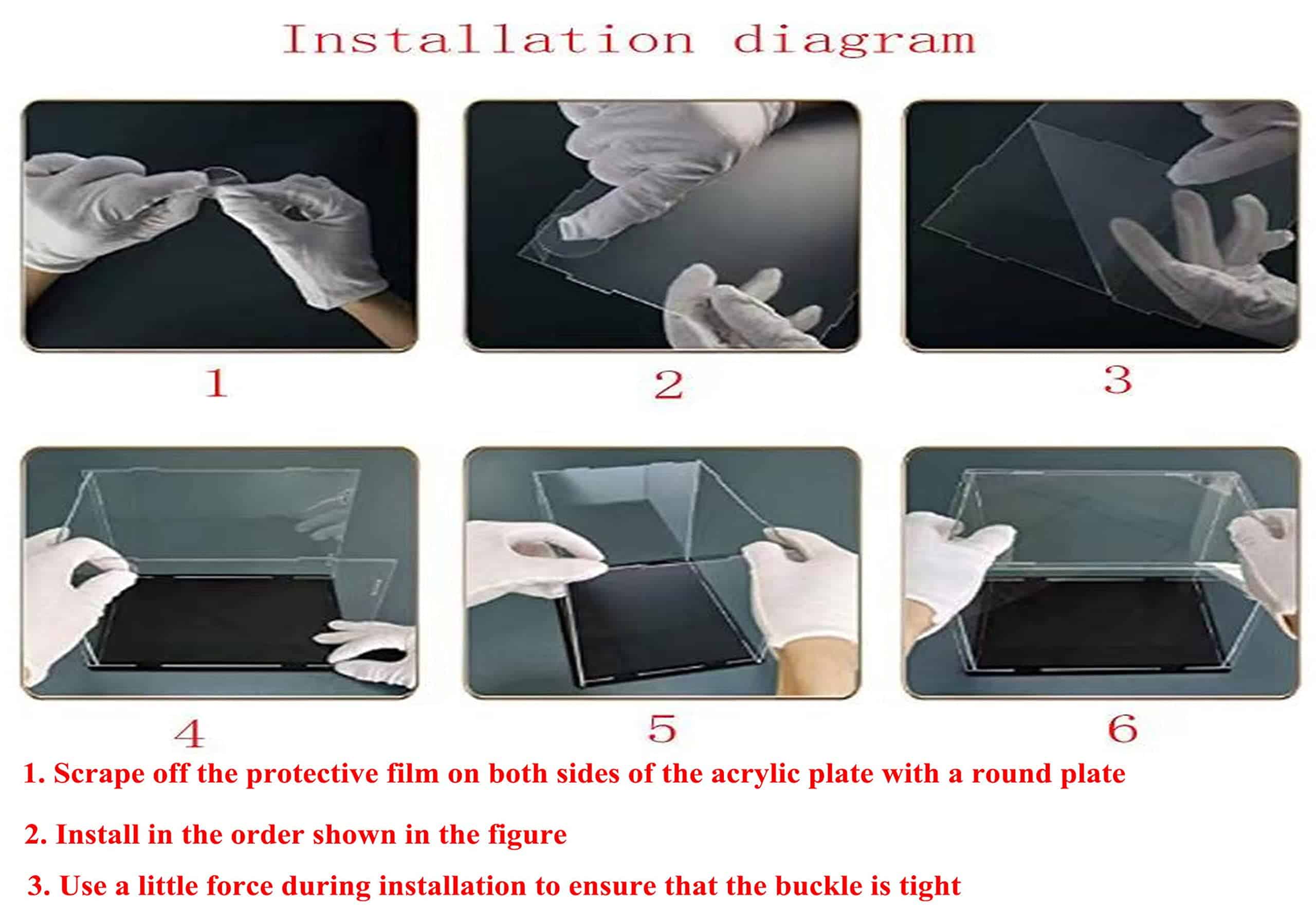 1. El artículo es tal como se muestra en la imagen 2. Por favor, elige según el tamaño del artículo 3. Ensámblalo de acuerdo con los pasos mostrados en la figura. Retira la película protectora de los dos lados 4. Consejo: Por favor, usa guantes antes de operar y ensamblar para proteger tus manos y evitar arañazos (se proporciona un par de guantes) 5. Este estuche de exhibición acrílico es adecuado para todo tipo de tus juguetes, muñecas, coleccionables, etc. 6. Buena transparencia y a prueba de polvo, es tu elección ideal.