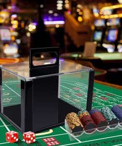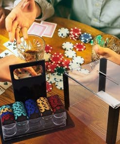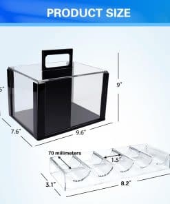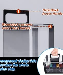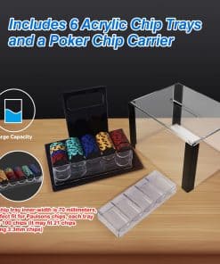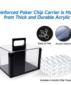Un transportador reforzado de fichas de póker está hecho de acrílico grueso y duradero con un asa de integración fuerte. Las dimensiones del transportador de fichas de póker de acrílico son 9,6 pulgadas de largo por 7,6 pulgadas de ancho por 8,5 pulgadas de alto. Contiene hasta 6 bandejas de fichas de 100 piezas cada una (cada bandeja de fichas contiene 100 fichas) que son apilables y tienen una capacidad de 600 fichas. Incluye 6 bandejas de fichas de acrílico y un transportador de fichas de póker. Las dimensiones de la bandeja de fichas son 8,2 pulgadas de largo por 3,1 pulgadas de ancho por 1,1 pulgadas de alto. El ancho interno es de 70 milímetros, un ajuste perfecto para cualquier grosor de fichas. Cada bandeja sostiene 100 fichas. (Puede contener hasta 21 fichas si se usan fichas de 3,3 mm. ¡Las fichas no están incluidas!). Ideal para el casino, club de póker, eventos, fiestas o noches de casino en casa!