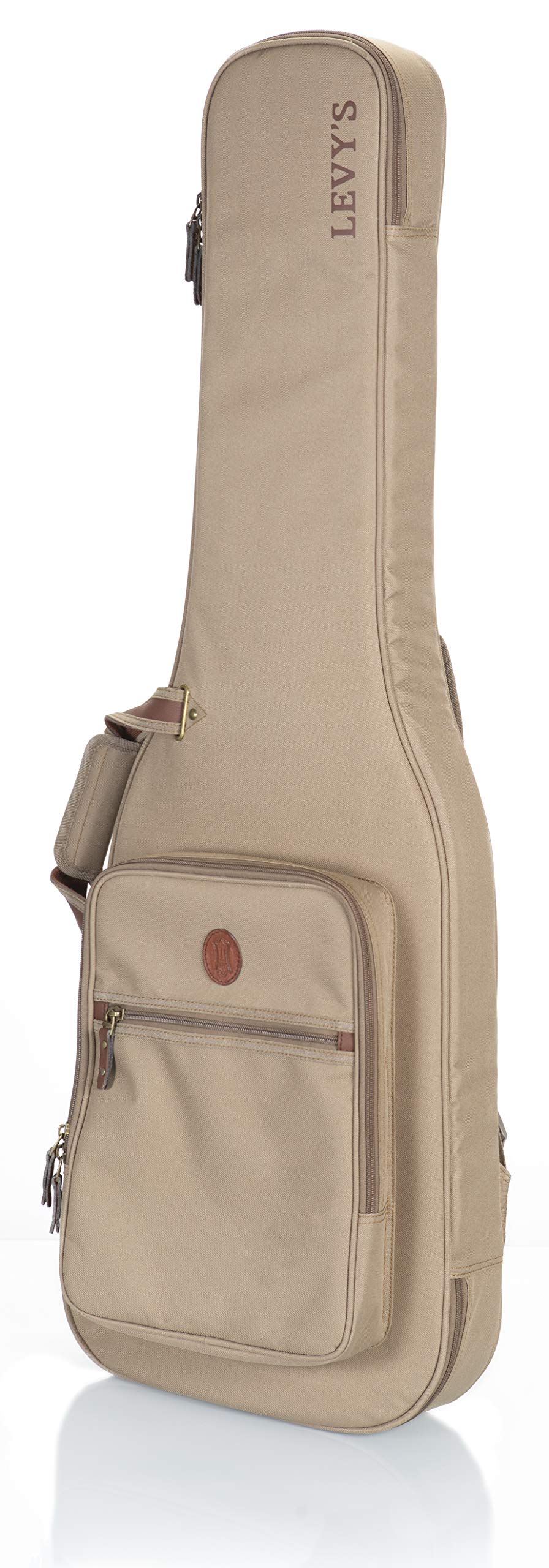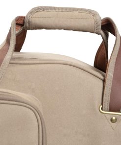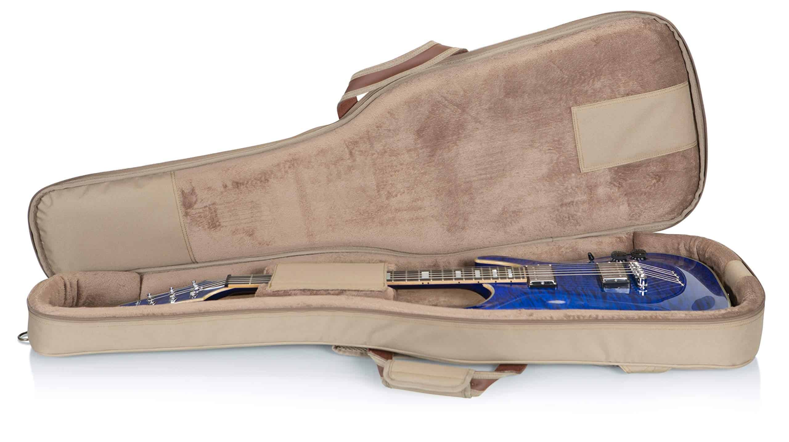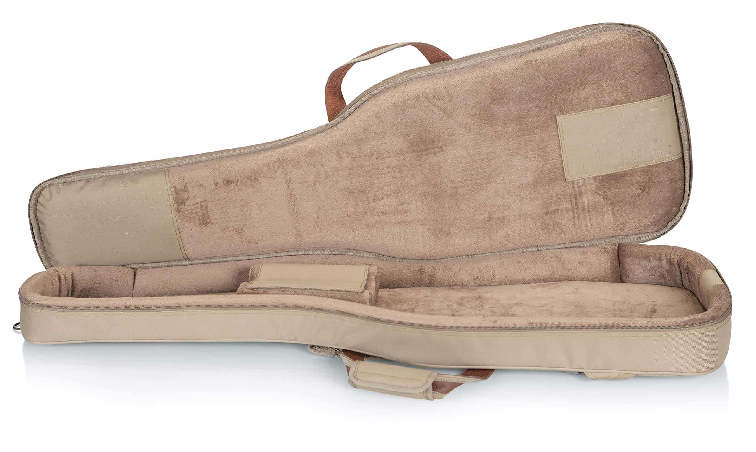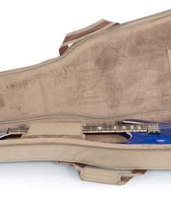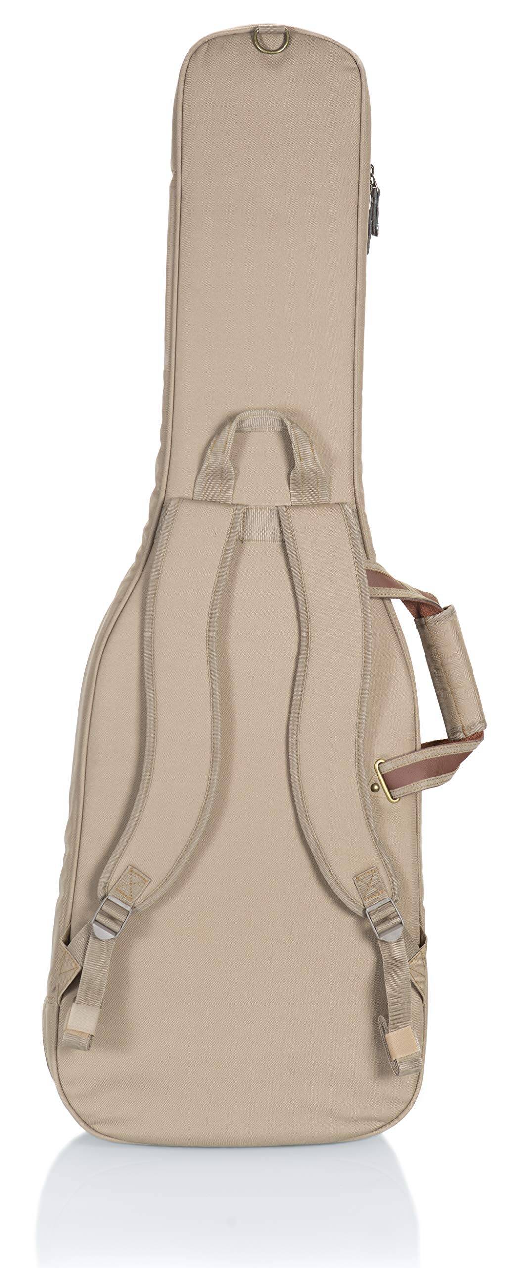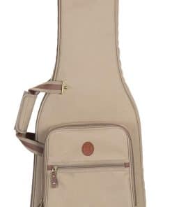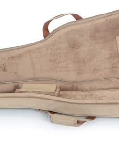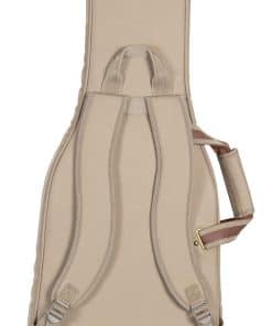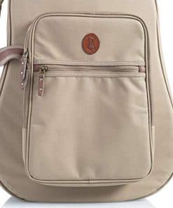 1. Construcción de tela de poliéster con exterior de color tan. 2. Correas de mochila acolchadas y ajustables, asa de transporte cómoda y asa de agarre. 3. Bolsillo grande con cremallera en el exterior con bolsillo reforzado en el interior y un bolsillo más pequeño en la parte delantera. 4. Cremalleras de metal envejecidas con tiradores de cuero, anillo en D trasero para enganchar accesorios. 5. Dimensiones interiores (específicas para el instrumento): 42.00 / 106.68 cm (longitud total) x 14.00 / 35.56 cm (fondo inferior) x 12.50 / 31.75 cm (fondo medio) x 11.25 / 28.58 cm (fondo superior) x 19.00 / 48.26 cm (longitud del cuerpo) x 2.25 / 5.72 cm (altura del cuerpo)