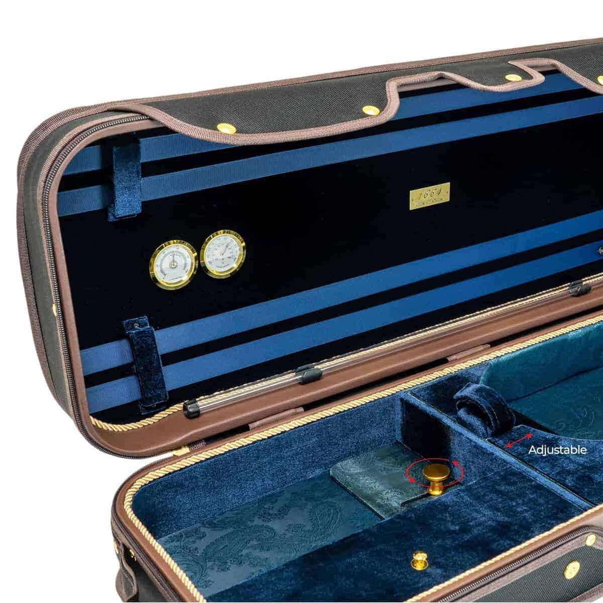 ESPECIFICACIONES: Tipo de Producto: Estuche de Viola Forma: Oblonga Material del Estuche: Construcción de madera dura Material Exterior: Nylon 600D oxford impermeable no abrasivo Material Interior: Lujoso forro de terciopelo y seda con suspensión, sujeción de cuello, amplio almacenamiento para accesorios Material de la Asa: Asa superior moldeada a medida y asa lateral de agarre de cuero 3 anillos traseros en D para facilitar el transporte | se convierte en mochila/transporte en el hombro 1 manta a prueba de polvo para instrumentos para una protección adicional 1 correas ajustables para llevar 4 Porta-arcos Colores: Azul / Verde Peso del Producto: 8.9 libras Dimensiones: 32″ L x 6″ W x 11.5″ H CONTENIDO DEL PAQUETE: 1x estuche doble de violín de madera dura oblongo 1x cobertura de manta suave 1x correas de transporte ajustables