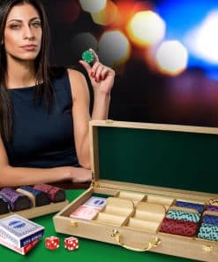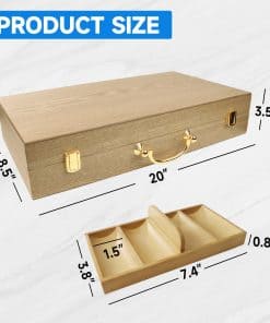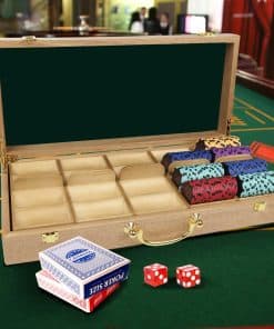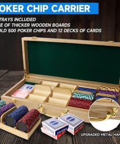 Nuestro Estuche de Fichas de Póker Premium de Madera Maciza está hecho de Roble duradero lo que lo hace lo suficientemente resistente como para durar mucho tiempo pero aún así verse tremendo durante años. El interior del estuche tiene un interior de terciopelo verde que amortiguará las bandejas de fichas y también dará al estuche un aspecto clásico. El estuche para fichas tiene cinco bandejas de madera que contienen un total de 500 fichas de póker (100 por bandeja). Debajo de las rejillas, hay suficiente espacio de almacenamiento para 12 barajas de cartas. El estuche viene con bisagras y cierres pintados de oro para garantizar que la apertura y el cierre sean lo más suaves posible mientras se ve genial. El estuche para fichas tiene una asa para facilitar su transporte. ¡Nuestro Estuche de Fichas de Póker Premium de Madera Maciza es ideal para un casino, club de póker, eventos, fiestas o noches de casino en casa! ¡Estuche de Fichas de Póker Premium de Madera Maciza SOLAMENTE
