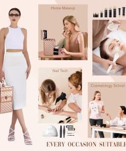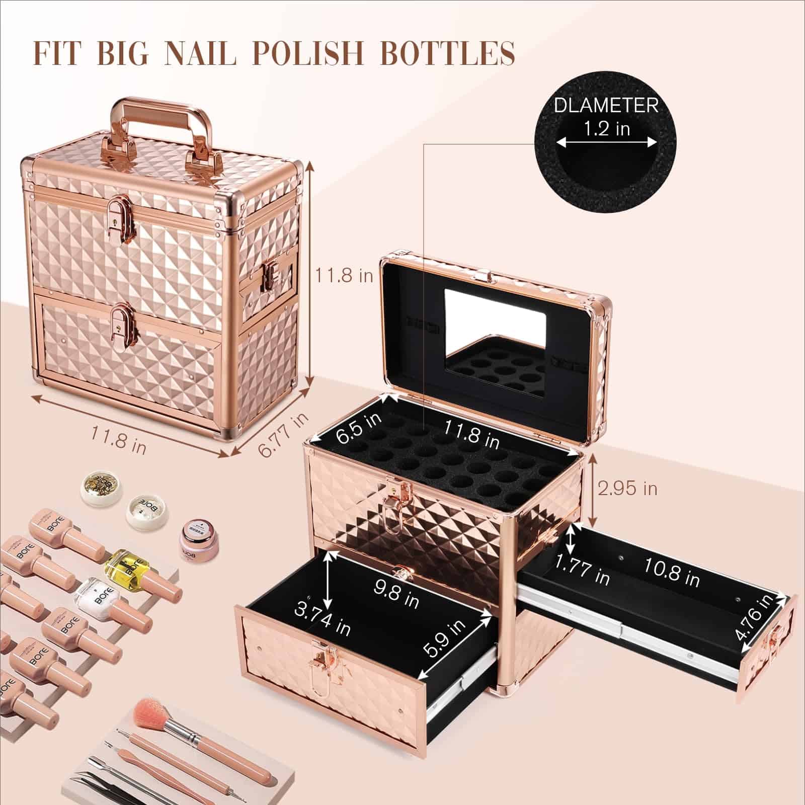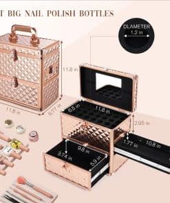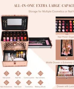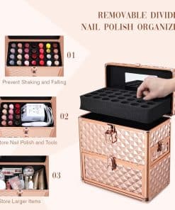 Caja de maquillaje con separador de esponja de bricolaje, cajón intermedio deslizable, espejo y compartimento elástico para uñas, cerradura con llave, ideal para regalar a tu amante: estuche organizador de maquillaje con diseño en color oro rosa. Estructurado con una esponja extraíble de bricolaje que consta de 28 compartimentos para almacenar y clasificar esmalte de uñas, secador de uñas y cosméticos. La bandeja deslizable central sin cerradura almacena pinceles de maquillaje largos y accesorios de diferentes tamaños. El cajón deslizable con mango se puede enganchar para evitar que se deslice cuando no se usa. Incluye un espejo y un compartimento elástico para una mayor conveniencia de maquillaje. La cerradura con llave protege la privacidad y seguridad de tus kit de uñas y cosméticos en los viajes. La cerradura de metal anti-óxido es fácil de manipular. Regalo perfecto para tu amante: un tronco de carrito de maquillaje elegante para mantener tu tocador limpio y ordenado, ideal para profesionales del maquillaje, manicuristas, estilistas, esteticistas, manicuristas, tatueras, o personas con abundante cosméticos.