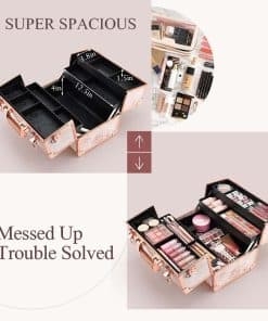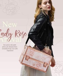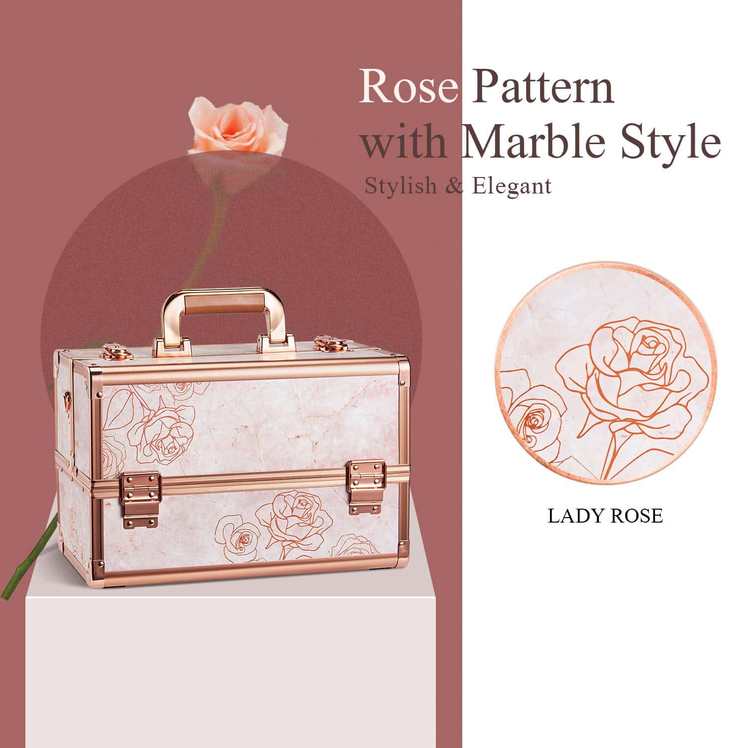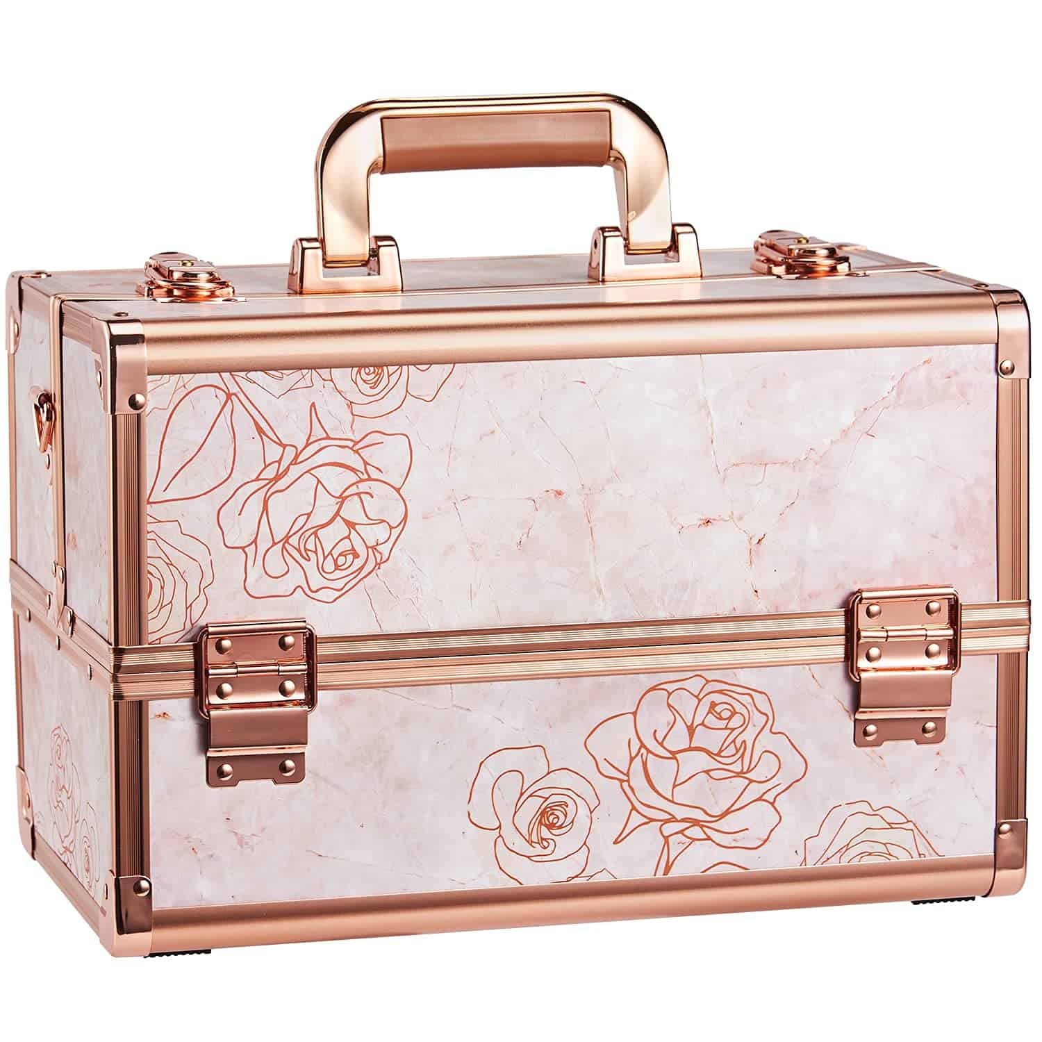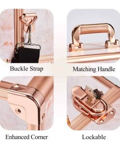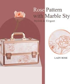 1. Hermoso estilo de mármol rosa dorado: Este gran estuche de maquillaje viene en estilo de mármol rosa dorado con todas las partes de aluminio a juego con el color que se mantiene en sintonía con un asa especialmente diseñada para dar una apariencia única.
