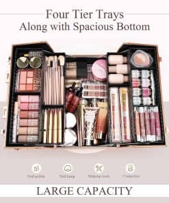 5. Portátil y con cerradura: Este estuche de maquillaje de Joligrace es conveniente para viajar con un asa grande antideslizante y la duradera correa para el hombro. También es bloqueable con llave para privacidad y seguridad. Tamaño: 13.5 pulgadas x 9 pulgadas x 8.5 pulgadas.