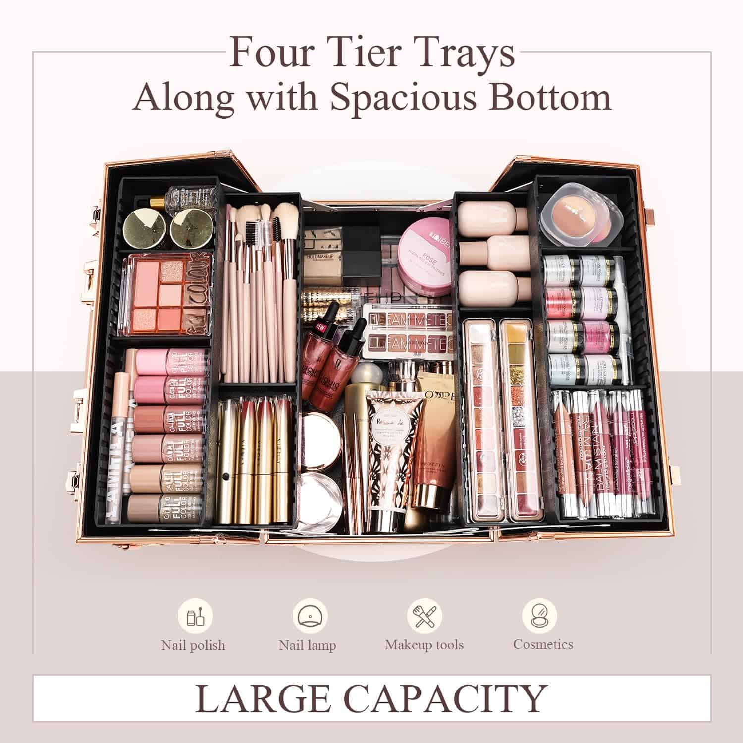 4. Portátil y con cerradura: Este estuche de maquillaje de Joligrace es conveniente para viajar con un asa grande antideslizante y la duradera correa para el hombro. También es bloqueable con llave para privacidad y seguridad.