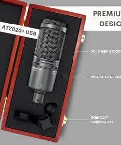 Haz que tu Audio Technica AT2020 luzca y se sienta profesional con este Estuche de Micrófono de Madera para AT2020. Hecho de madera de abedul sólido y diseñado con precisión para evitar arañazos, abolladuras, polvo y humedad, el estuche protector garantiza que tu micrófono se mantenga seguro y protegido sin comprometer la calidad del sonido. El micrófono Audio Technica AT2020USB es una elección popular entre los profesionales que buscan audio cristalino en sus grabaciones. Ya sea que estés creando un podcast o mezclando música, necesitas una solución de almacenamiento confiable que no te defraude. Con su construcción de madera superior y diseño específicamente creado para micrófonos Audio Technica, este estuche de madera resistirá la prueba del tiempo mientras te brinda una fácil portabilidad para llevar tu equipo de grabación donde lo necesites. El diseño ligero pero robusto proporciona una protección superior contra el desgaste diario mientras que la sensación táctil de la madera natural agrega un toque estético para asegurarte de que tu micrófono se vea tan bien como suena. Está diseñado con espuma interna de polietileno para garantizar que tu equipo se mantenga a la temperatura óptima y también sirve como un escudo eficaz contra el polvo y la humedad, perfecto para grabar en entornos variables. Eleva tu juego de audio con el Estuche de Micrófono de Madera para el micrófono AT2020 de Audio Technica!