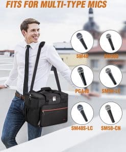 1. Protección Acolchada Segura: ¿Preocupado por que sus valiosos micrófonos se dañen El estuche de micrófono musbeat cuenta con un acolchado interior grueso para sostener los micrófonos dinámicos estándar o micrófonos inalámbricos de escenario de forma segura como una nube acariciando a un recién nacido. Cuando se cierra la cremallera, la construcción sólida garantizaría que los micrófonos se mantengan firmemente en su lugar y no reboten en el estuche de almacenamiento de micrófonos. 2. 8+ Bolsillos para Micrófonos y Cables: Para adaptarse tanto a micrófonos con cable como a accesorios de micrófonos inalámbricos, diseñamos tantos bolsillos como fue posible. Hay bolsillos de malla con cremallera en la tapa para evitar que los objetos caigan. La bolsa frontal con cremallera separada tiene más que suficiente espacio para sus clips de soporte para micrófono y cargador. Hay 2 bolsillos laterales de la bolsa de transporte de micrófono para púas de guitarra, grabadora portátil y cables. El compartimento interior frontal de malla también podría contener una mezcladora compacta y un pequeño DI box. 3. Compatible con Micrófonos con Cable e Inalámbricos: Si estás buscando un estuche en comparación con otros estuches de micrófono que solo son adecuados para un tipo de micrófono, este estuche organizador de micrófono está especialmente diseñado para micrófonos vocales con cable corto como el SM58, y también para micrófonos inalámbricos más largos, o micrófonos vocales de condensador estándar como el Beta 87A, la tapa acolchada suave se puede expandir para adaptarse incluso a micrófonos de tamaño cuadrado no estándar como el e609. 4. Cómo inflar la espuma: Recomendamos 3 métodos para restaurar la esponja: 1. Si no tienes prisa, la mejor manera es dejar que recupere naturalmente su forma durante un período de 48 horas. 2. También puedes usar un secador de pelo en una temperatura y velocidad más alta para inflarlo. 3. Otra opción es colocarlo en la secadora en el ciclo «esponjoso» junto con un par de bolas de secado para ayudar a expandirlo. Si hay algún problema por favor avísanos, estaremos encantados de estar disponibles 24/7 para ayudarte. 5. 3 Formas de Transporte: ¿Difícil encontrar un estuche de micrófonos portátil para viajes Este estuche de micrófonos sería una excelente elección para uso móvil ligero, especialmente perfecto para las personas que participan en podcasting, eventos de iglesia, espectáculos de karaoke y viajes por carretera. Viene con un asa acolchada, que permite llevarlo con una mano y una correa ajustable para el hombro con acolchado para aliviar la presión en el hombro. También cuenta con una correa para equipaje en la parte trasera, lo que permite fijar de forma segura el estuche al maletín rodante para liberar las manos.