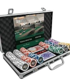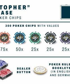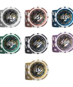 El estuche de póker Bullets Playing Cards es un set completo para una experiencia de juego mejorada, perfecto tanto para entusiastas del póker como principiantes. También se incluyen un botón de repartidor de cerámica, dos barajas de cartas de póker de plástico Bullets, 5 dados y reglas de póker. Las fichas tienen un diámetro de 4 cm. Este set es un regalo ideal para cualquier reunión informal o evento social recreativo.
