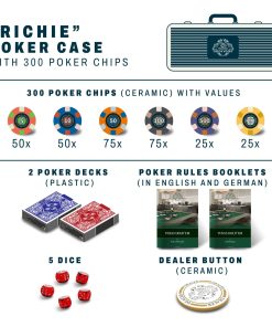 Obtenga la verdadera atmósfera del casino en casa. Quién no conoce el típico sonido de una ficha de cerámica Con nuestras fichas de poker «Richie» también obtienes la sensación adecuada. Las fichas se pueden apilar maravillosamente y agarrar perfectamente gracias a su superficie especial.