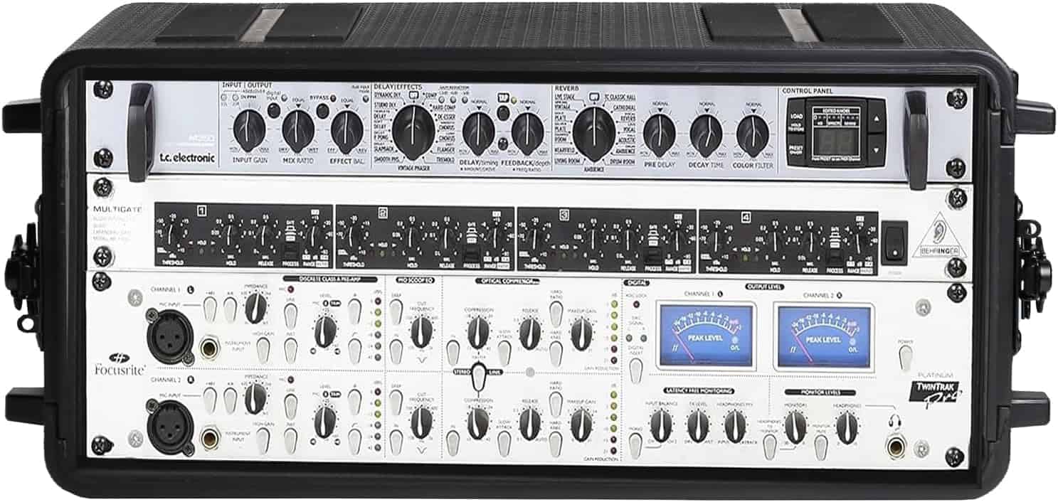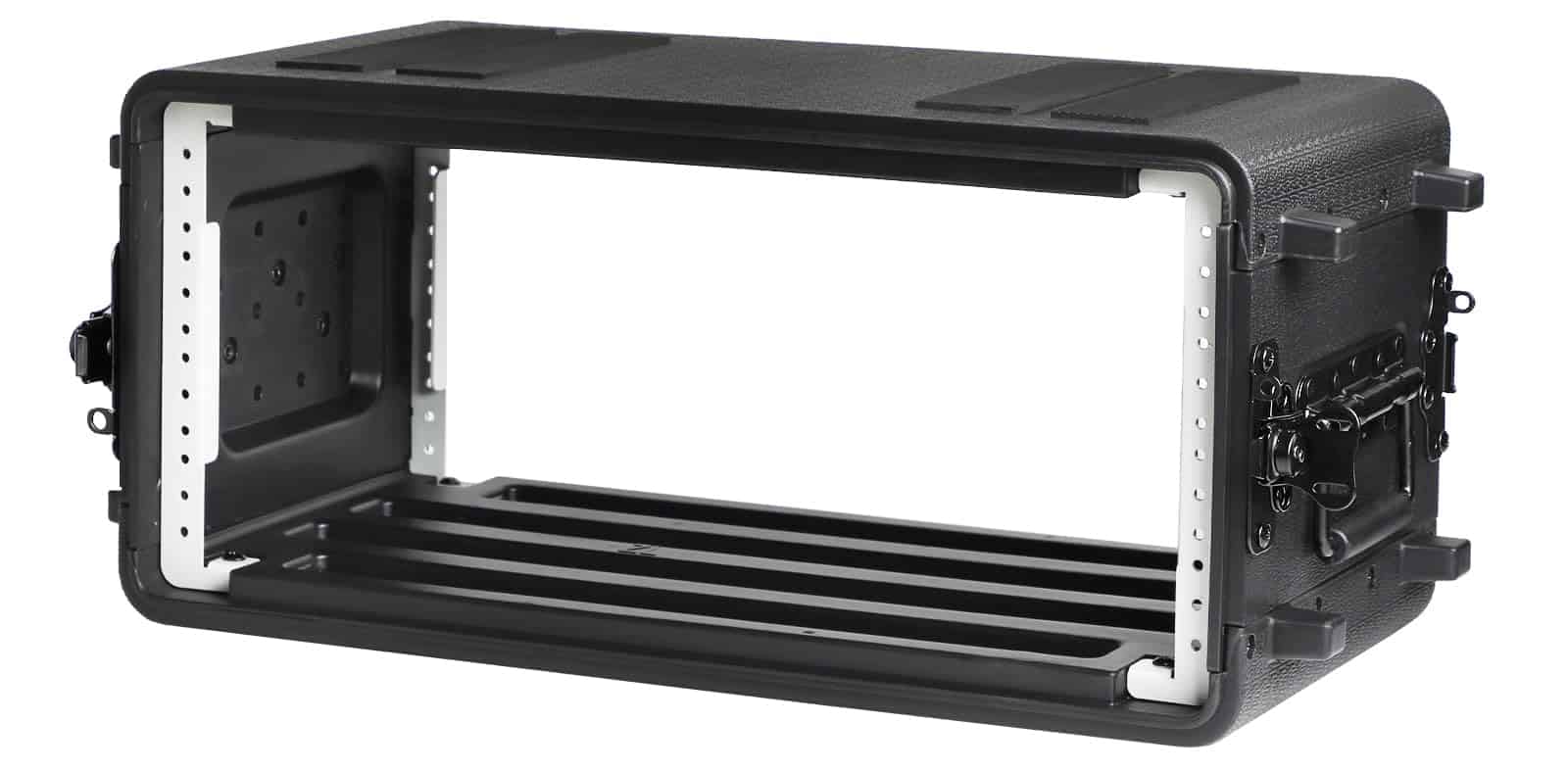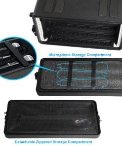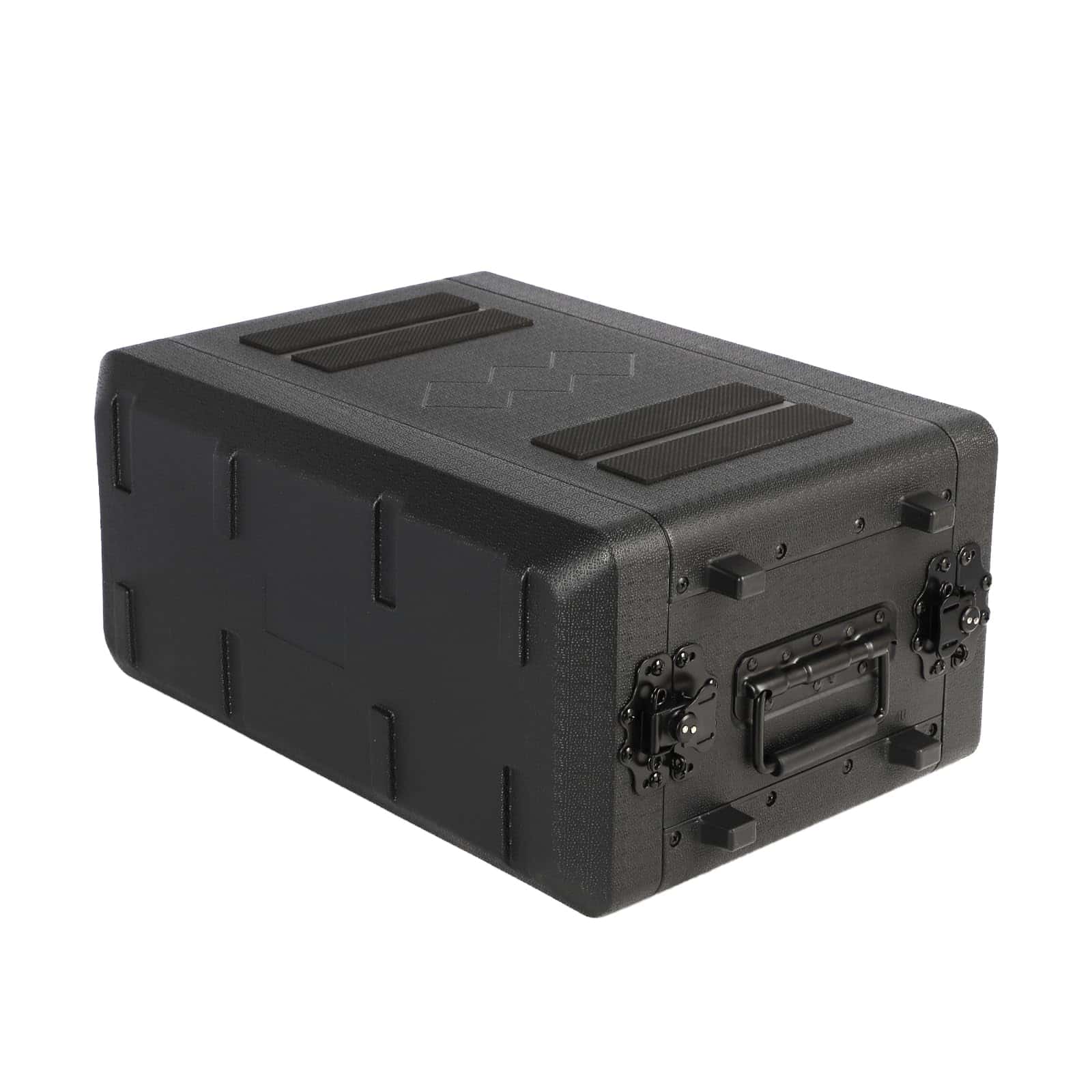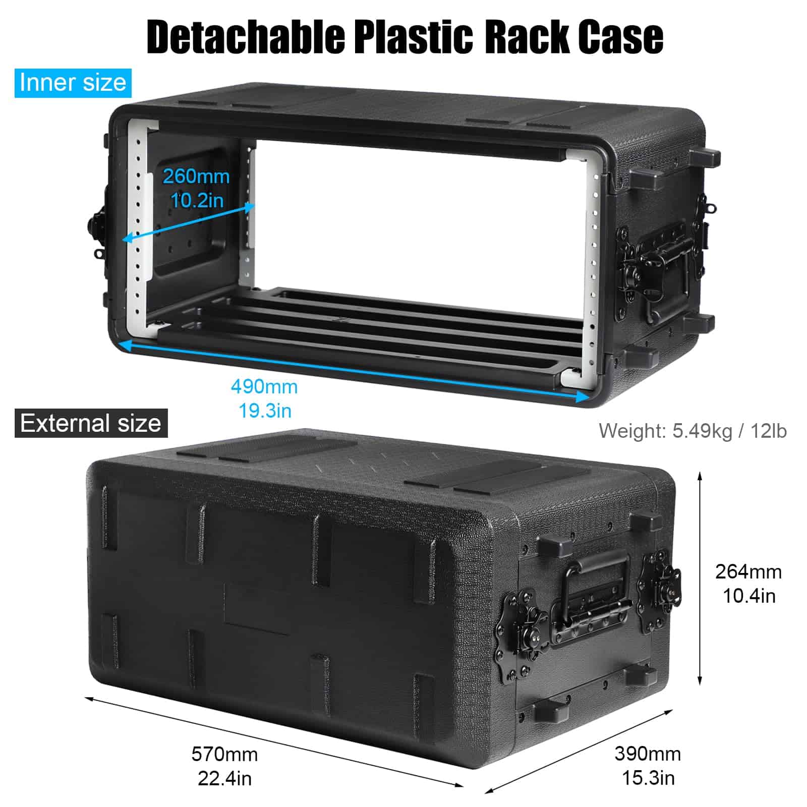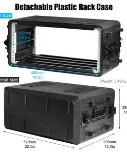 Estuche de Rack de plástico desmontable de 19″ de 4U con una profundidad de 260 mm (10.23″). Tamaño interior: 500 x 260 x 181 mm. Tamaño exterior: 570 x 390 x 264 mm. Peso: 5.49 kg. Diseñado para proteger equipos estándar de montaje en rack de 19″, como ecualizadores, amplificadores, altavoces, consolas de sonido, mezcladores, máquinas de efectos y servidores de computadora. Ofrece una protección completa para tus equipos valiosos.