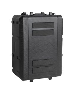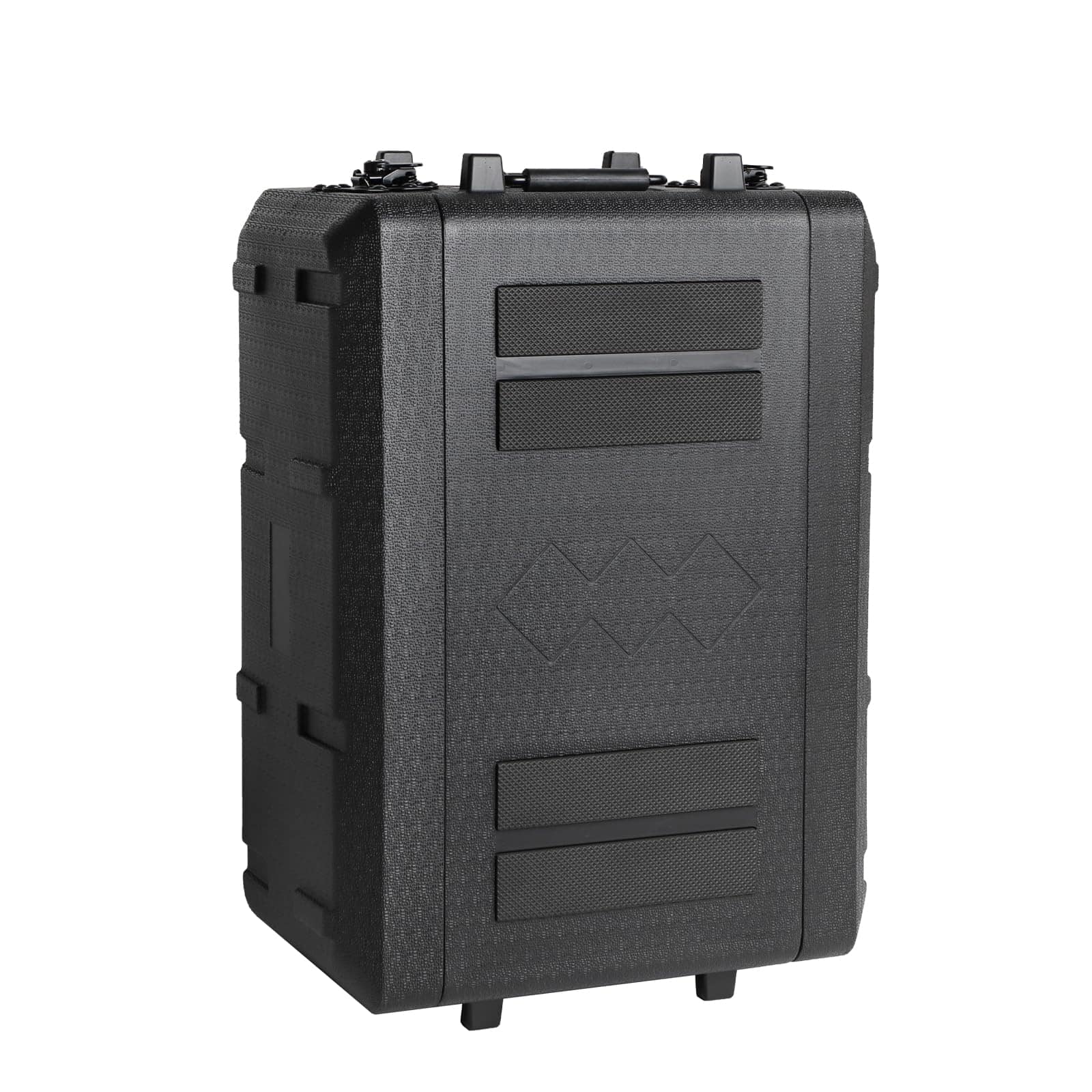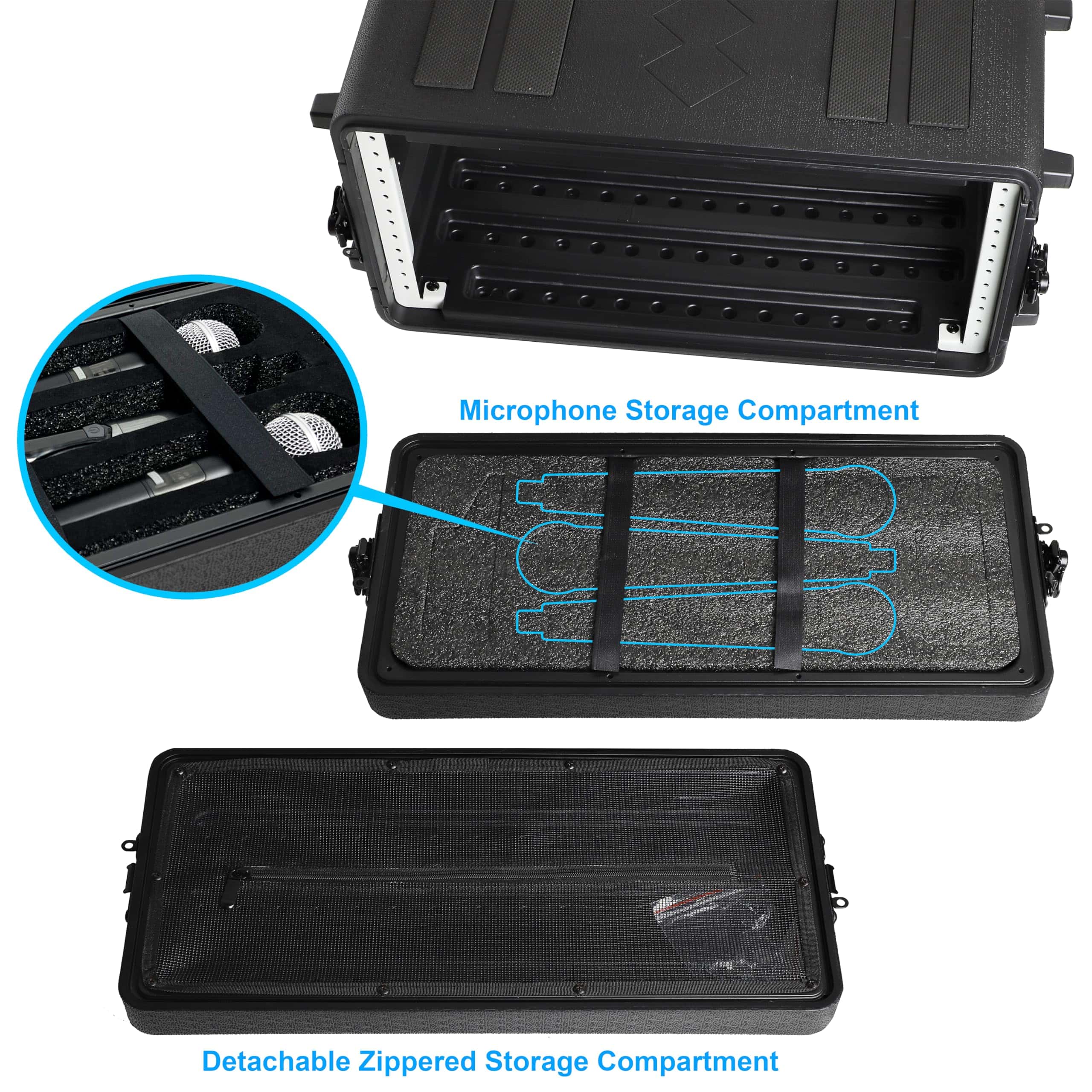 Estuche de Rack de 4U con diseño exclusivo y robusto, a prueba de agua, a prueba de polvo y resistente a impactos. Composición de polietileno de alta densidad (HDPE) que proporciona una excelente resistencia al impacto. El estuche es resistente a los rayos UV y a prueba de golpes. Incluye puertas delanteras y traseras, diseño apilable de fácil configuración, espacio de almacenamiento integrado para micrófonos y asa ergonómica cubierta de goma. Cuatro agujeros para candados de 6 mm para protección contra robos.