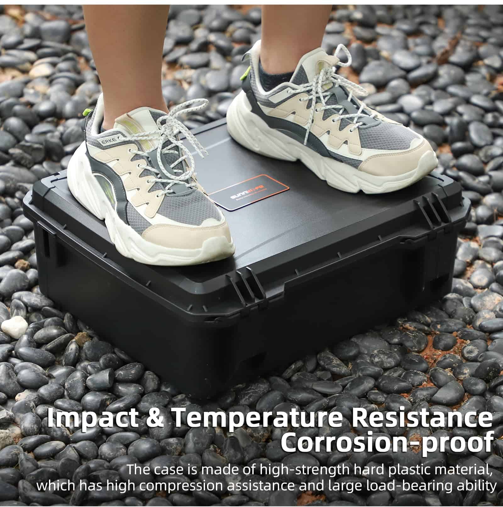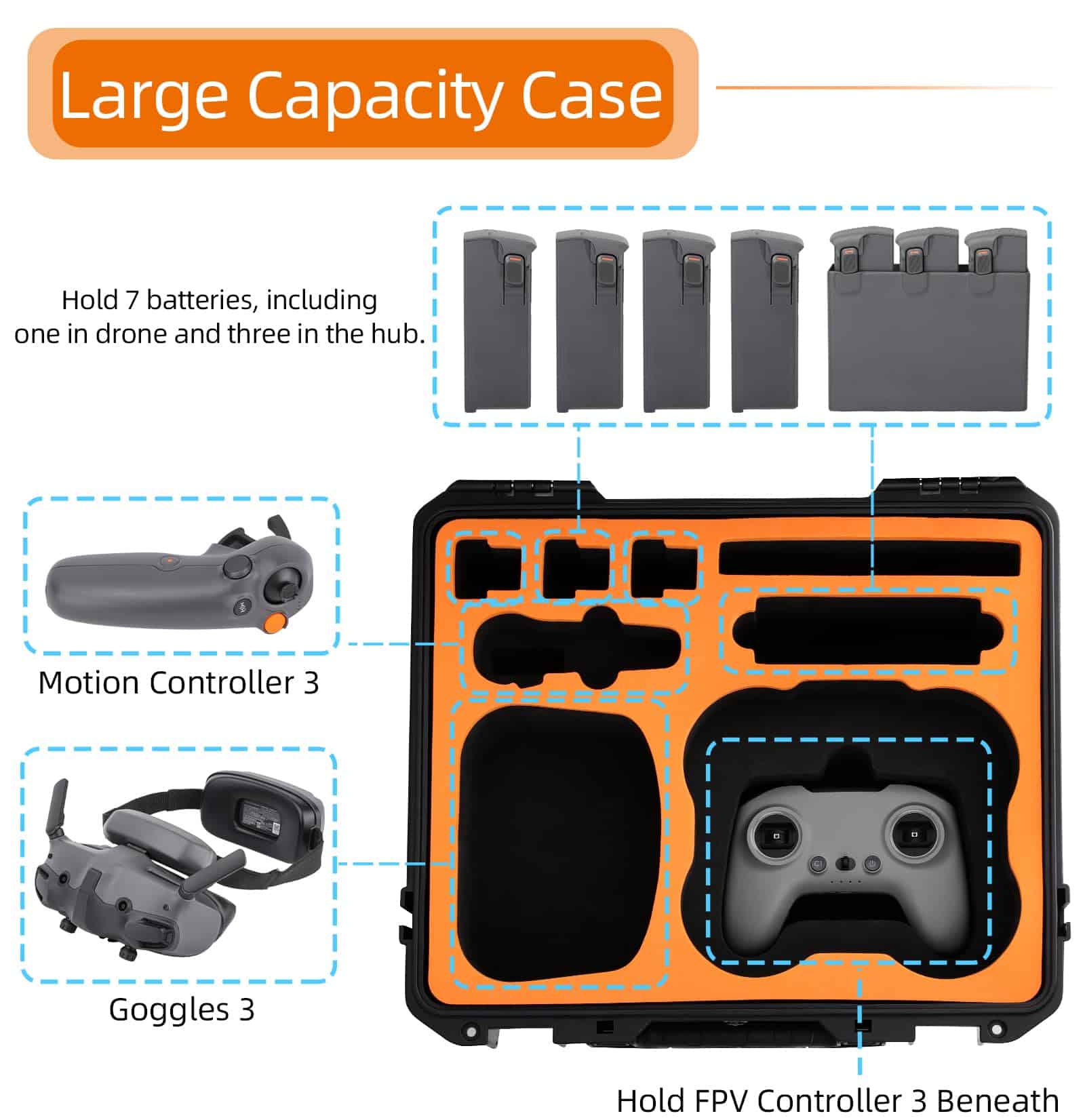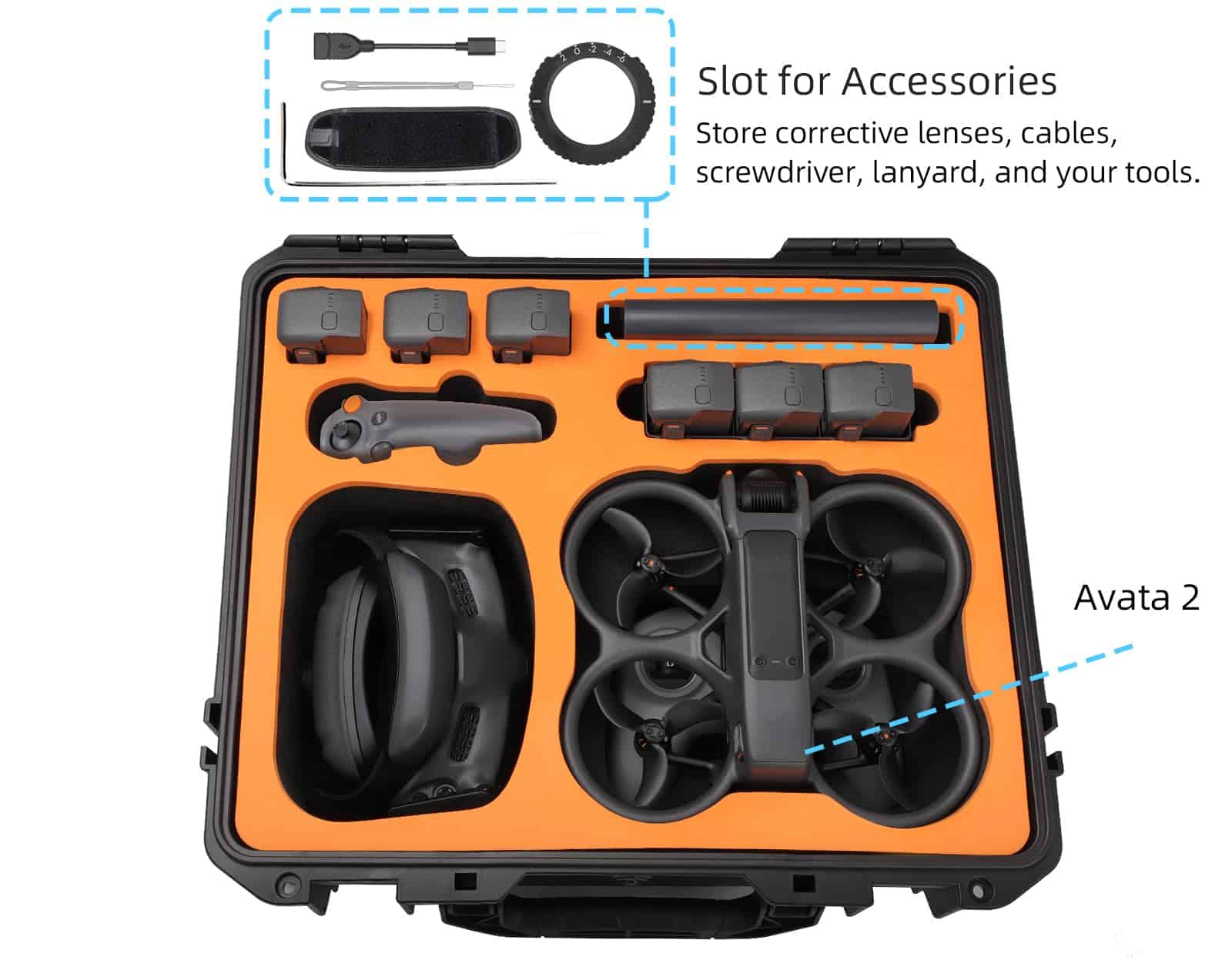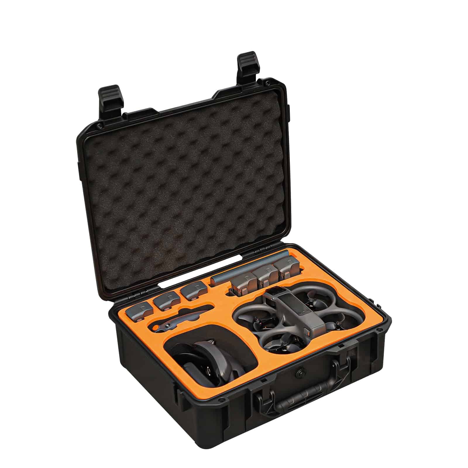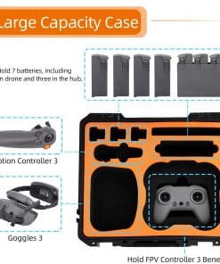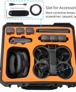 Estuche de transporte resistente al agua especialmente diseñado para los accesorios del DJI Avata 2 Fly More Combo. Capacidad para contener el drone DJI Avata 2, DJI RC Motion 3, DJI Goggles 3, DJI FPV Remote Controller 3, 7 baterías en total, un administrador de carga y varios accesorios y herramientas. La carcasa resistente a impactos protege el equipo de arañazos y suciedad, manteniéndolo en óptimas condiciones. Impermeable y a prueba de salpicaduras con un sellado excelente para evitar la entrada de agua, humedad, polvo y suciedad. El soporte interno absorbe golpes de alta gama asegura un almacenamiento seguro.