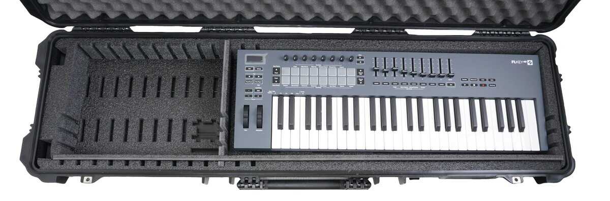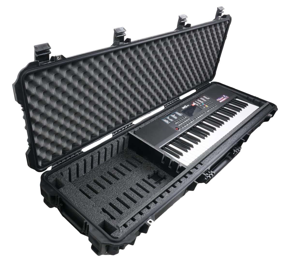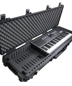 Estuche de Teclado de 61-76 Notas de Case Club es perfecto para el músico viajero! El estuche protege teclados DE HASTA 47.5″ L x 11.8″ W x 3.25″ H, y es ideal para almacenamiento, viajes e incluso envíos!. Los separadores de plástico ajustables con refuerzo permiten al usuario ajustar perfectamente su teclado, al mismo tiempo que liberan el espacio máximo para accesorios adicionales. El foam es no abrasivo, absorbente de impactos, de larga duración, polietileno de celda cerrada. Este caso fue diseñado para superar con creces a la competencia y ser el siguiente nivel en protección, organización, almacenamiento y transporte. Protege tu instrumento, ¡compra Case Club!