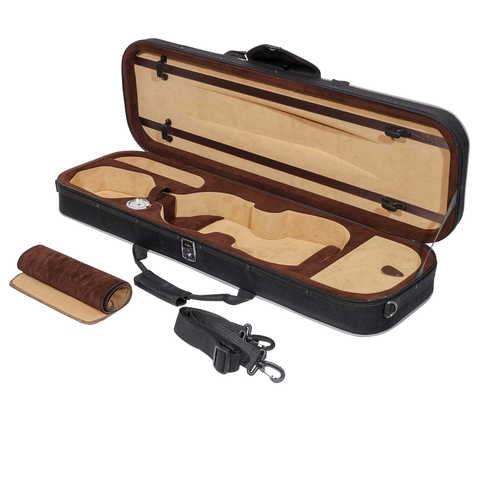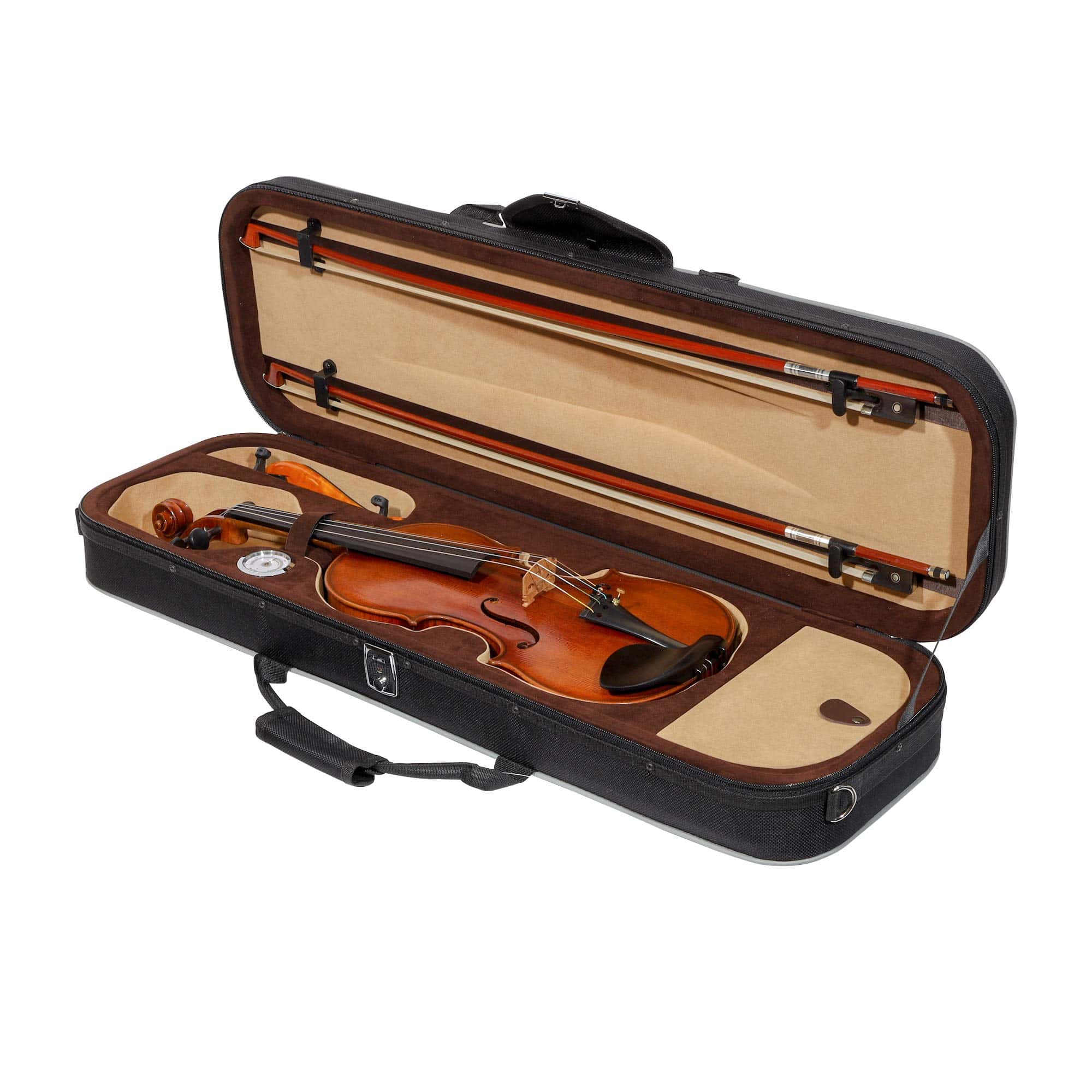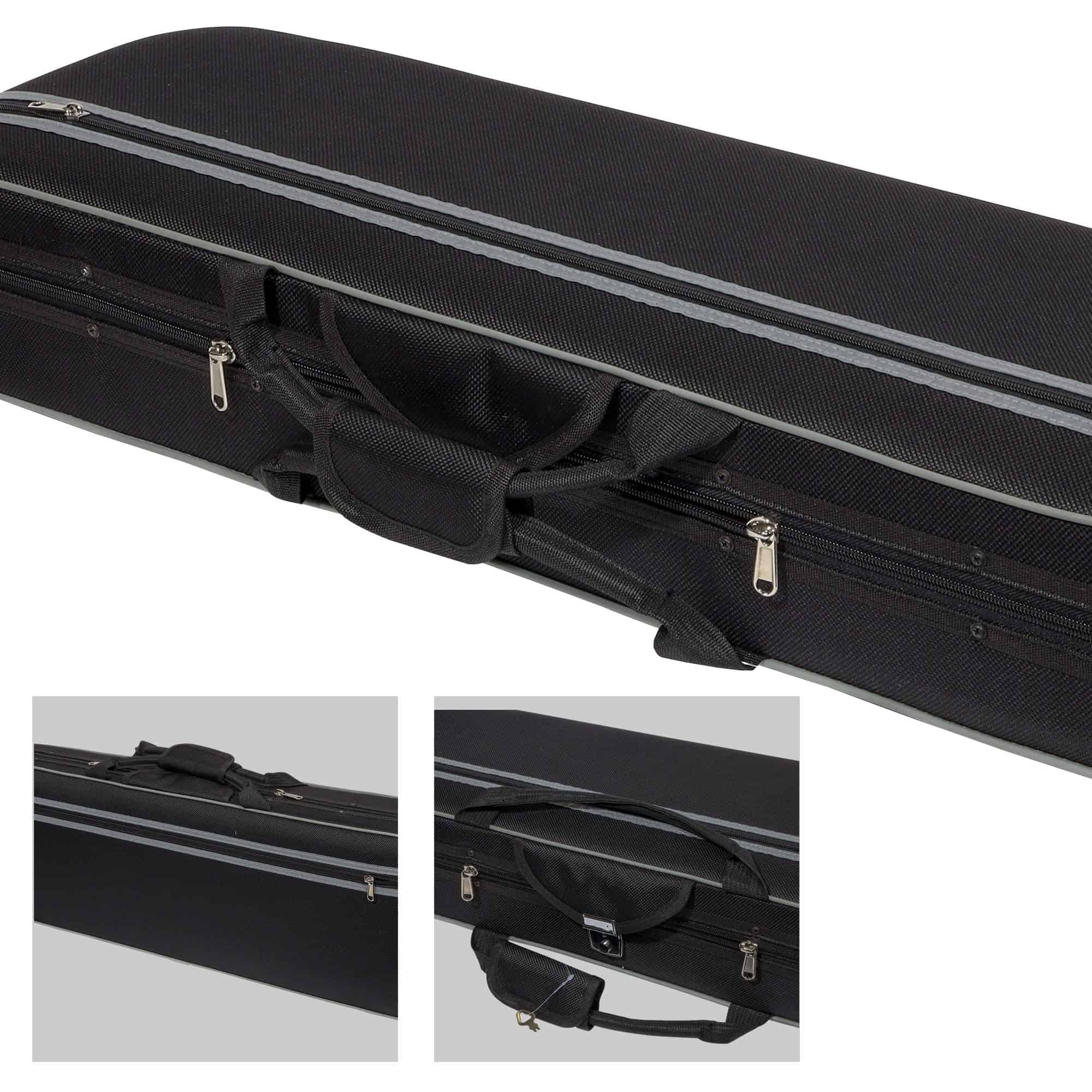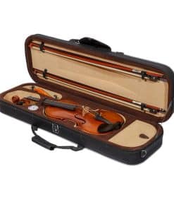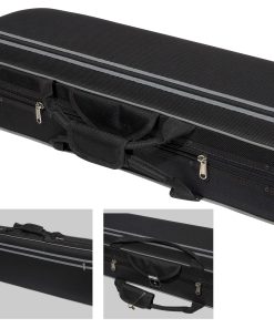 ESPECIFICACIONES: Tipo de Producto: Estuche de Violín Forma: Triangular Tamaño: 4/4 Tamaño Completo Material del Estuche: Espuma de poliuretano de alta densidad Material Exterior: Nylon Oxford 600D no abrasivo Material Interior: Lujoso forro de terciopelo negro con suspensiones, restricción de cuello, amplio almacenamiento de accesorios Material de la Manija: Asas de agarre de plástico moldeado a medida 3 Anillos en D traseros para un fácil transporte | se convierte en mochila / llevado en el hombro 1 Mantita a prueba de polvo para el instrumento 2 Correas de hombro ajustables 2 Soportes de arco Peso: 3.5 lbs Dimensiones Totales: 33 L x 13 W x 5 D CONTENIDO DEL PAQUETE: 1x estuche rígido de espuma triangular para violín 1x cubierta de manta suave 2x correas de transporte ajustables