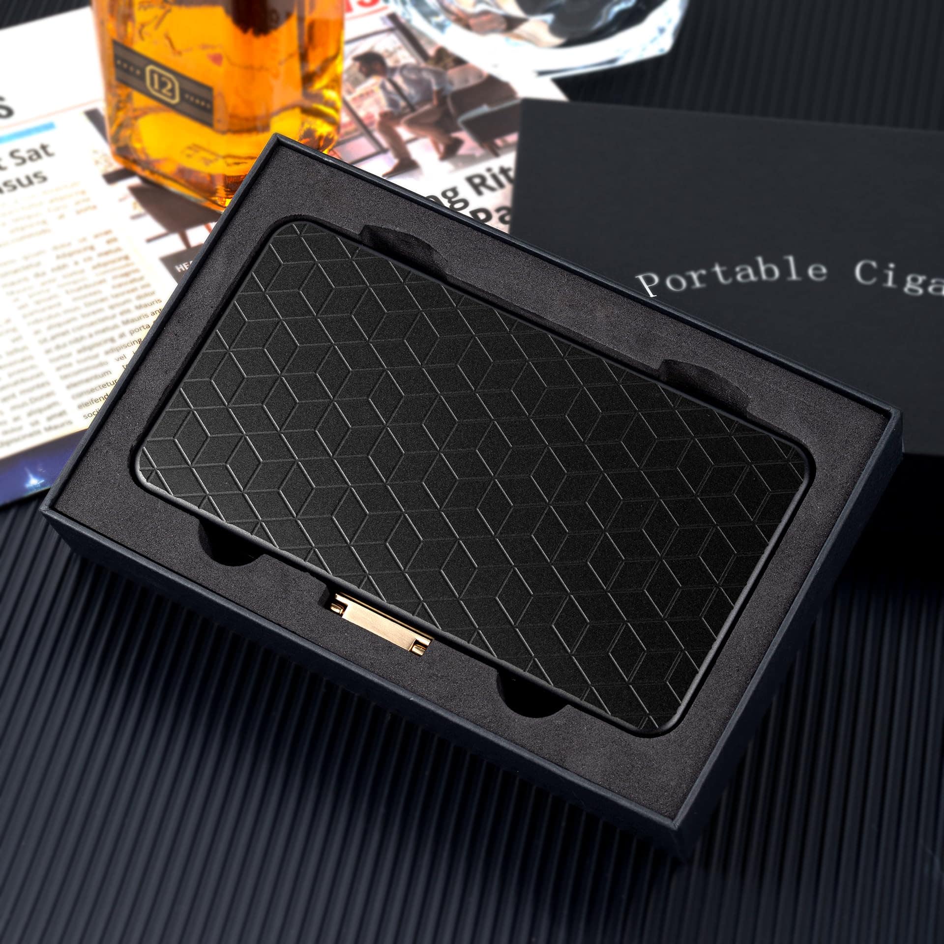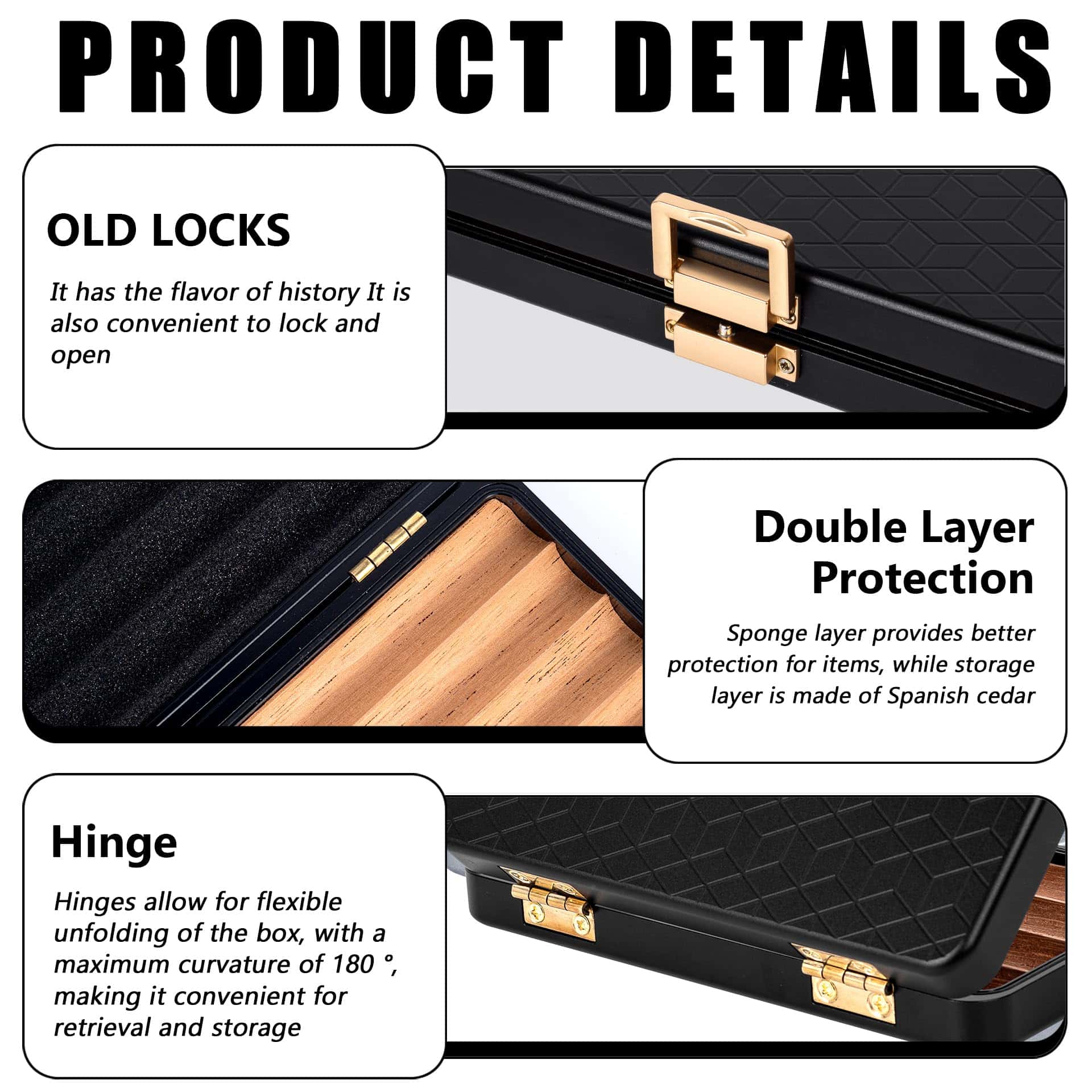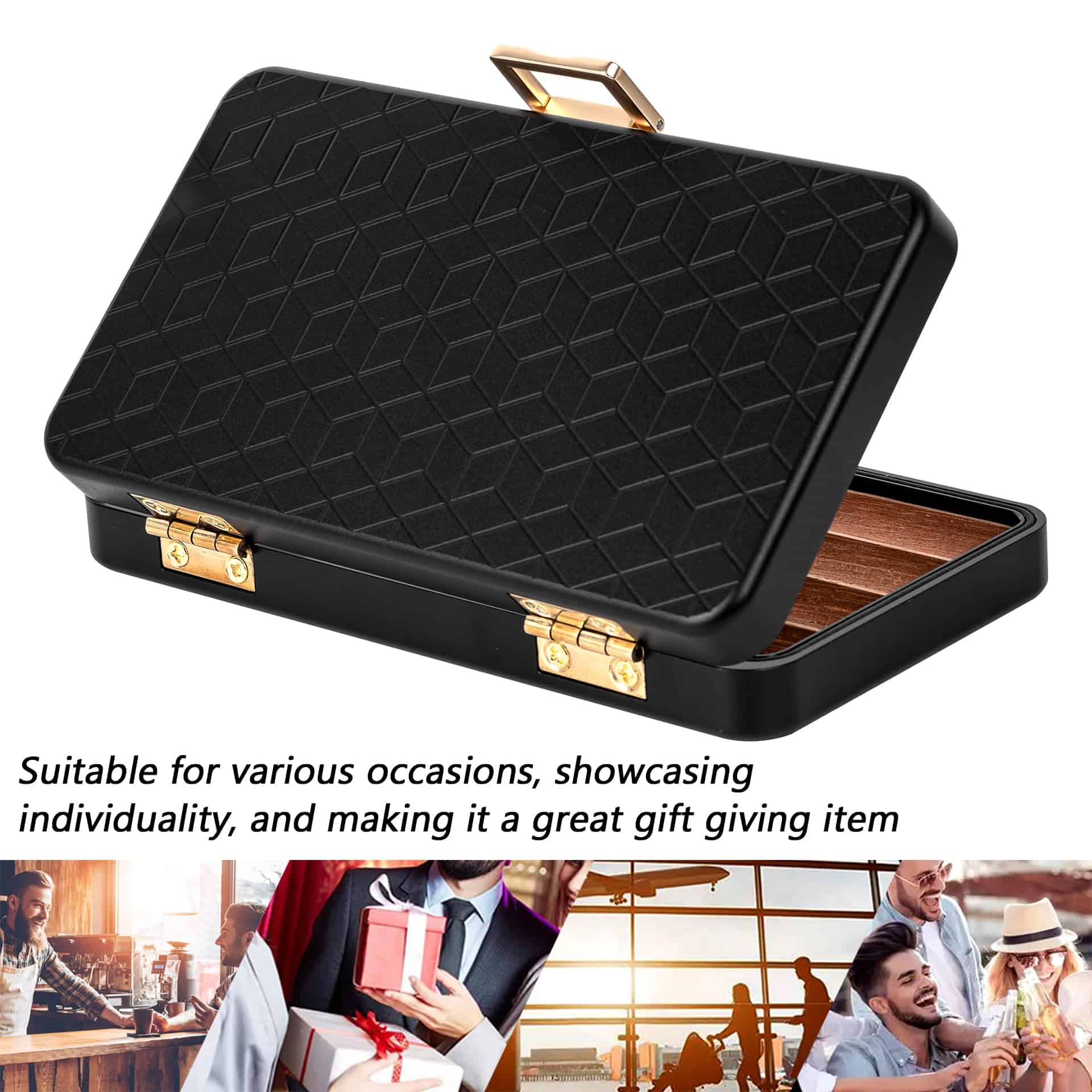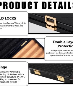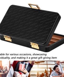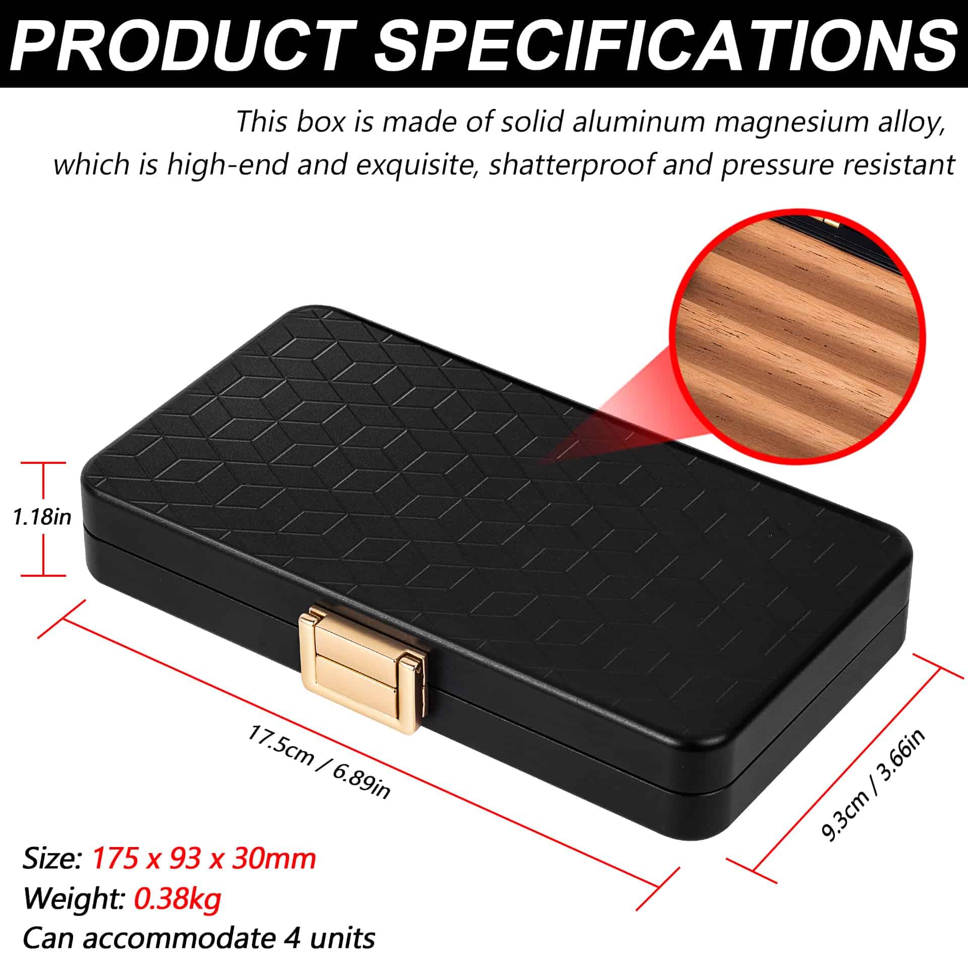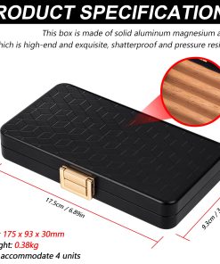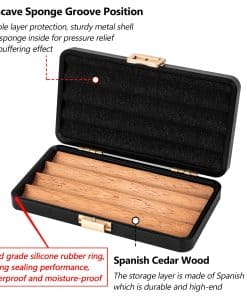 Este es un estuche de viaje muy bonito con un resistente estuche exterior de aluminio que está bien hecho, de alta gama oxidizado y hermético al aire y al agua. El material es aluminio espacial y es ligero con un peso de 12.5 onzas, lo que lo hace pequeño y fácil de llevar en movimiento. El compartimiento interno está hecho de madera de cedro sólido y tiene capacidad para 4 (calibre de anillo de 6″ x 50) para evitar que se aplasten entre sí. La sección superior está hecha de espuma ligera para evitar aplastar el artículo y proporcionar una mejor protección. Rodeado por un anillo de goma impermeable, es hermético al aire y al agua para proteger mejor los artículos de la humedad, el agua y los olores. Empaquetado en una caja de regalo negra de alta gama, ¡este hermoso estuche es perfecto como regalo para tus seres queridos, amigos y mayores!