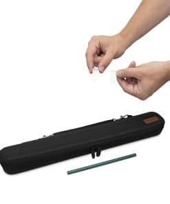 Estuche doble para batuta HAMLY – Completo con 2 marcapáginas de metal y lápiz Estuche para batuta Dentro de su elegante estuche hay 3 soportes de batuta ajustables y extraíbles. También hay 2 almohadillas suaves en la tapa para evitar que las batutas se desplacen. La correa de muñeca doble con hebilla desmontable cuenta con broches dobles para que el estuche se pueda sujetar a un asa de transporte. Materiales de alta calidad El exterior de esta bien hecha bolsa de cuero negro está hecho de nailon resistente al clima 1680D. El interior suave ayuda a evitar que las batutas se dañen. Multifuncional Su estuche ligero es perfecto para transportar 2 batutas a diferentes lugares como; espectáculos, presentaciones, competiciones y prácticas. Esta increíble bolsa también puede contener una variedad de otros artículos como; batutas de dirección, varitas de Harry Potter, batutas de seguridad, bastones de artes marciales, palos de autodefensa y palos de moderadores. Marcapáginas de metal y lápiz Incluidos en este paquete hay 2 marcapáginas de metal duraderos y de alta calidad con clip. Estos clips son ideales para marcar su página para que siempre sepa dónde está. Son ideales para usar con una variedad de cosas como; libros de música, hojas de música, libros de cocina, manuales, libros de texto y novelas. También se incluye un lápiz resistente que se puede mantener en su lugar con el lazo para lápices en su bolsa. Dimensiones Las dimensiones de su estuche doble para batuta son 17» / 43.18 cm x 3» / 7.62 cm x 2» / 5.08 cm. Esta bolsa de alta calidad puede contener dos batutas de 16» y tiene un lazo para lápices para su lápiz incluido. Lo que se incluye – 1 x Estuche de batuta – 2 x clips de marcapáginas de metal – 1 x lápiz