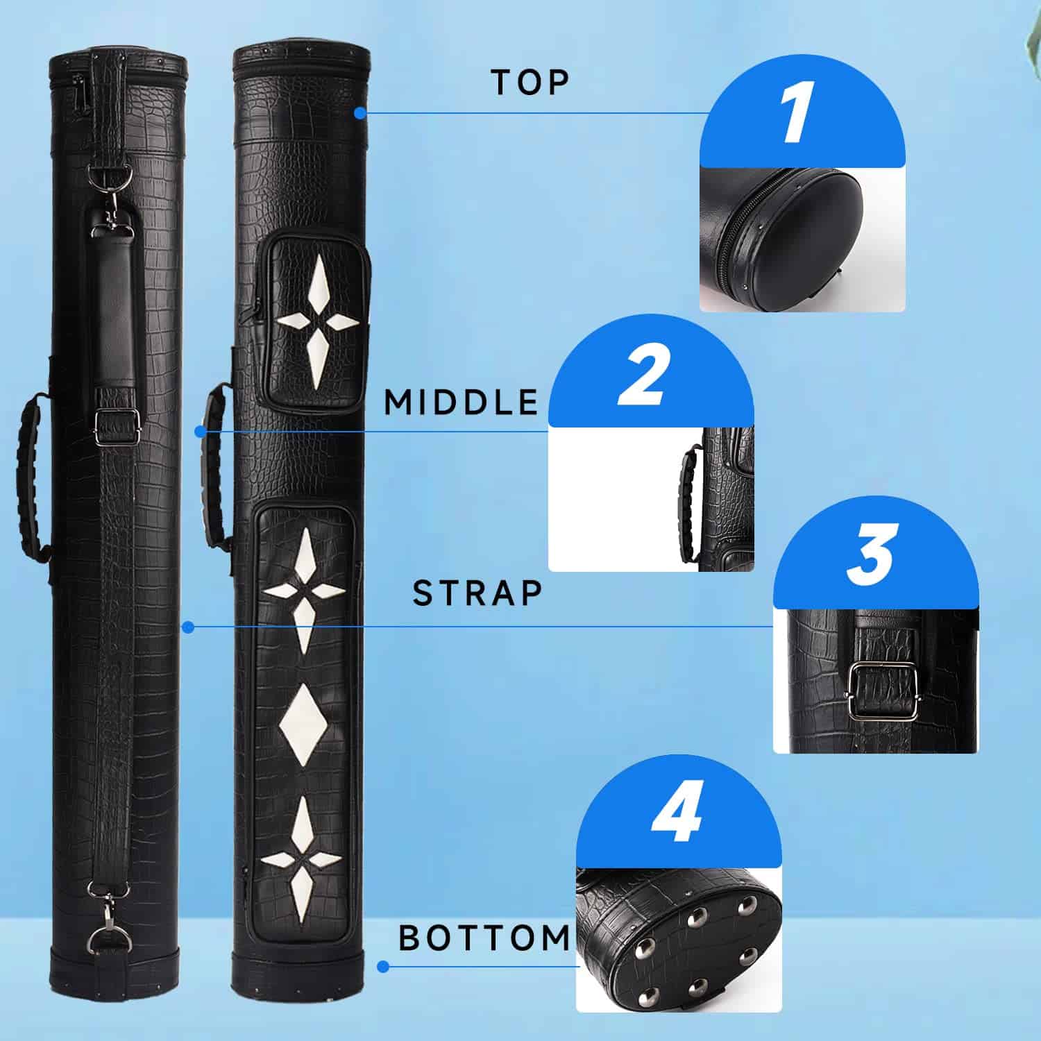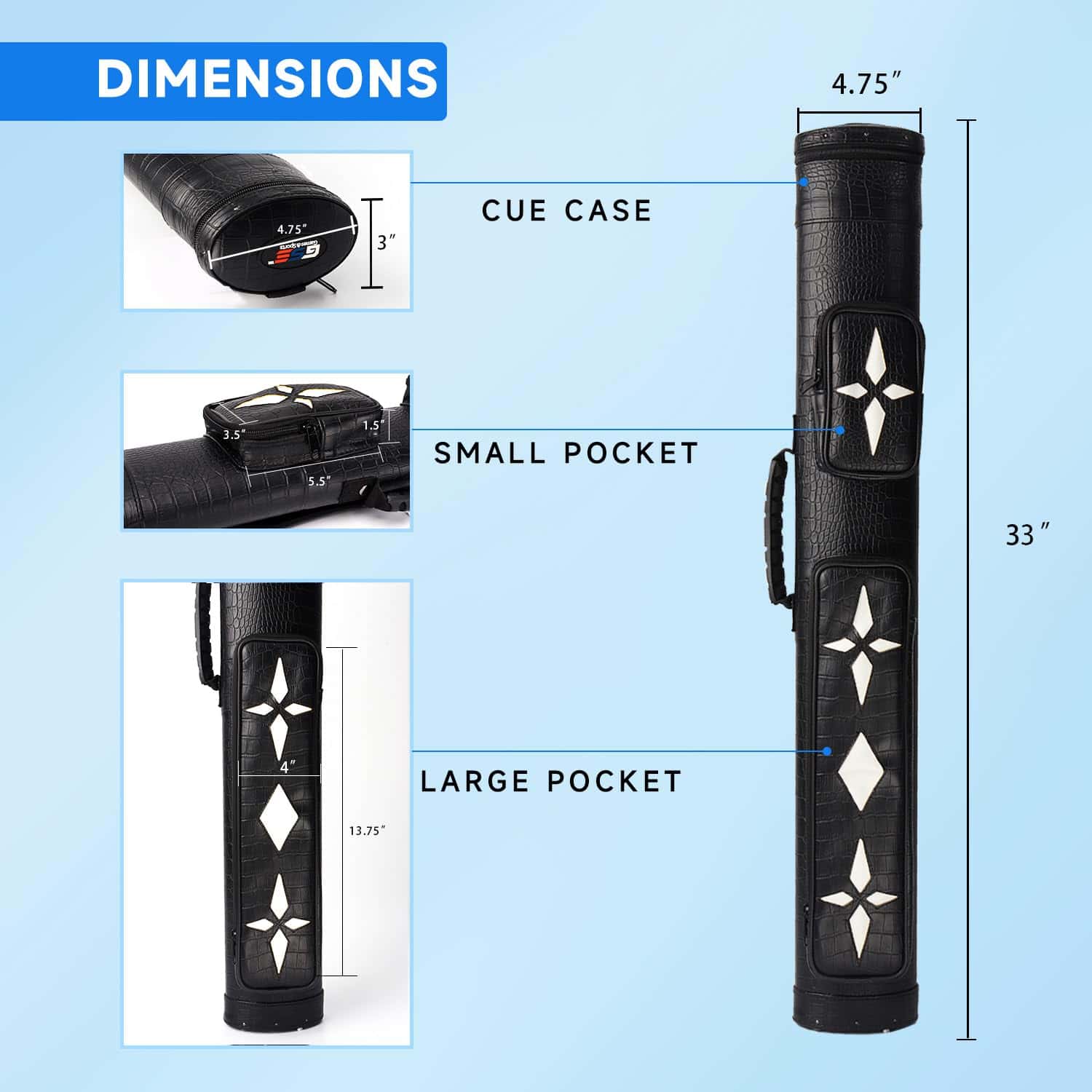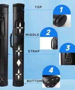 Capacidad para dos palos de billar. El estuche duro para palos de billar tiene un revestimiento de piel sintética y puede contener dos culatas y dos ejes, lo que permite llevar dos palos de dos piezas de 58 pulgadas o menos con seguridad. Diseño duradero y elegante. La carcasa dura protege el palo de billar de golpes y arañazos, manteniéndolo en perfecto estado. Además, cuenta con una correa para el hombro ajustable y desmontable para facilitar su transporte, y un asa suave para mayor comodidad. Interior suave y protector. Los tubos divisores dentro del estuche separan cada culata del eje, mientras que el interior suave amortigua los palos de billar si se caen accidentalmente. Accesorios prácticos. El estuche cuenta con dos bolsillos con cremallera para almacenar culatas de peso / culatas de salto, puntas, tizas, cabezales de puente y otros accesorios de billar, manteniéndolos seguros y organizados. Disfruta de tus partidas de billar con este estuche deluxe de GSE Games & Sports Expert.