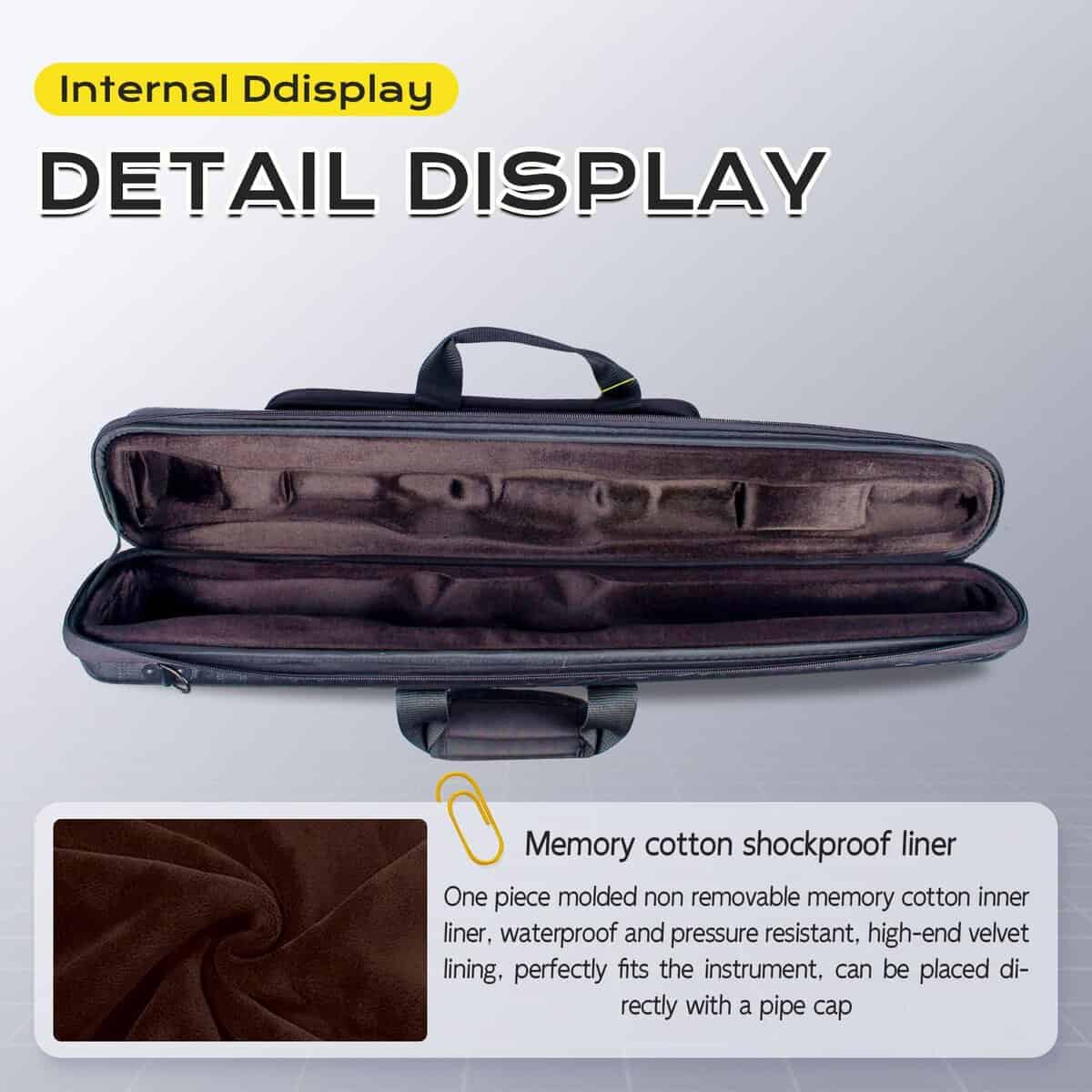 1. Diseño protector: El estuche para clarinete cuenta con un resistente exterior de cuero sintético resistente al desgaste y repelente al agua, y el interior del estuche está forrado con un delicado material de terciopelo, mejorando la comodidad y seguridad de tu clarinete durante el transporte.