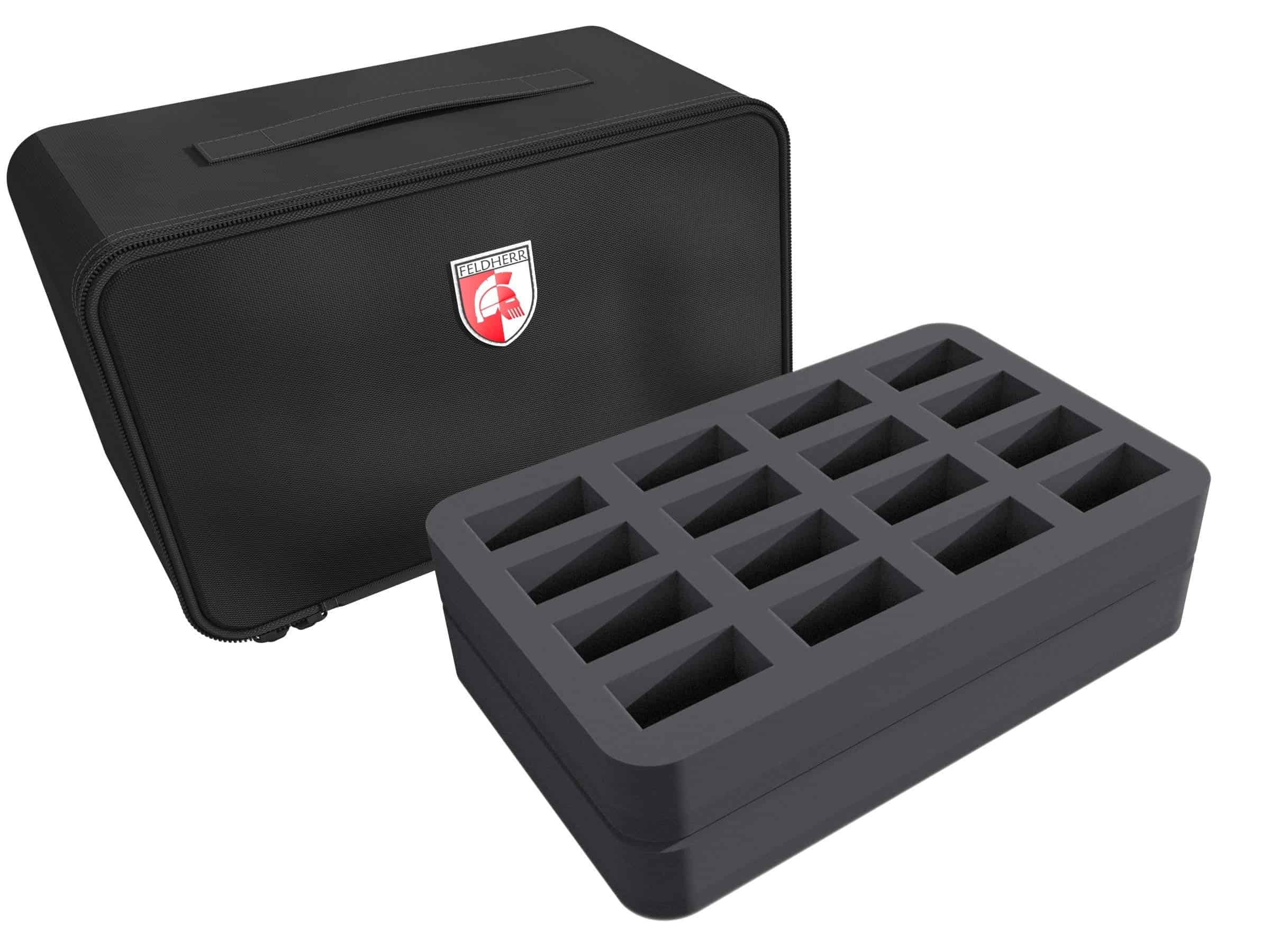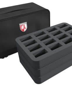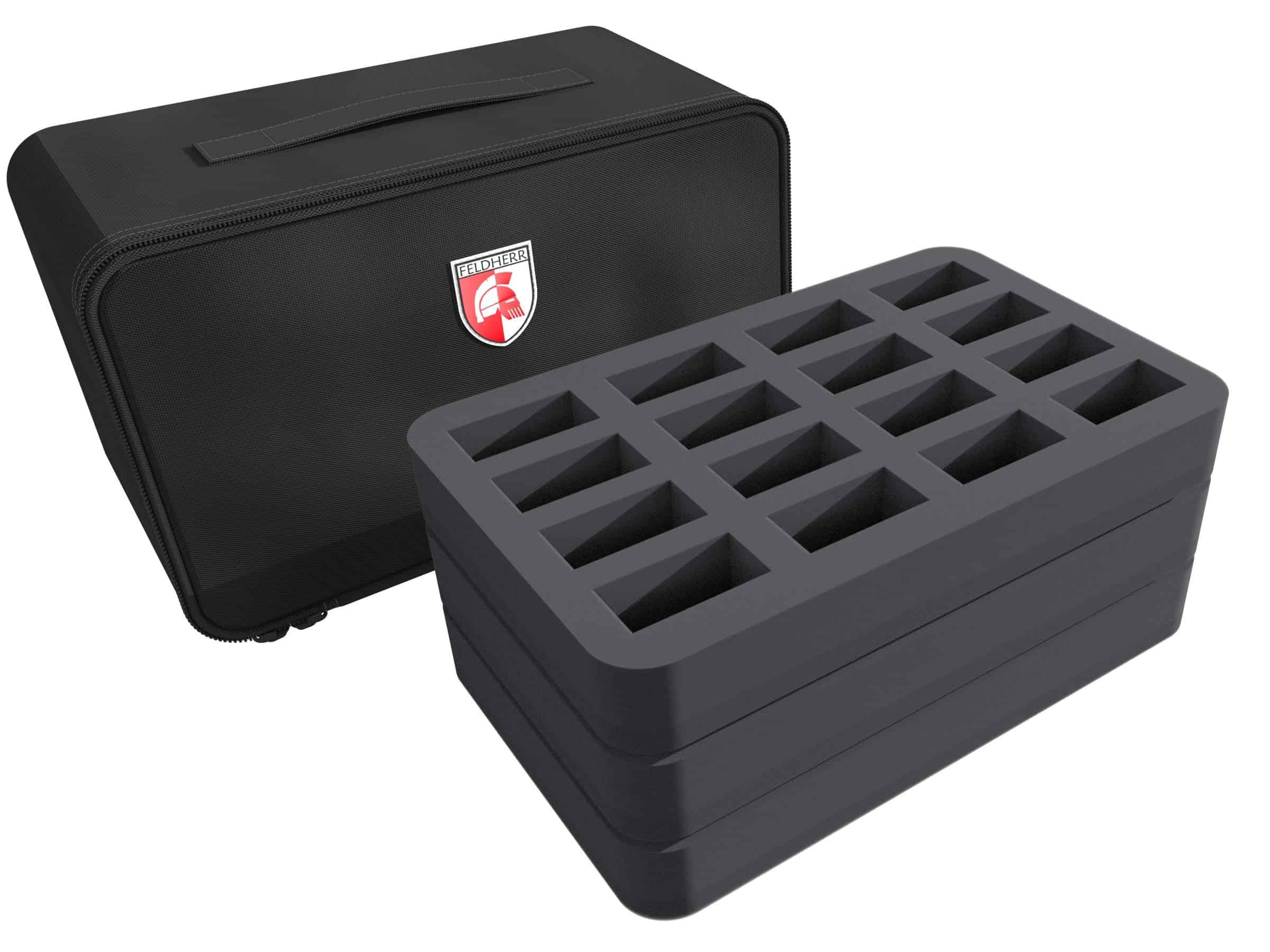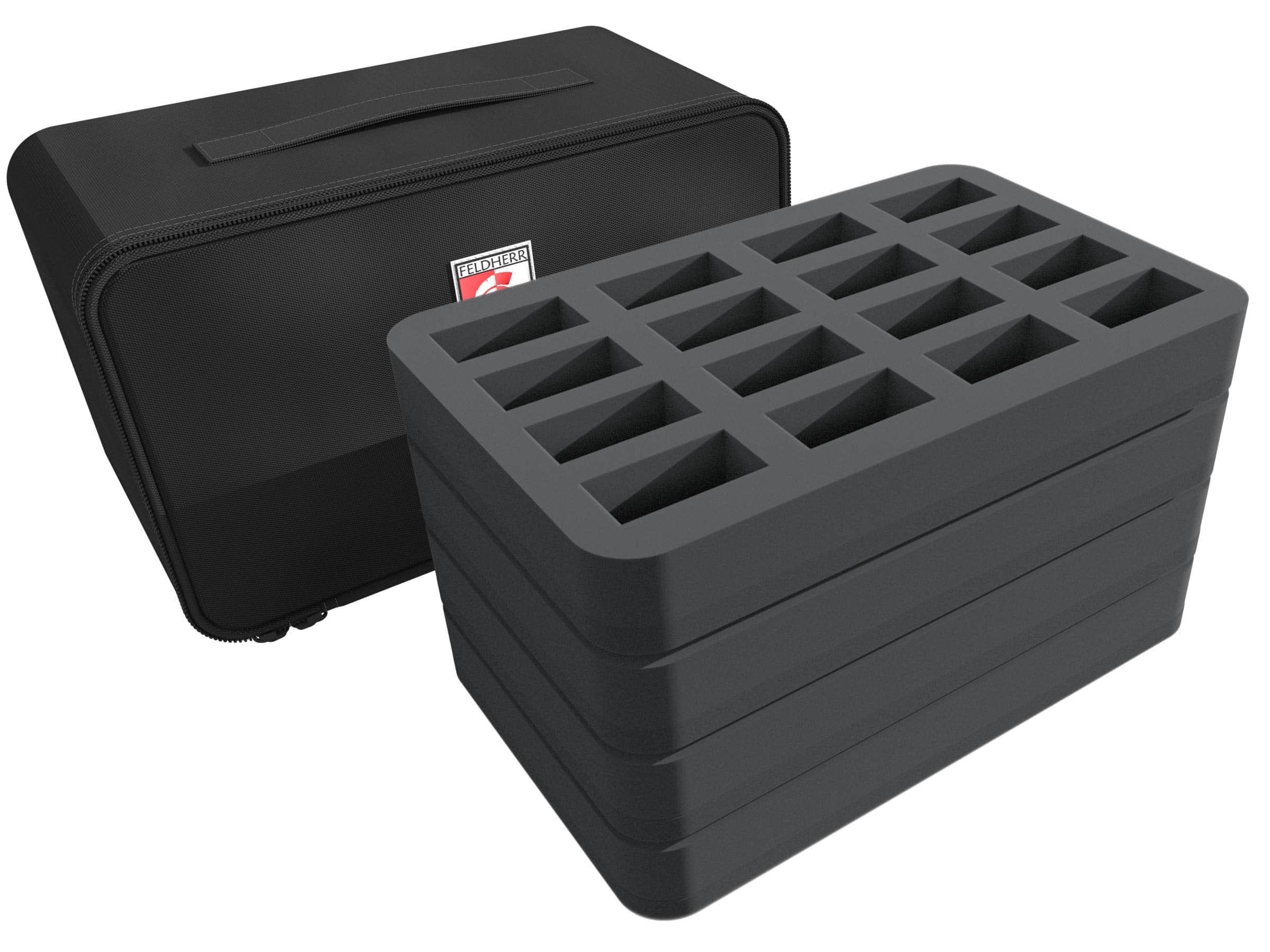 El Estuche para figuras de miniaturas Feldherr MINI PLUS 64 viene con: 4 bandejas de espuma de 35 mm que almacenan hasta 16 miniaturas cada una 1 tope de espuma