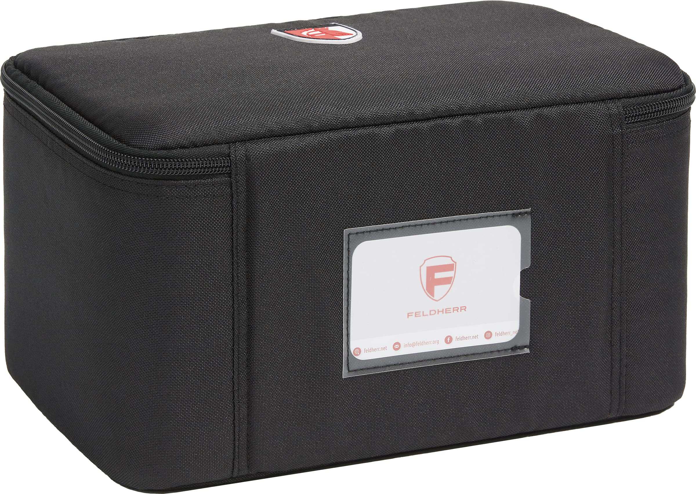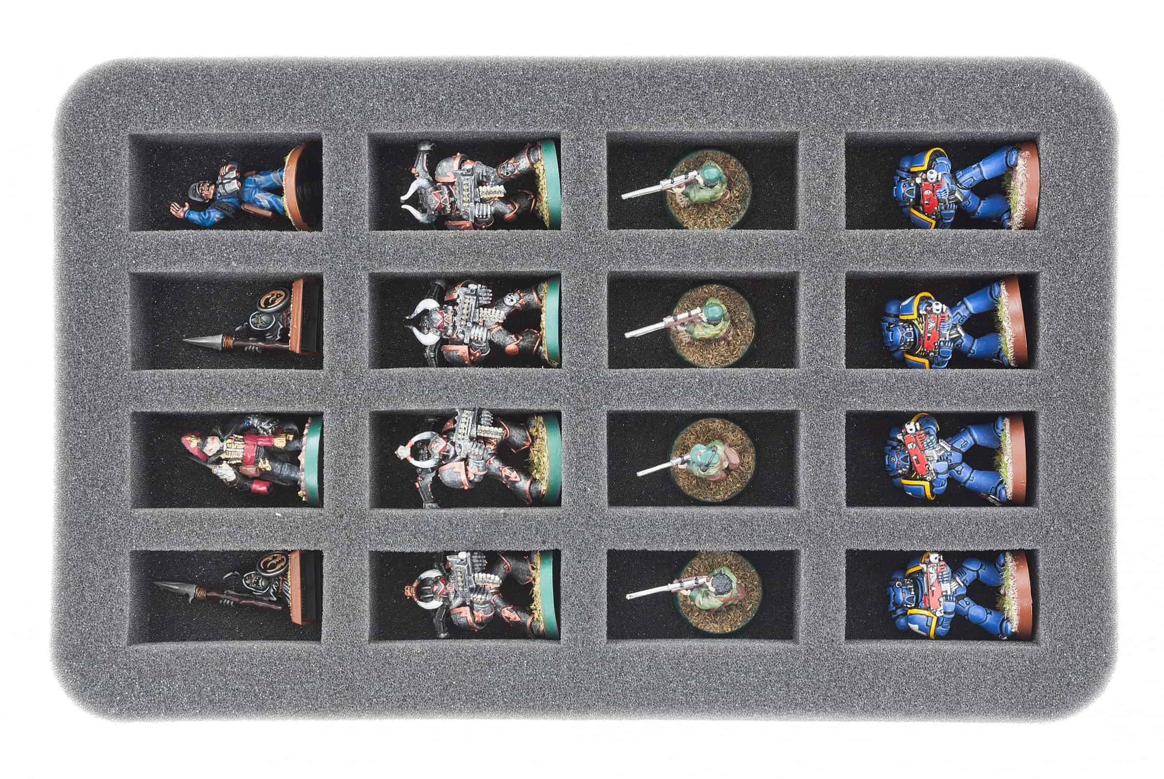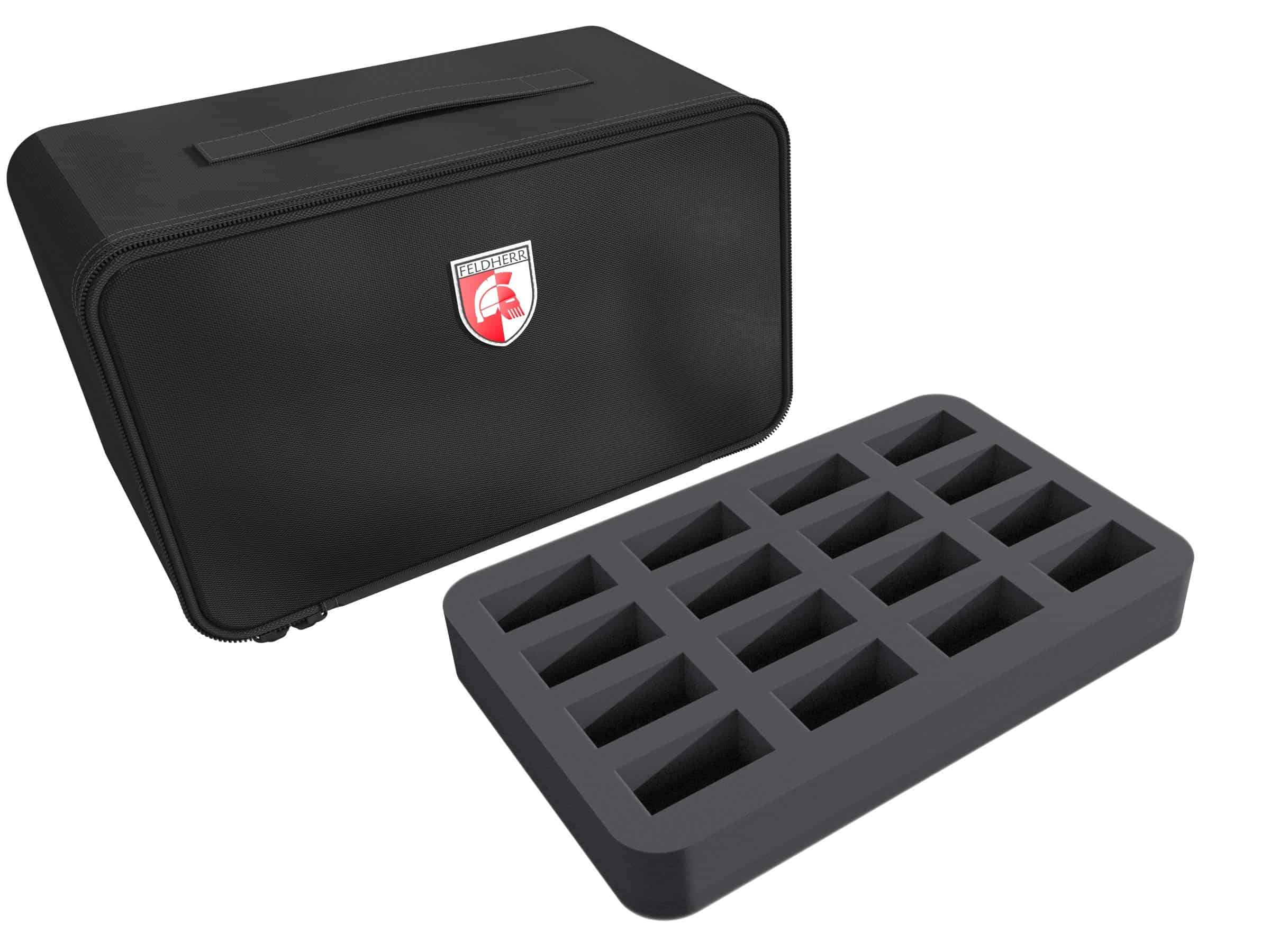 El Estuche para figuras de miniaturas Feldherr MINI PLUS 64 viene con: 4 bandejas de espuma de 35 mm que almacenan hasta 16 miniaturas cada una 1 tope de espuma