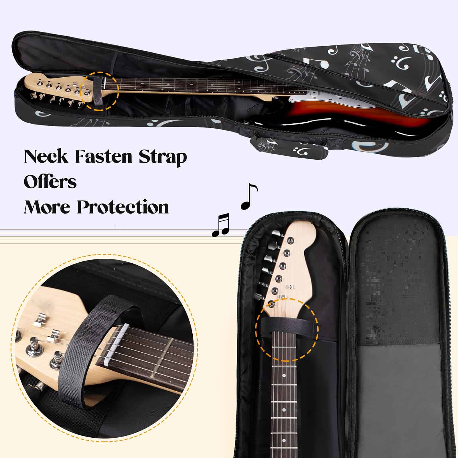 4. Sujetador seguro para guitarra: el estuche tiene una correa de sujeción para el mástil para mantener tu guitarra de forma segura en su lugar.