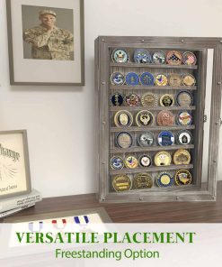 El estuche para exhibir monedas de desafío con 7 estantes puede mostrar tus monedas o medallas del ejército, Marina, cuerpos militares, policía, bomberos. Puede ser montado en la pared o exhibido en un mesa o estante sin preocupaciones, ya que la puerta de cristal y la cerradura mantienen tus monedas militares, medallas de premio y otras colecciones seguras de robos, polvo y arañazos. Este soporte para monedas desafío puede mostrar más de 40 monedas dependiendo del tamaño de la moneda. Regalo perfecto para el Cumpleaños del Ejército, Día de los Veteranos, Navidad y Militares Retirados.