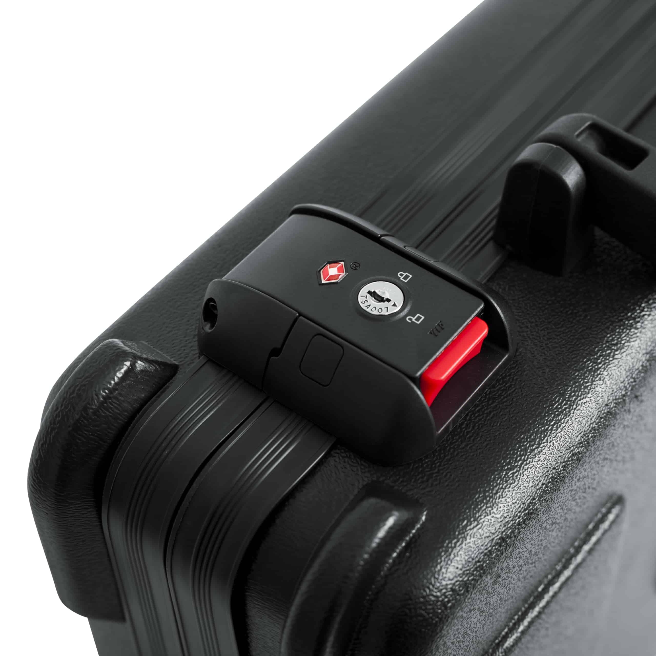 4. Pestillos con cerradura TSA con platos de desviación de impacto y disparador de liberación rojo.