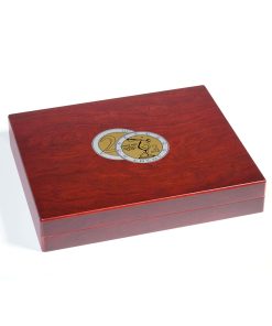 Estuche para presentación de alta calidad en acabado de imitación madera de caoba con una bandeja fija y dos bandejas extraíbles. Ideal para exhibir colecciones de monedas de 2 euros en cápsulas de forma elegante y organizada. El estuche VOLTERRA Trio de Luxe es perfecto para coleccionistas con gusto por la presentación impecable de sus piezas.