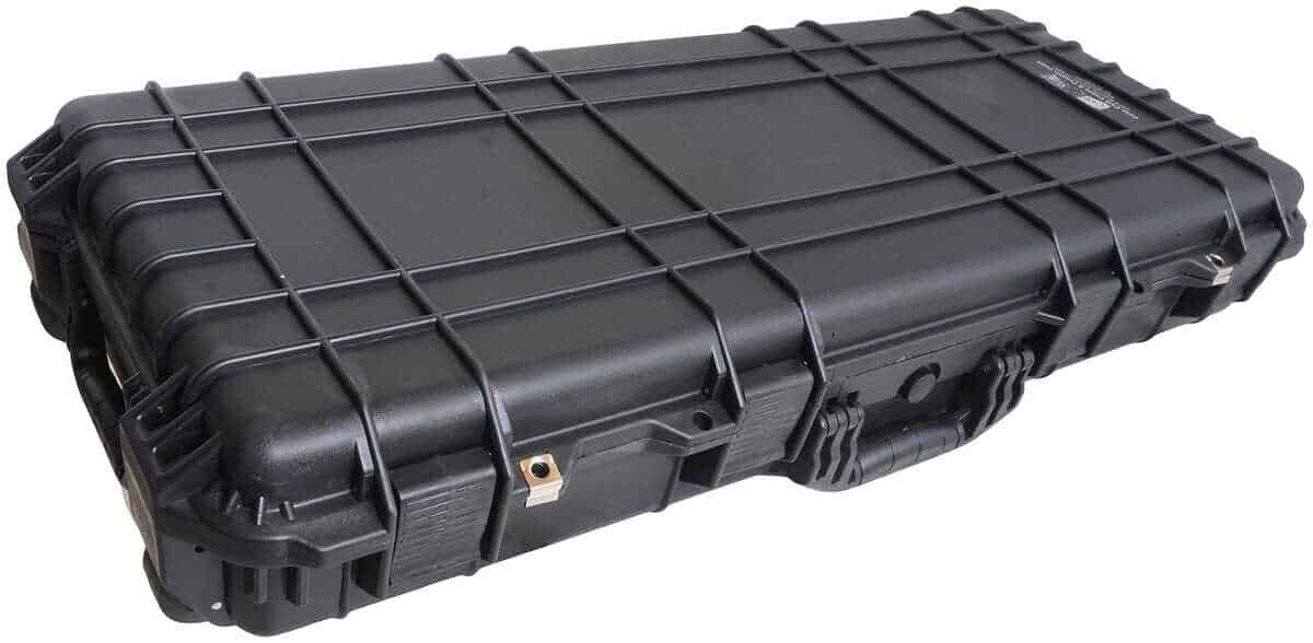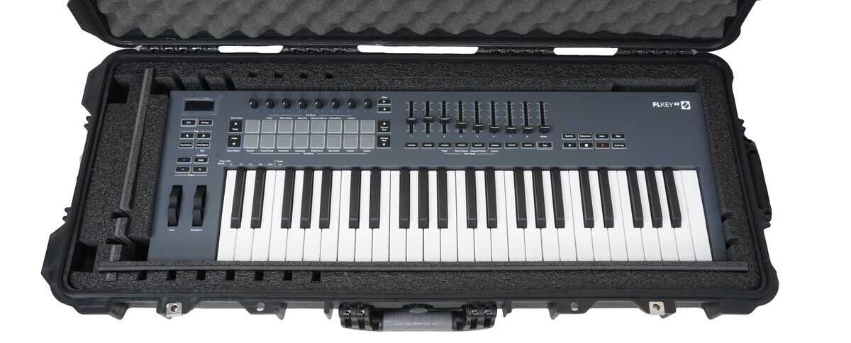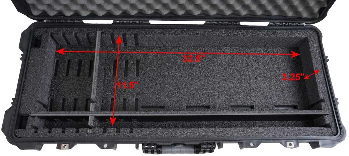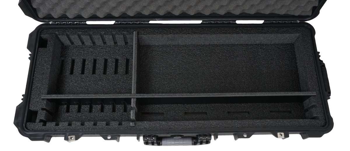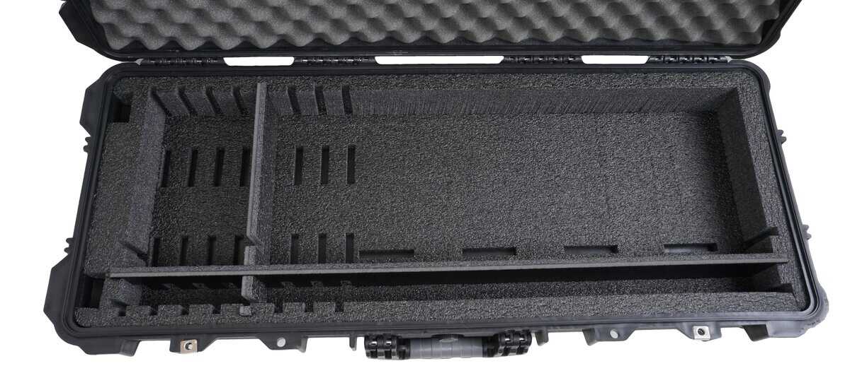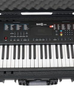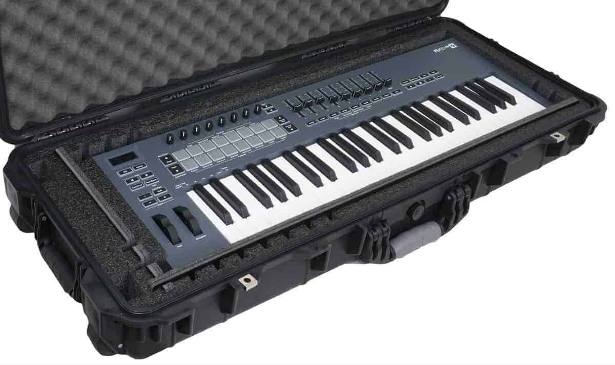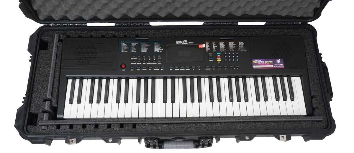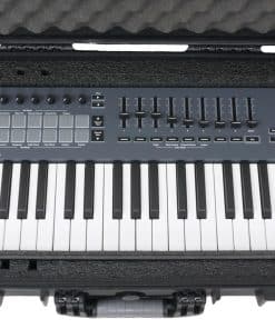 Estuche ajustable para teclados de 37-49 Notas. Dimensiones máximas compatibles de teclado son 32.5″ L x 11.5″ W x 3.25″ H. El estuche cuenta con separadores cruzados ajustables y bloques espaciadores para un ajuste perfecto del teclado. La espuma es de polietileno de celda cerrada de grado militar que absorbe impactos y es duradera. Características exteriores incluyen ruedas inclinadas y duras, asa plegable y válvula de alivio de presión.