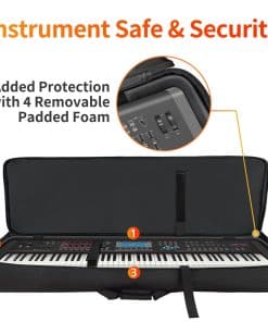 Nota! Tamaño interior: 57.2″x18.2″x6.8″. ¡Por favor, verifique el tamaño del teclado antes de comprar! El estuche para teclado de 88 teclas con ruedas se adapta a la mayoría de los teclados de 88 teclas. (NO TODOS los teclados de 88 teclas) El amplio estuche para teclado tiene 3 bolsillos exteriores con cremallera, proporcionando mucho espacio para atriles de partituras (menos de 17″), libros de música, pedales, cables, iPads, etc. Puedes almacenar o transportar el querido teclado y organizar accesorios musicales en cualquier momento y lugar. 3 FORMAS DE TRANSPORTE: El estuche para teclado de piano cuenta con correas ajustables firmes, manijas y 2 ruedas de alta calidad, y puedes llevarlo como mochila, bolso de mano o enrollarlo cómodamente como una maleta con las ruedas resistentes. Las correas ajustables para hombro garantizan un transporte cómodo y manos libres, mientras que las resistentes manijas de nylon proporcionan un transporte sólido con una sola mano. Este estuche para teclado de 88 teclas es adecuado para músicos, tecladistas, esposas, esposos, hijos, hijas y amigos. SISTEMA DE TIRAR RESISTENTE: El estuche para piano de 88 teclas cuenta con un resistente y grueso mango de tirar, manteniéndolo alejado de roturas o desgarros mientras se tira de los pesados teclados digitales, y la gruesa esponja evita dañar las manos. Combinado con las ruedas independientes resistentes, puedes transportar tu equipo con confianza sin preocuparte por ruedas fácilmente dañadas. Una excelente elección de regalo para músicos en cumpleaños, aniversarios, Día de Acción de Gracias, Halloween y Navidad. INSTRUMENTO SEGURO Y PROTEGIDO: El estuche para teclado digital está diseñado con 2 correas de seguridad ajustables interiores para ajustar tu teclado, evitar que se sacuda y sufra daños durante el transporte entre actuaciones o prácticas, garantizar que tu teclado esté seguro. Ya seas profesor, músico, tecladista u otro jugador de instrumentos musicales, la bolsa para teclado de piano de 88 teclas es la forma sin preocupaciones de mantener tus instrumentos musicales seguros y limpios para garantizar el mejor efecto, ya sea en presentaciones o transportes. TELA A PRUEBA DE AGUA Y POLVO 600D: Para proteger tus instrumentos favoritos, el estuche de 88 teclas cuenta con material resistente al agua y a prueba de arañazos para garantizar que el teclado evite colisiones y arañazos, y evite la humedad. Gracias a la estructura duradera, el estuche para teclado de música garantiza que el teclado se mantenga seco y protegido del polvo. Con la solución ultraligera, la bolsa para teclado de 88 teclas es portátil para transportar en viajes, conciertos y desplazamientos.