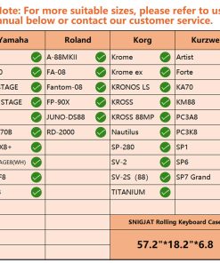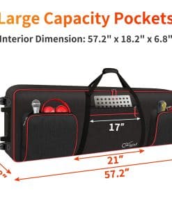 1. Estuche para Teclado de 88 Teclas con Ruedas: Tamaño interno: 57.2 x 18.2 x 6.8 pulgadas. Por favor, verifique el tamaño del teclado antes de comprar. Este estuche para teclado de 88 teclas con ruedas está diseñado para adaptarse a la mayoría de los teclados de 88 teclas populares (NO todos los teclados de 88 teclas). El espacioso estuche para teclado de 88 teclas incluye 3 bolsillos de almacenamiento con cremallera exteriores, brindando mucho espacio para atriles de partituras (hasta 17 pulgadas), libros de música, pedales, cables, iPads y más. Guarde o transporte su amado teclado y organice sus accesorios musicales en cualquier momento y lugar.
