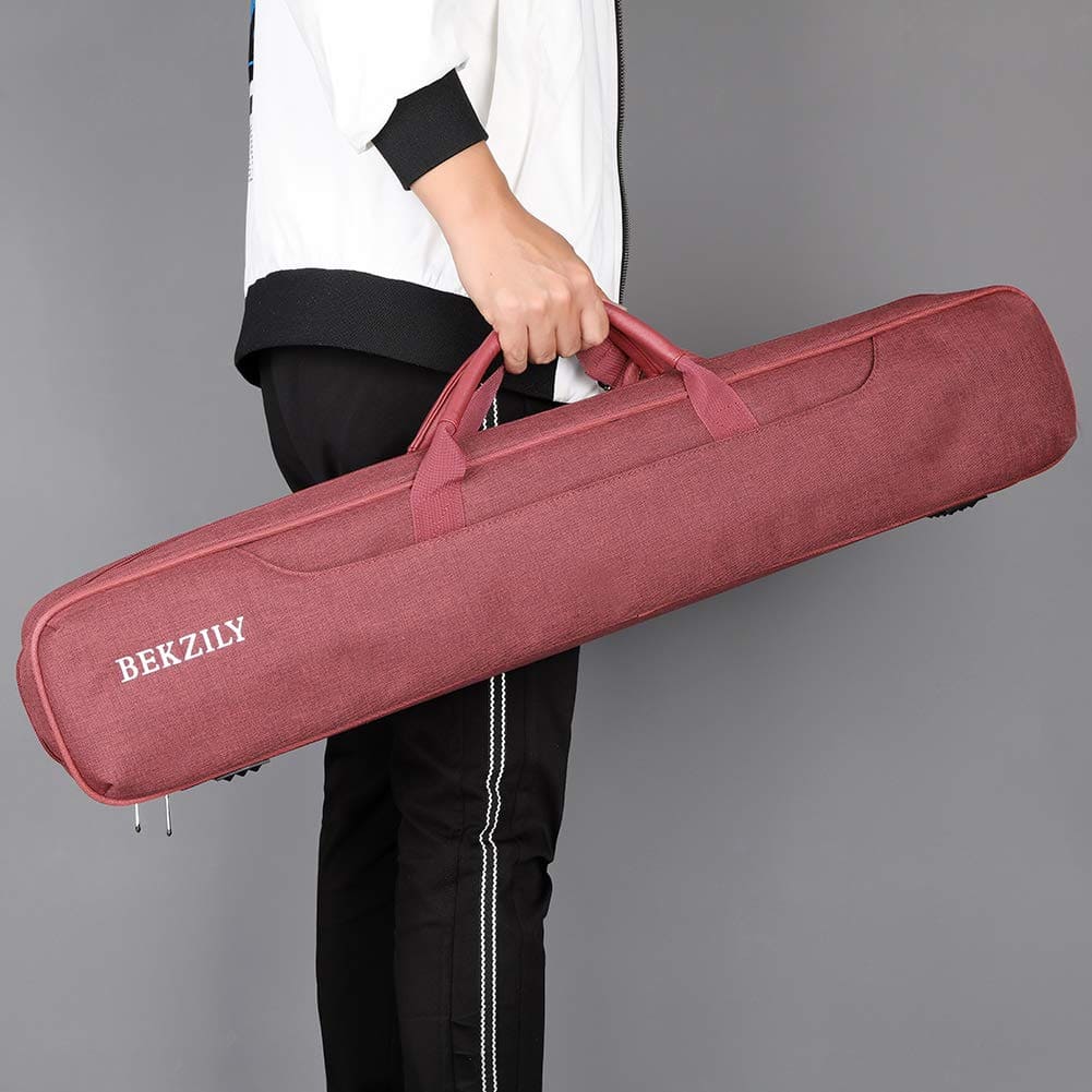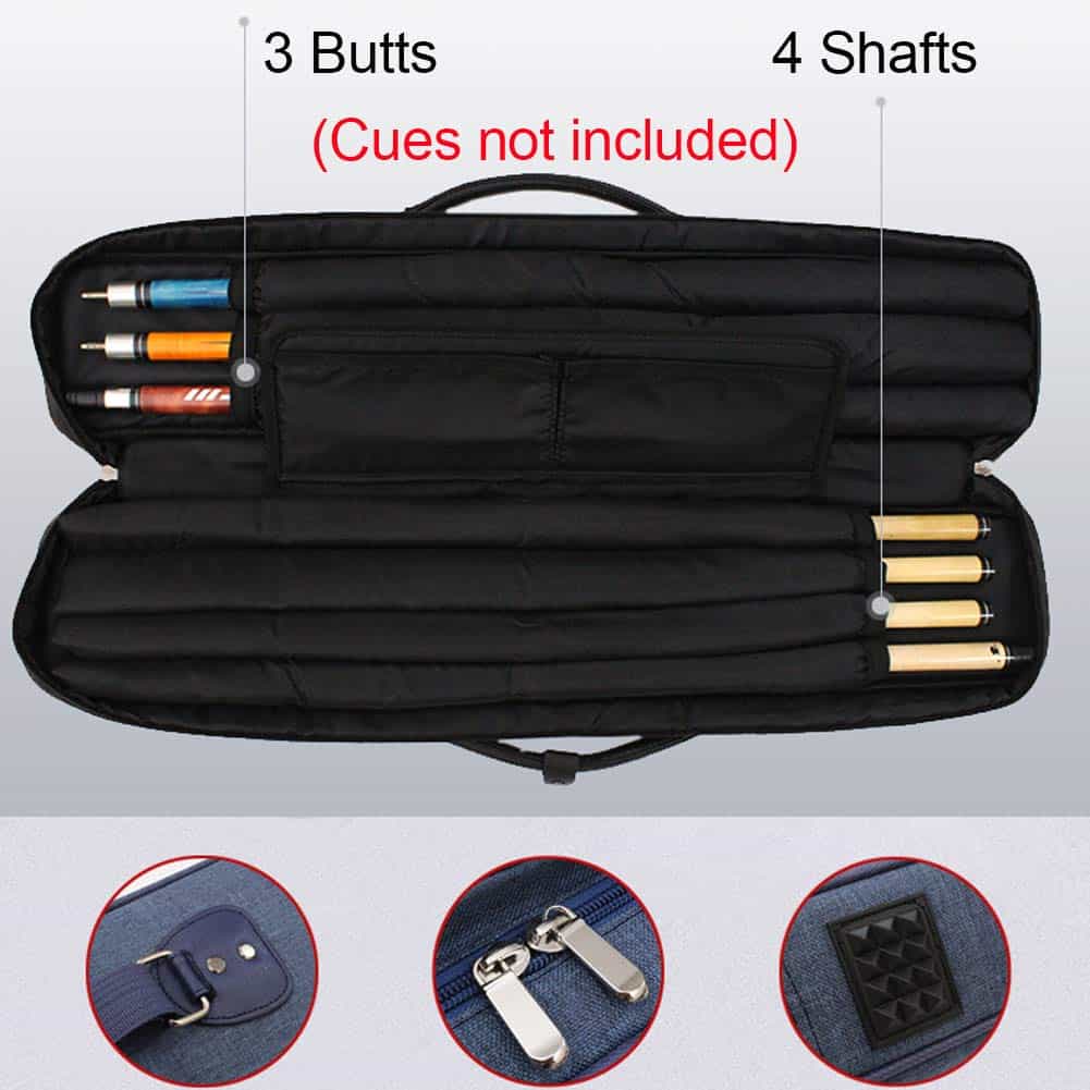 Estuche para transportar tacos de billar de alta calidad confeccionado con tela de oxford de alta densidad, que lo hace resistente al desgaste y al agua. No solo protege el taco, sino también el estuche del taco. Con capacidad para 3 tacos y 4 flechas, su espacio interno ha sido rediseñado para maximizar eficazmente la capacidad y mantener los tacos de forma segura en su lugar. El diseño exterior cuenta con un espacio exclusivo para accesorios de billar, incluyendo un pequeño bolsillo con cierre para guardar tizas, puntas de taco, etc., permitiendo que tus artículos estén organizados y fáciles de encontrar. El asa superior está fabricada con cuero de alta calidad y acolchado de fibra de alta densidad para un transporte cómodo y resistente a lo largo del tiempo. Con unas medidas de aproximadamente 32.5″ de largo x 7″ de ancho x 3.3» de alto, este estuche es perfecto para los amantes del billar que desean llevar sus tacos de forma segura y protegida.