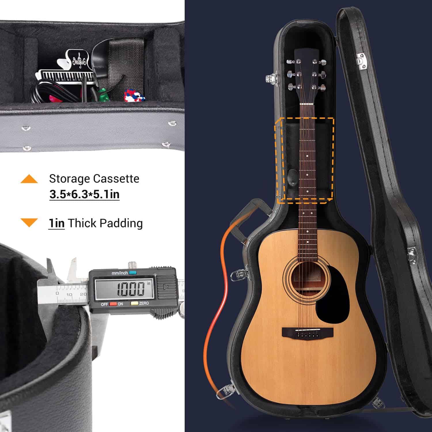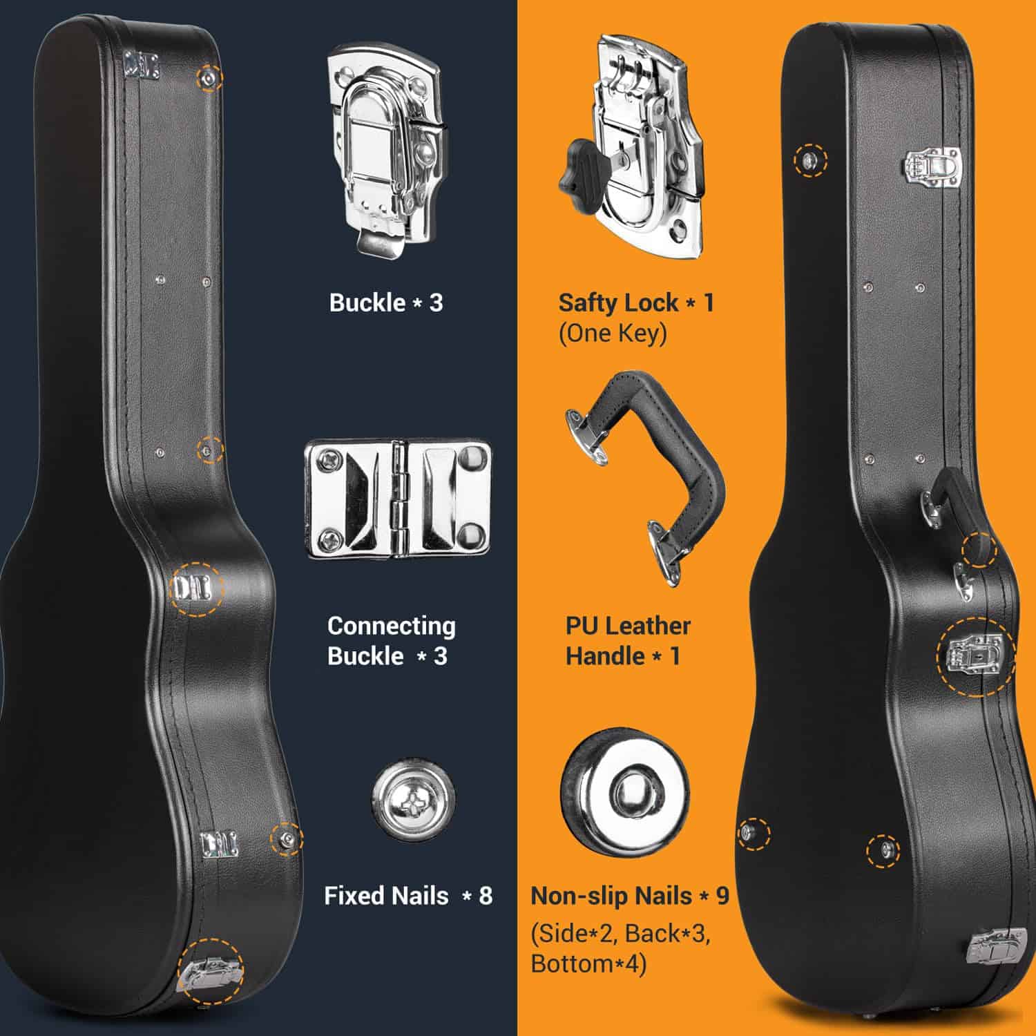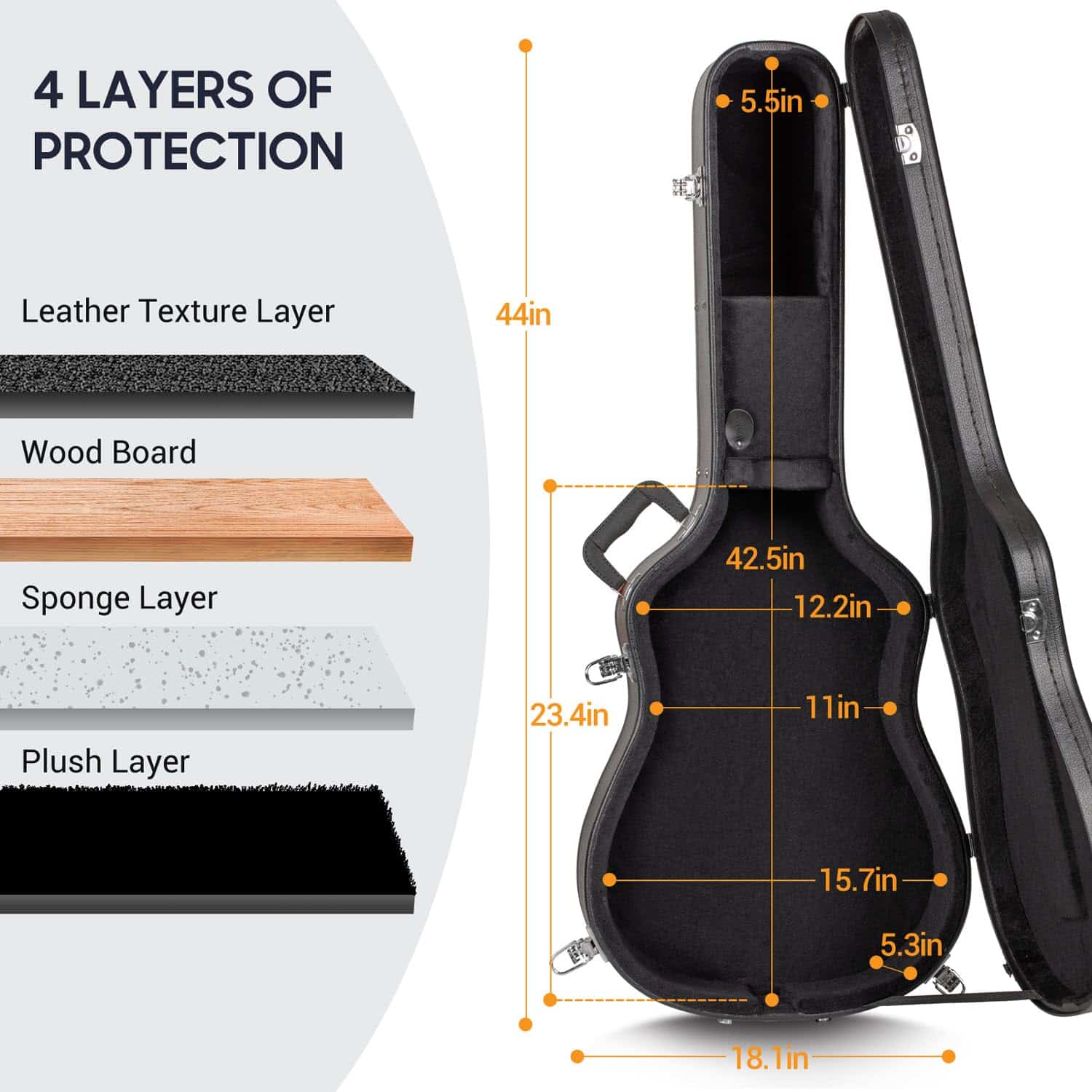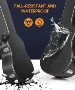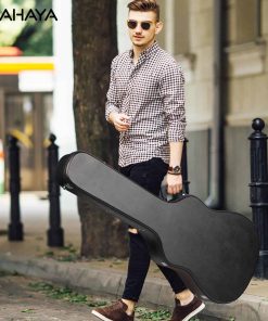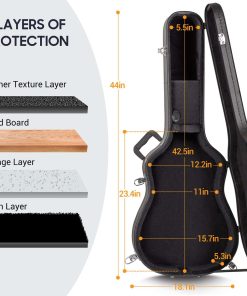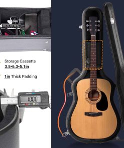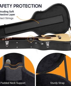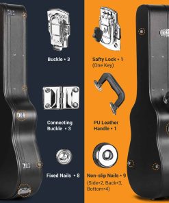Nuestros estuches para guitarras están fabricados con cuero, madera, esponja y acolchado grueso, son ligeros y resistentes, protegen tu preciada guitarra desde el interior hacia el exterior. Cuentan con una durabilidad premium y resistencia a los impactos. Resistente a años de uso y abuso. Dimensiones interiores: Longitud total: 42.5 Ancho del Boto Superior: 11.8 Ancho del Boto Medio: 10.8 Ancho del Boto Inferior: 15.7. Diseñado para adaptarse a guitarras acústicas estilo Martin 000 y similares. El estuche para guitarra acústica cuenta con un diseño interno en forma de ‘U’ para el mástil y superficie en forma de abanico para proteger las cuerdas de la guitarra, y la almohadilla de capa gruesa puede reducir daños accidentales a la guitarra. Compartimento interno de almacenamiento para púas, cejilla, afinador y otros accesorios pequeños. Amplio espacio del compartimento interior para organizar todos tus accesorios favoritos para guitarra, mientras brinda soporte adicional al mástil. El estuche para guitarra cuenta con un candado de seguridad y los diseños de hebillas son más duraderos y seguros que las cremalleras normales. Asa cómoda: El asa ergonómica está hecha de cuero y fijada por hardware. Ofrece un agarre cómodo y equilibra perfectamente el peso de tu instrumento. Ideal para el músico que viaja con su guitarra de forma regular. Fácil de limpiar: Esta funda de concierto utiliza cuero impermeable externo y es muy fácil de limpiar. El candado blanco plateado con una capa de recubrimiento antioxidante evita que se oxide, y se puede usar durante mucho tiempo.