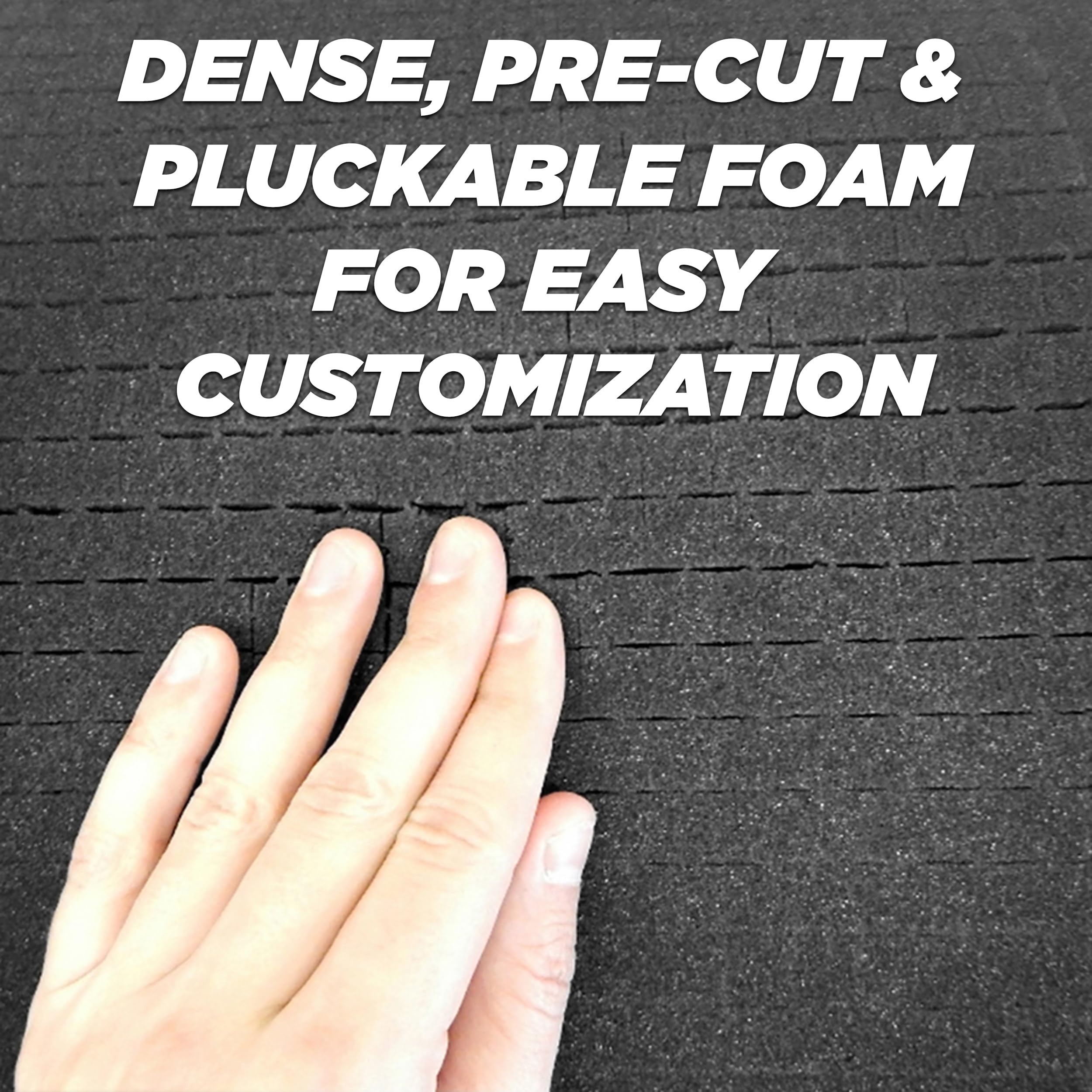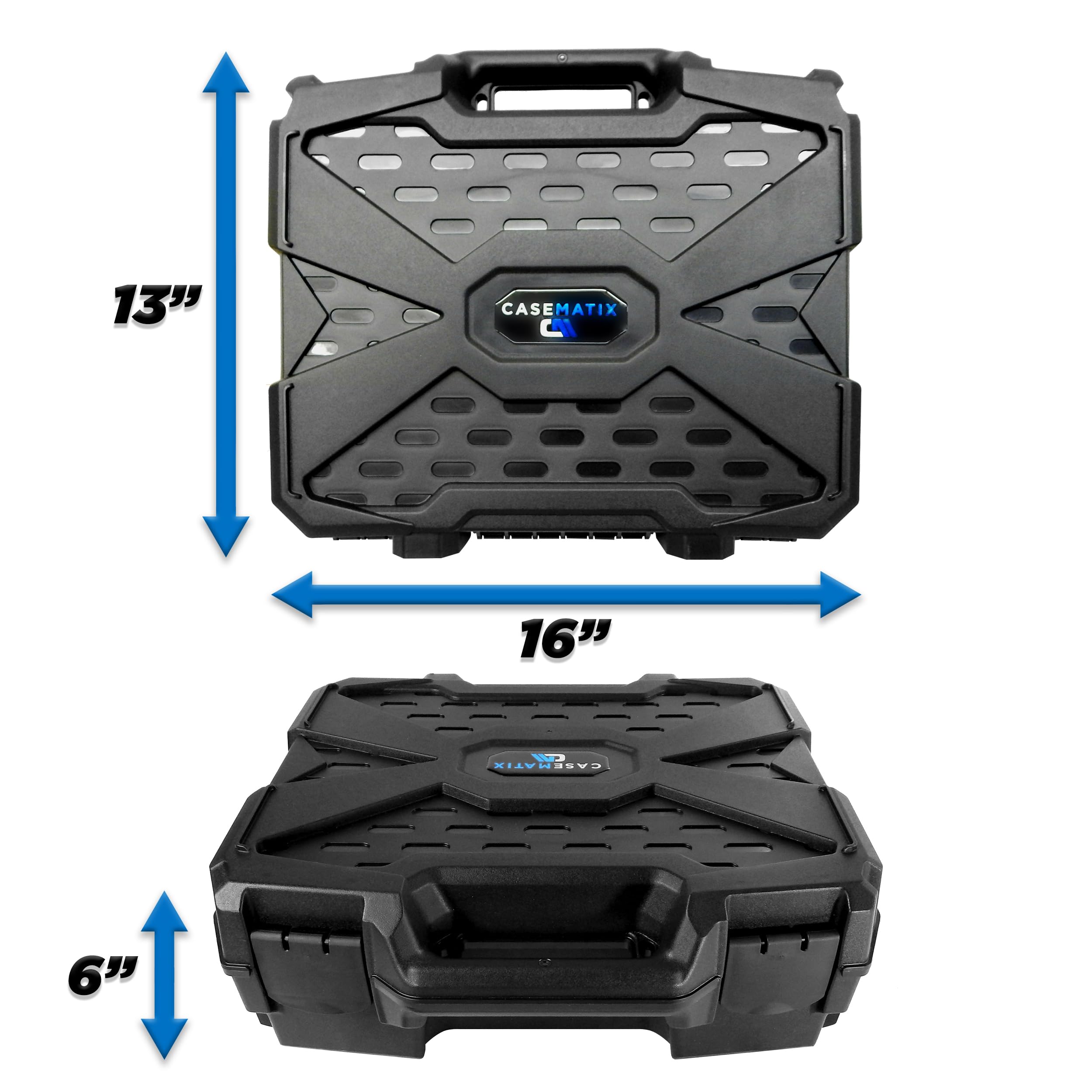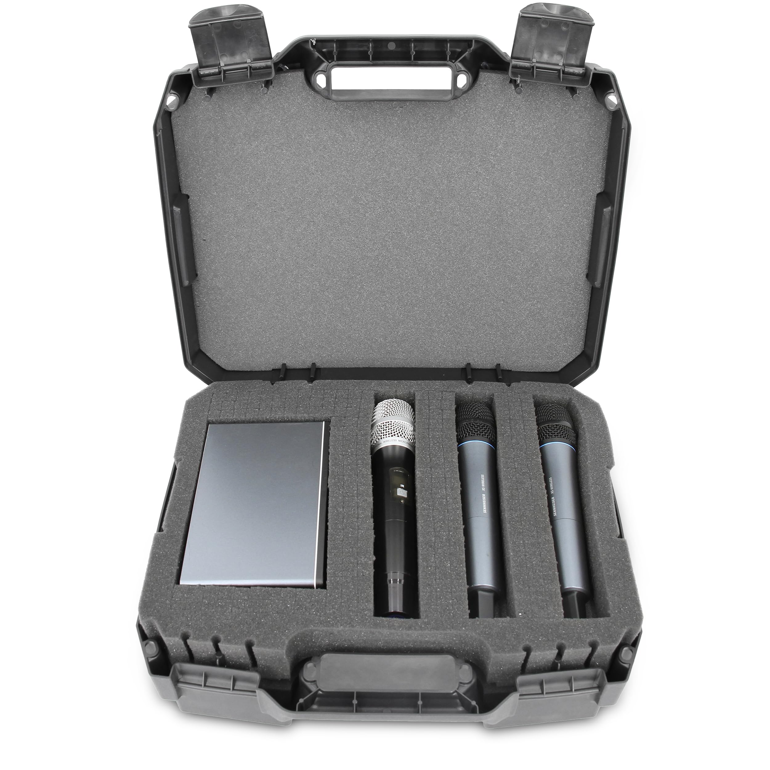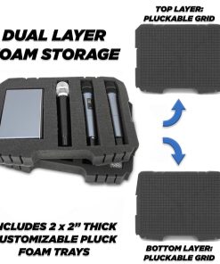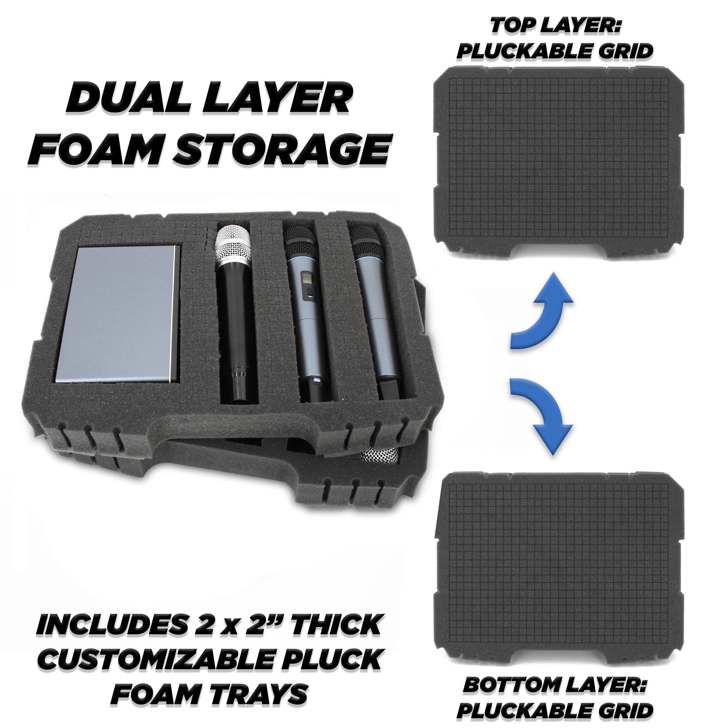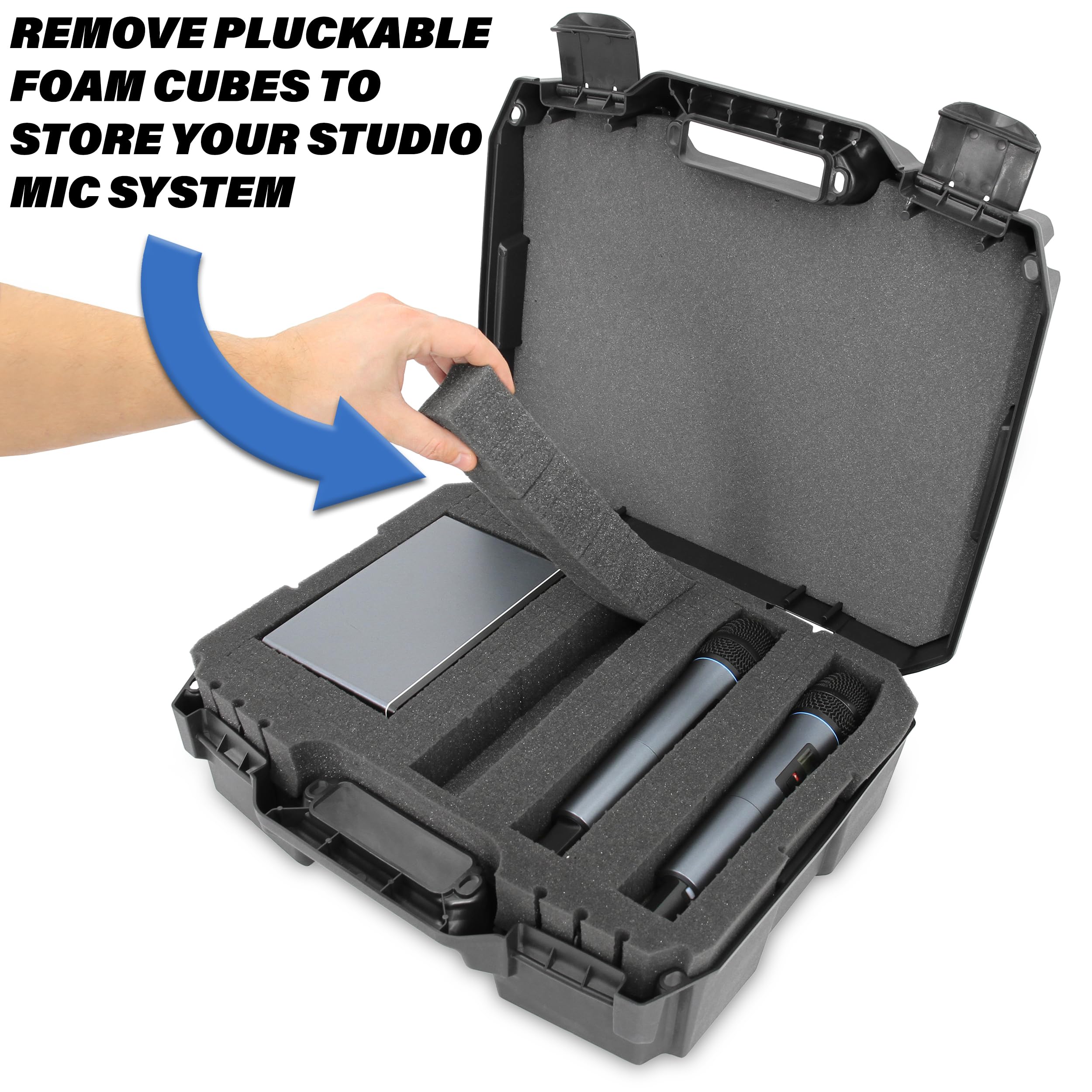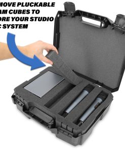 Estuche rígido CASEMATIX Compatible con Sistema de Micrófono Inalámbrico Sennheiser o Shure – Espuma personalizable de doble capa para micrófonos, receptores, transmisores y más – Incluye solo el estuche. Protección de alta resistencia para tu sistema de micrófono: Este resistente estuche de estudio cuenta con un exterior resistente de plástico compuesto, proporcionando una protección óptima con dos capas de espuma personalizable y soporte inferior. 2 Capas de espuma personalizable: Nuestro estuche de estudio cuenta con dos bandejas de espuma que absorben los impactos y se pueden personalizar para adaptarse perfectamente a tu sistema de micrófono de estudio. Cada capa tiene un espacio utilizable de 14″ x 10.5″ x 1.75″ con la espuma superior que se adapta a una profundidad de hasta 2.2″. Tamaño compacto para viajes: Este estuche de transporte es perfecto para micrófonos, receptores, cables y transmisores. Mide 16″ x 13″ x 6″. Con el diseño personalizable de la espuma, puedes mantener tu bolsa de conciertos segura en nuestro diseño de maletín. Asa de transporte conveniente, cierres resistentes: Este estuche de viaje para almacenamiento de micrófono cuenta con un asa cómoda integrada directamente en el estuche, por lo que nunca tendrás que preocuparte por que las correas se rompan. Los cierres también están reforzados. Anillos de seguridad para candado: Nuestros estuches de micrófono cuentan con espuma de almacenamiento premium y anillos de seguridad integrados para candado. Para ayudar a mantener tus micrófonos y transmisores seguros, puedes sujetar candados (no incluidos) directamente a nuestros estuches de viaje para almacenamiento de micrófonos.