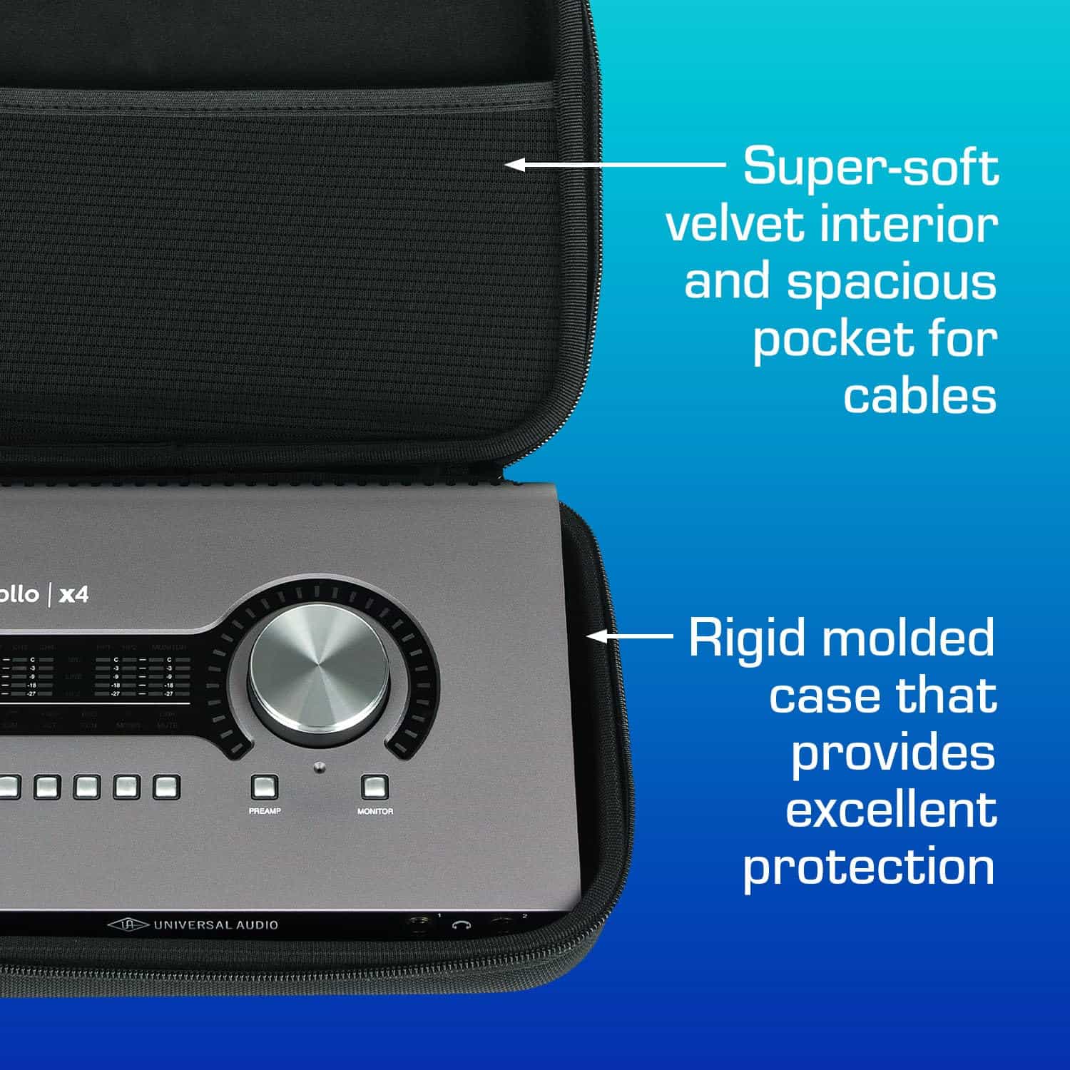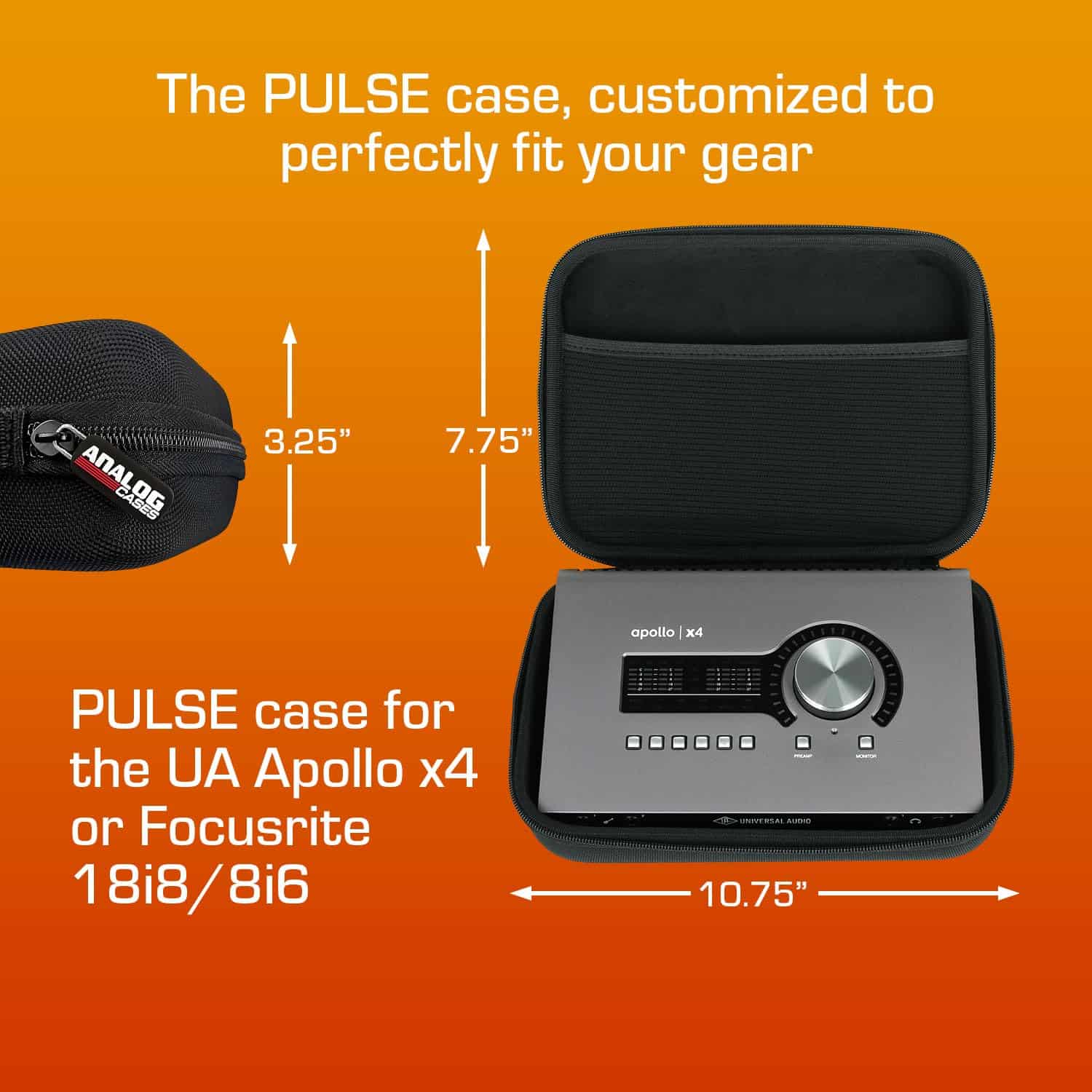 El estuche PULSE para Universal Audio Apollo x4 / Focusrite 18i8 / 8i6 es la solución ideal para tus necesidades de viaje. Con dimensiones interiores de 9.75 x 6.75 x 2.50 pulgadas y dimensiones exteriores de 10.75 x 7.75 x 3.25 pulgadas, este estuche compacto y ligero ofrece una protección excepcional para tus equipos de audio. Fabricado con materiales duraderos de EVA y nylon balístico, este estuche rígido proporciona una barrera resistente contra golpes y impactos. El interior suave de terciopelo protege tus equipos de arañazos y abolladuras, mientras que el amplio bolsillo para cables te permite mantener todo organizado y seguro. La cremallera ultra suave y el asa espaciosa y cómoda hacen que transportar tu equipo sea fácil y conveniente. El diseño de Analog Cases se destaca por su calidad y durabilidad, asegurando que tus valiosos dispositivos estén protegidos en todo momento.