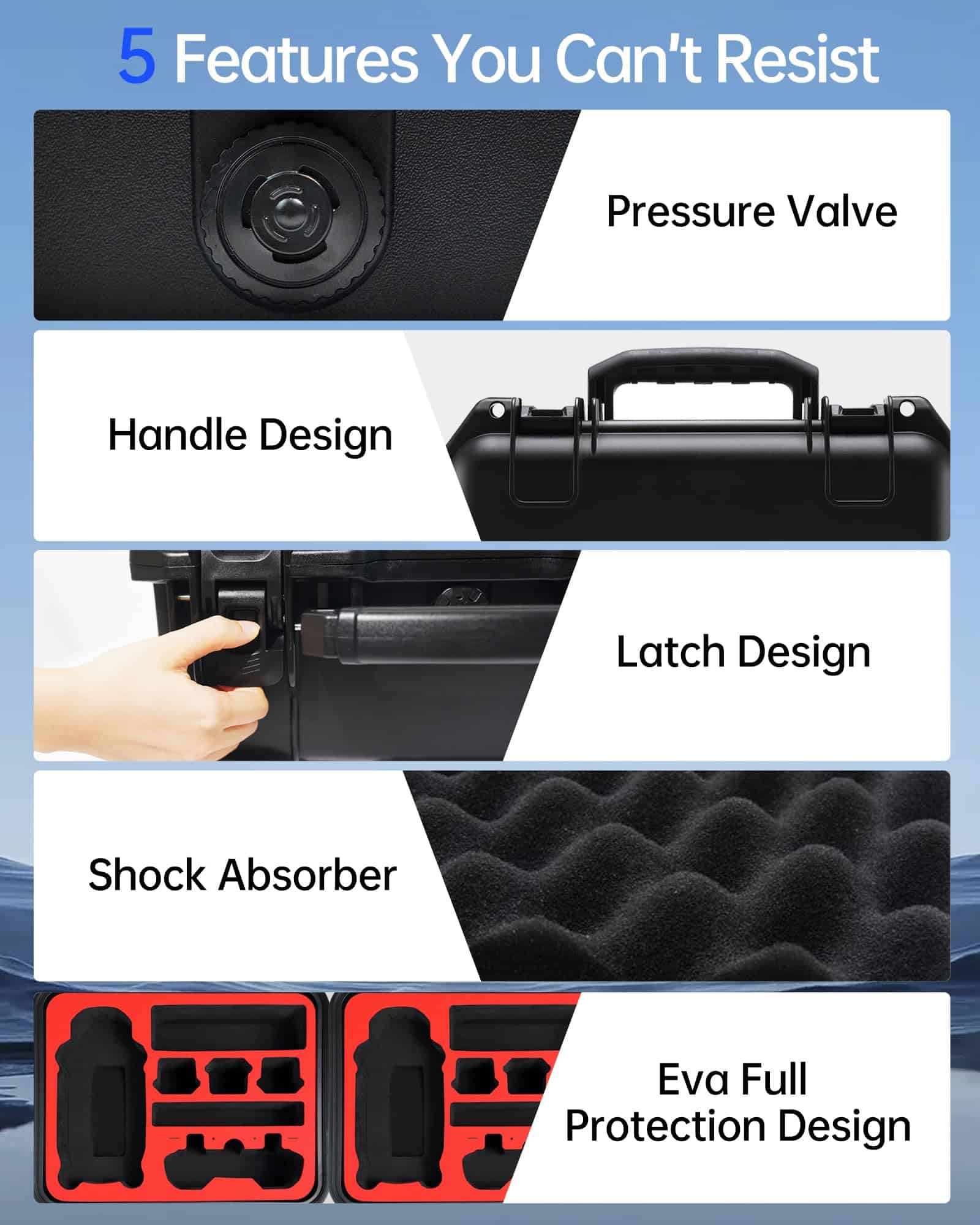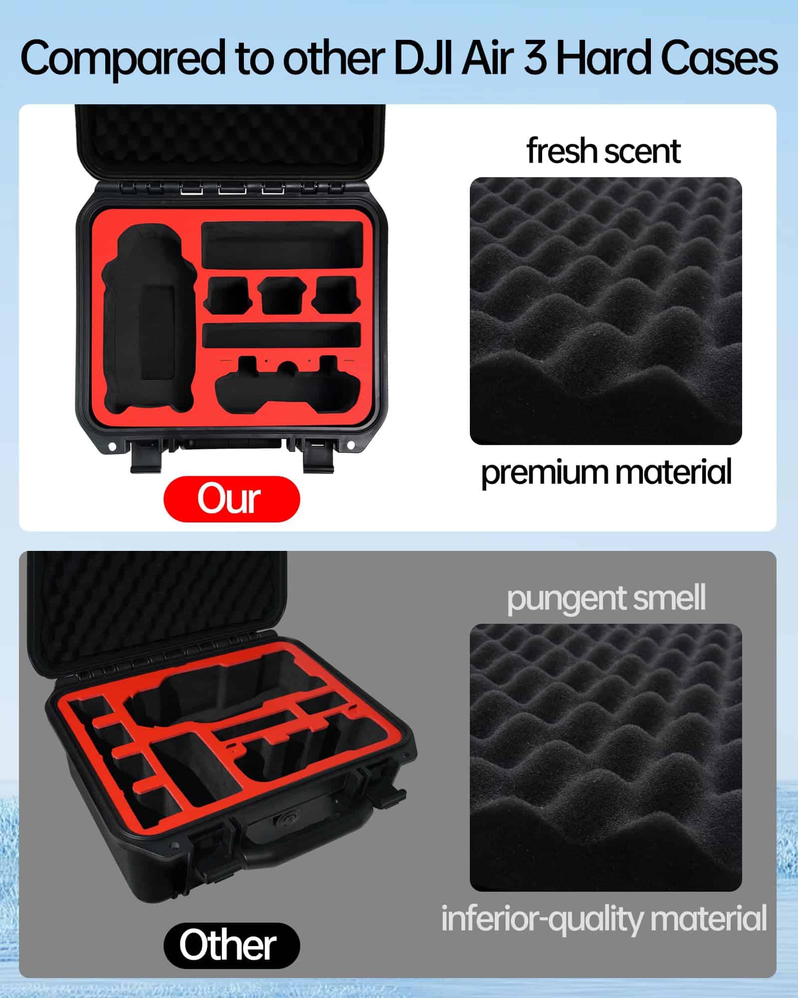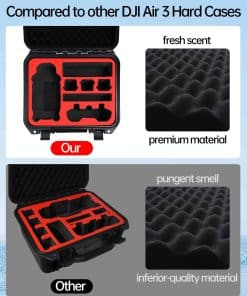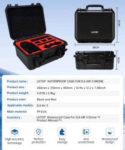 Perfecta compatibilidad con una gran capacidad, este estuche rígido Air 3 puede acomodar su dron DJI Air 3, controladores remotos DJI RC-N1/RC-N2/RC 2, hasta 3 baterías Air 3, concentrador de carga Air 3, así como cargador o cordón para control remoto de repuesto. Con compartimentos dedicados y separadores para proporcionar un espacio de almacenamiento seguro y organizado. Con asa resistente y diseño de doble broche, es perfecto para viajes. Protección mejorada con multi-capa EVA para mejor resistencia al impacto, superior resistencia a los golpes y rendimiento a prueba de agua. Tamaño: 14.96×12.2×7.08 pulgadas. Peso: 5.07 lb. Estuche Air 3 adecuado para diversas situaciones como aventuras al aire libre, fotografía de paisajes, trabajos de fotografía aérea y viajes. Incluye: Estuche rígido para DJI Air 3. ¡No incluye dron ni otros accesorios! Ofrecemos una garantía sin preocupaciones de 1 año y un servicio al cliente amigable.