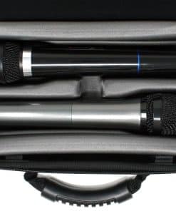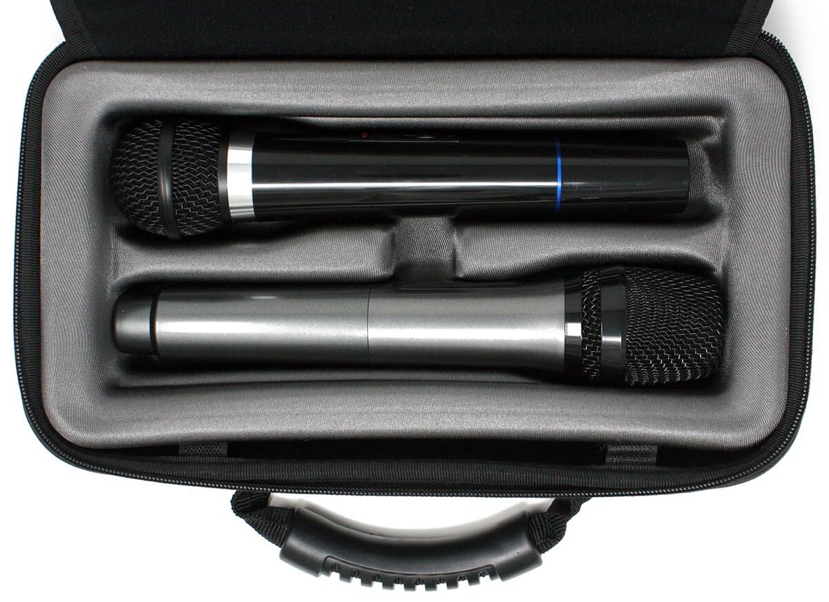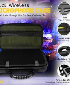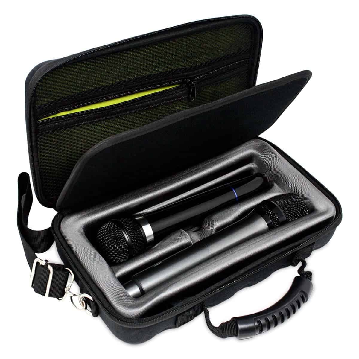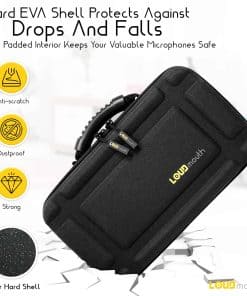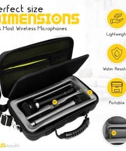 Estuche rígido para micrófonos inalámbricos dobles LOUDmouth – ¡ESTUCHE SOLAMENTE! Este estuche se ha construido con materiales premium para transportar de forma segura dos micrófonos inalámbricos y pequeños accesorios. El compartimento interno ajustado mantiene los micrófonos en su lugar de forma segura con un divisor acolchado para absorber impactos. Se ajusta a dos transmisores de micrófono de mano inalámbricos de hasta 10 x 2″ x 2 – Los compartimentos universales para micrófonos permiten almacenar y proteger una variedad de micrófonos de mano en este estuche. Un divisor acolchado rígido con cierres autoadherentes mantiene todo de forma segura en su lugar y proporciona protección adicional. La tapa superior cuenta con un compartimento con cremallera amarilla brillante con red de malla negra para facilitar la búsqueda de objetos pequeños en un escenario oscuro. Es perfecto para almacenar receptores inalámbricos, adaptadores de audio, clips de micrófono, baterías extra, unidades flash USB, memorias, llaves de batería y hardware, púas de guitarra, cables y otros accesorios pequeños. Diseño compacto para viajar: el estuche para micrófono de mano inalámbrico mide 12.5″ x 7″ x 3.25″ y cuenta con una correa para el hombro ajustable y un asa de goma para facilitar el transporte de los micrófonos inalámbricos. Doble cremallera para un fácil acceso y herrajes de metal. Guarde sus micrófonos de forma segura antes de eventos, espectáculos y uso diario. Incluye solo el estuche LOUDmouth, no contiene micrófonos.
