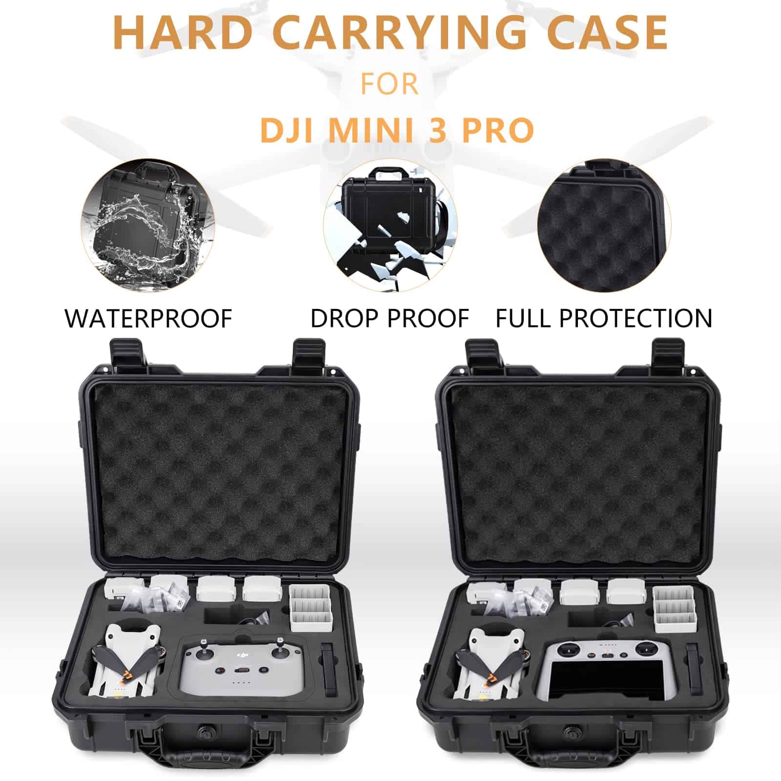2. Protección total El estuche rígido para Mini 3 está hecho de material de PP de alta densidad (Impermeable de nivel IP67), insertado con un interior de EVA de alta calidad y anti-choque, Anti-Crash con protección total. Este estuche rígido a prueba de polvo, impermeable y a prueba de golpes puede proporcionar la máxima protección para los accesorios de tu dron DJI Mini 3.