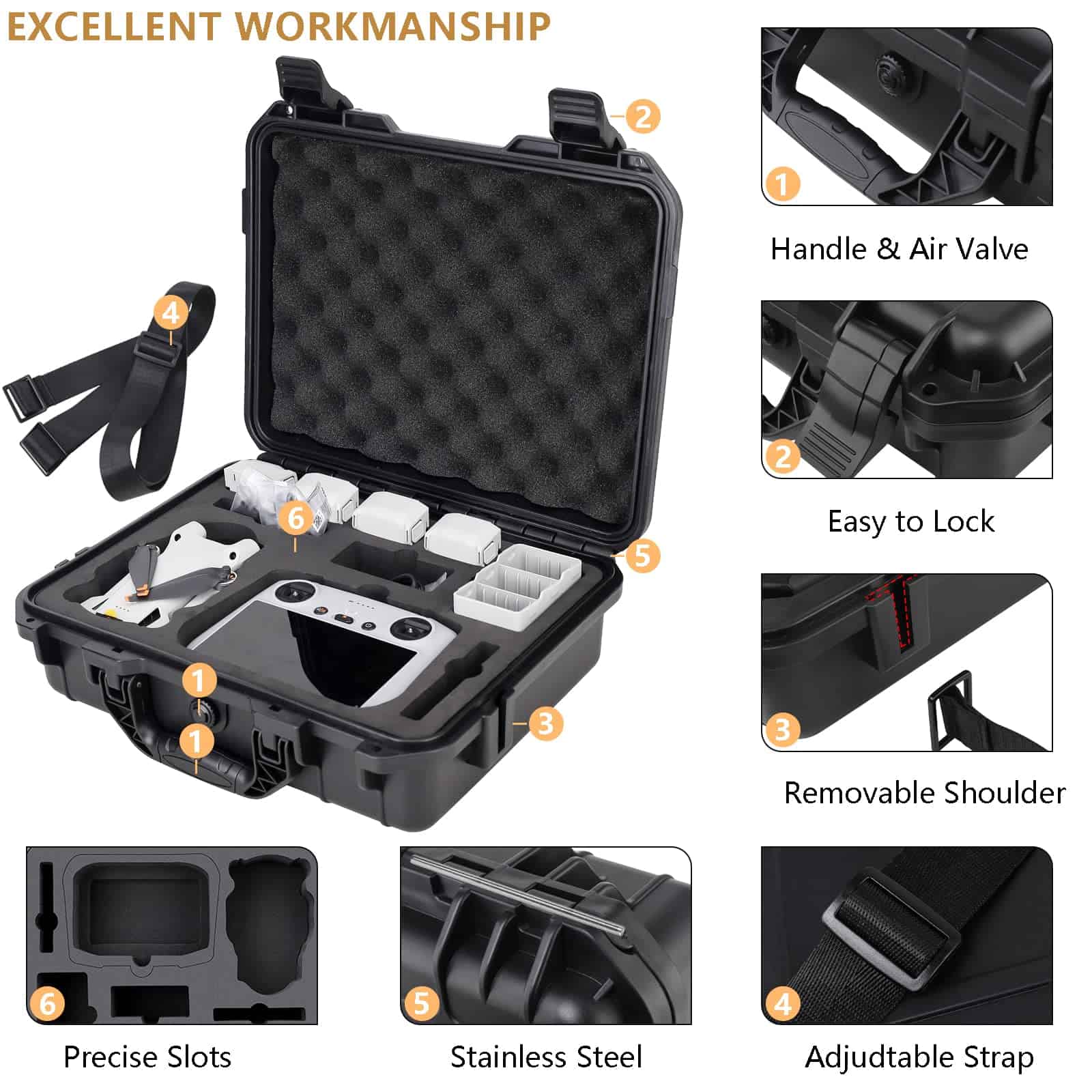 3. Excelente mano de obra El estuche rígido impermeable DJI Mini 3 Pro viene con una válvula de equilibrio automático de presión estándar, los compartimentos se ajustan precisamente al dron DJI Mini 3 y a los accesorios Mini 3, asa cómoda y duradera y adicionalmente con 2 cierres de presión fáciles de abrir. Este estuche Mini 3 Pro también soporta la cerradura tipo TSA para transportar.
