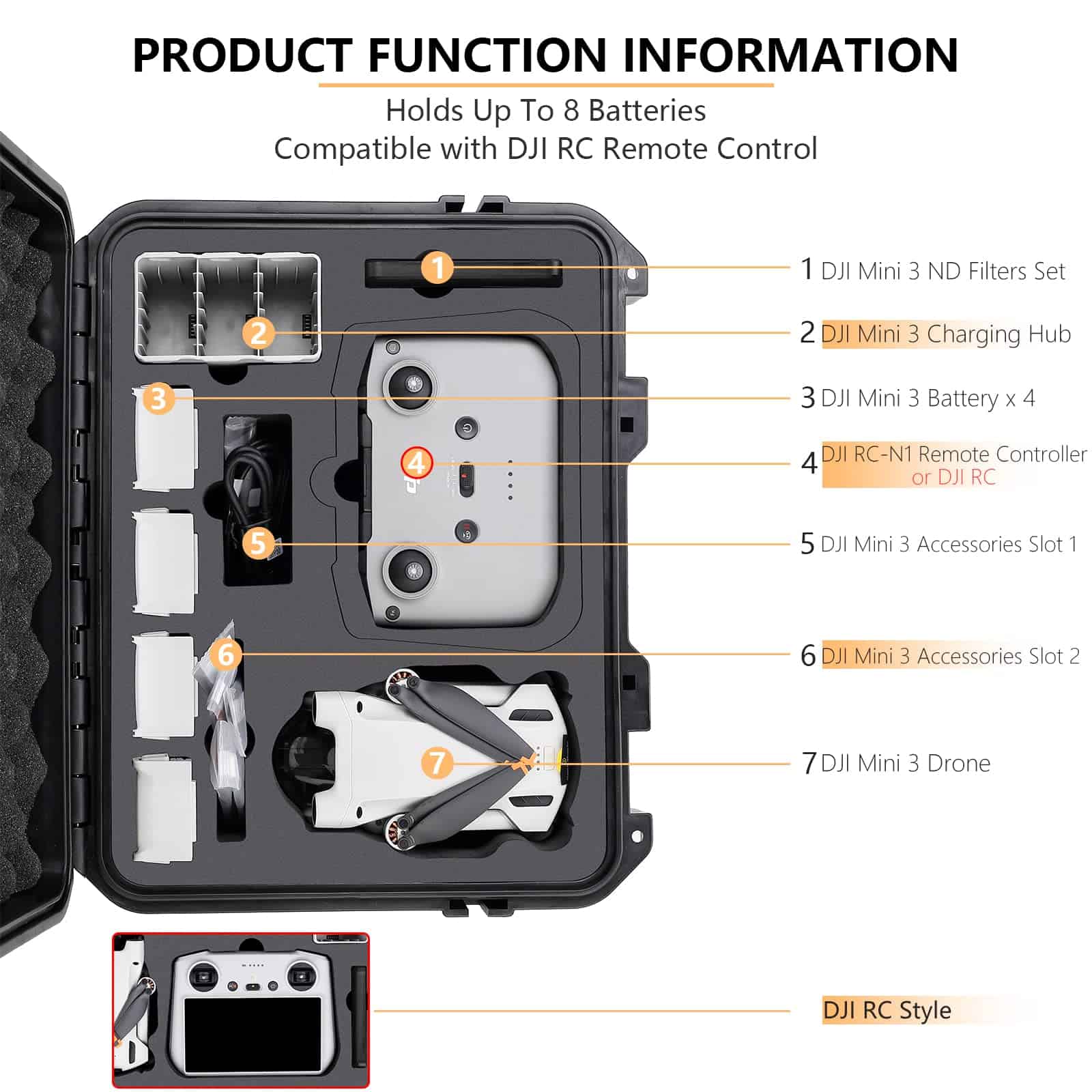 1. Estuche profesional para DJI Mini 3 Pro especialmente diseñado para el dron DJI Mavic Mini 3, compatible con el control remoto DJI RC-N1 / Controlador inteligente DJI RC. Para 1 dron DJI Mini 3 Pro, 8 baterías (1 batería instalada en el dron y 3 en el hub de carga), 1 controlador DJI, 1 hub de carga de batería, estuche de filtro ND y otros accesorios para el dron Mini 3.