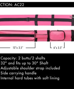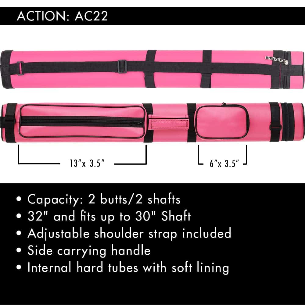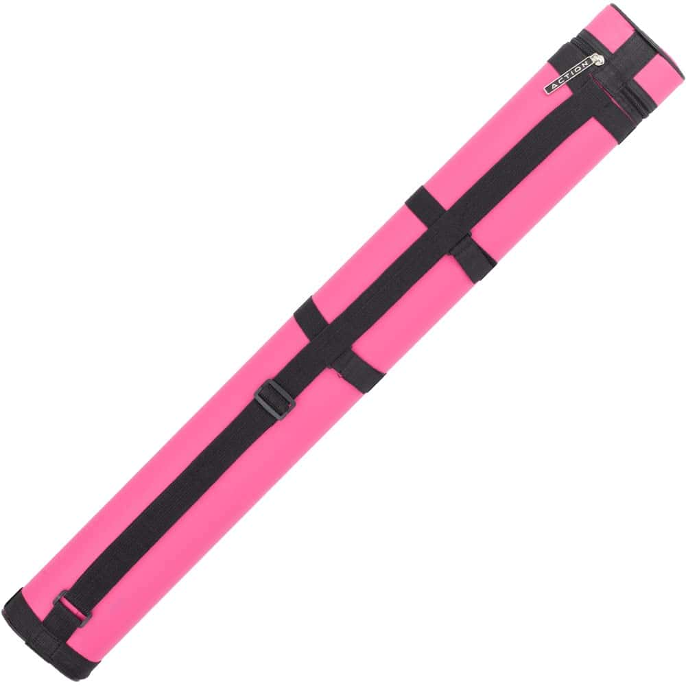 El estuche rígido para tacos de billar de Action protegerá y transportará sus tacos de billar con estilo. Este estuche de tubo de 34″ de largo cabe 2 colas y 2 flechas. El interior está moldeado en caucho con revestimiento de fieltro para proteger sus tacos. Hay dos bolsillos externos para accesorios de billar como tiza y puntas, y el bolsillo inferior es lo suficientemente grande para un salto. Este estuche viene en varios colores: negro, azul, marrón, burdeos, gris claro, naranja, rosa, púrpura, rojo, azul real y blanco. Las flechas o colas se pueden insertar con la punta o el pin hacia abajo; el interior sostendrá una flecha o cola de hasta 32 pulgadas de largo. Este estuche para transportar tacos de billar tiene una correa para el hombro de vinilo de 1 pulgada de ancho y un asa de transporte suave para un transporte seguro y fácil de sus tacos. Respaldado por la garantía del fabricante de 1 año de Action.