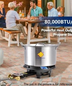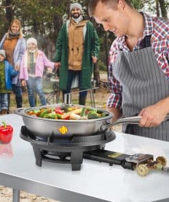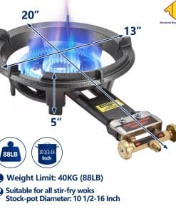 Estufa de propano al aire libre ARC, 13″ Quemador de propano individual, Quemador de wok portátil de hierro fundido con anillos de control bilateral y regulador ajustable de 0-20 PSI, Manguera de acero inoxidable. Potente salida de calor: sistema de alta presión de 80,000 BTU/h-100,000 BTU/H, perfecto para cocinar y saltear con wok. Es un quemador de gas ideal para configurar una estación de wok al aire libre. Este quemador de propano ARC produce más calor en comparación con otras marcas. Calidad Premium: la estufa de propano ARC está hecha para durar, ya que está hecha de hierro fundido resistente con recubrimiento a prueba de condiciones climáticas para soportar cualquier condición exterior. Válvula ajustable: la doble válvula de latón puede ajustar el quemador de anillo interno y externo según sus necesidades de cocción. Esta estufa de exteriores funciona con cualquier tamaño regular de tanque de gas propano. Lista de paquetes: El tamaño del quemador es de 20″ 13″ 5″ (L A H), regulador de certificado «CSA» con ajuste de llama y manguera de acero inoxidable de 47 pulgadas. Amplia compatibilidad: el cocinero de propano de estufa exterior ARC es adecuado para utensilios de cocina de 10.5-16 pulgadas, límite de peso de 40KG (88LB); El quemador debe colocarse en terreno plano o sobre una mesa de piedra de granito.