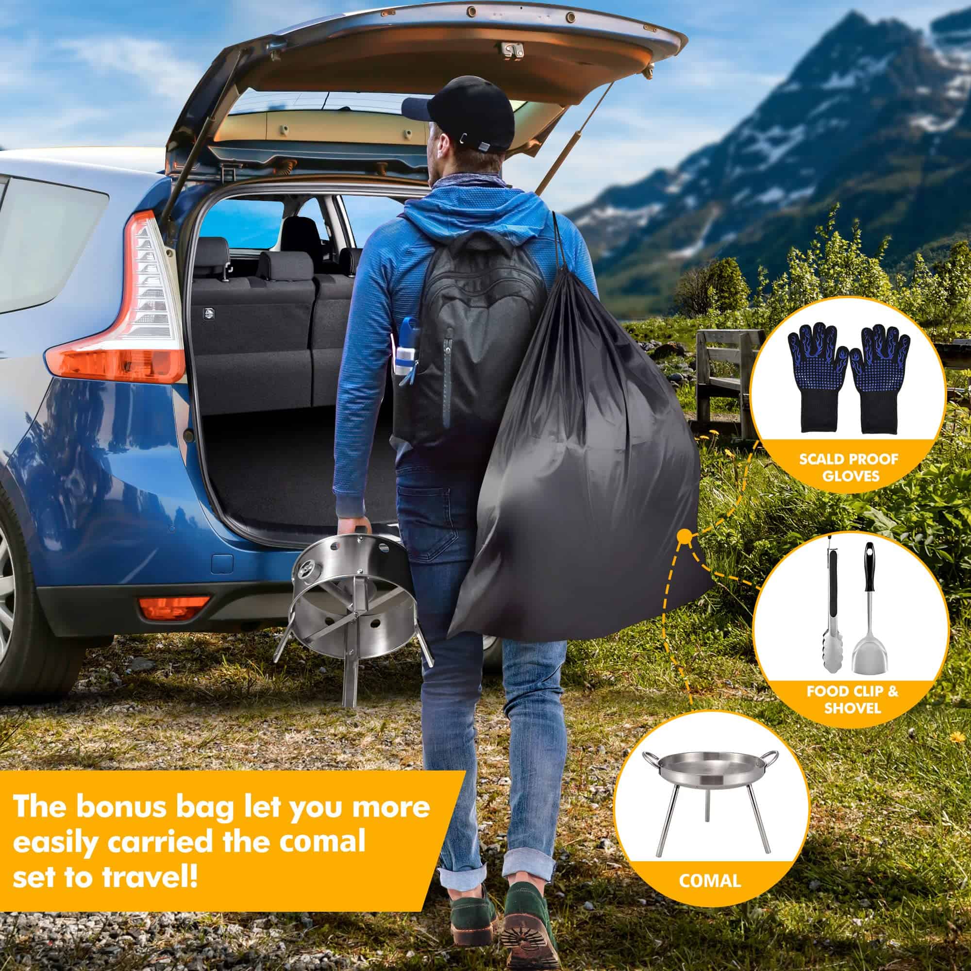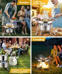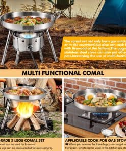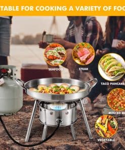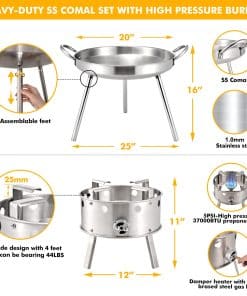 Estufa de propano de un solo quemador de acero inoxidable resistente AOSION con juego de comal. El comal está fabricado en acero inoxidable con 3 pies de montaje libre y un tamaño total de 20″ x25″ x16″ Hcm. El quemador está hecho de hierro fundido pesado con un recubrimiento resistente a la intemperie y cuenta con 3 soportes, mientras que el cuerpo de hierro fundido pesado garantiza una durabilidad excepcional. Con una potencia de alta presión, esta estufa de propano permite cocinar los alimentos más rápido en cualquier entorno al aire libre. Además, podrás cocinar una variedad de alimentos, desde carne y pescado hasta tortillas asadas, verduras y mucho más. El juego de comal puede usarse en diferentes escenarios al aire libre, como patios, campamentos y fiestas. Las tres patas de la estufa pueden sostener ollas y cacerolas de diferentes tamaños, permitiendo hervir agua o cocinar fideos. El juego de comal es fácil de limpiar, simplemente usa un cepillo con líquido limpiador. ¡Además, es multifuncional ya que puedes utilizarlo tanto en exteriores como en tu cocina! Para mayor comodidad, el juego incluye guantes resistentes al calor, palas de acero inoxidable, pinzas para alimentos y bolsas de almacenamiento. ¡Prepara tus recetas favoritas de cocina al aire libre con este versátil y duradero juego de comal!