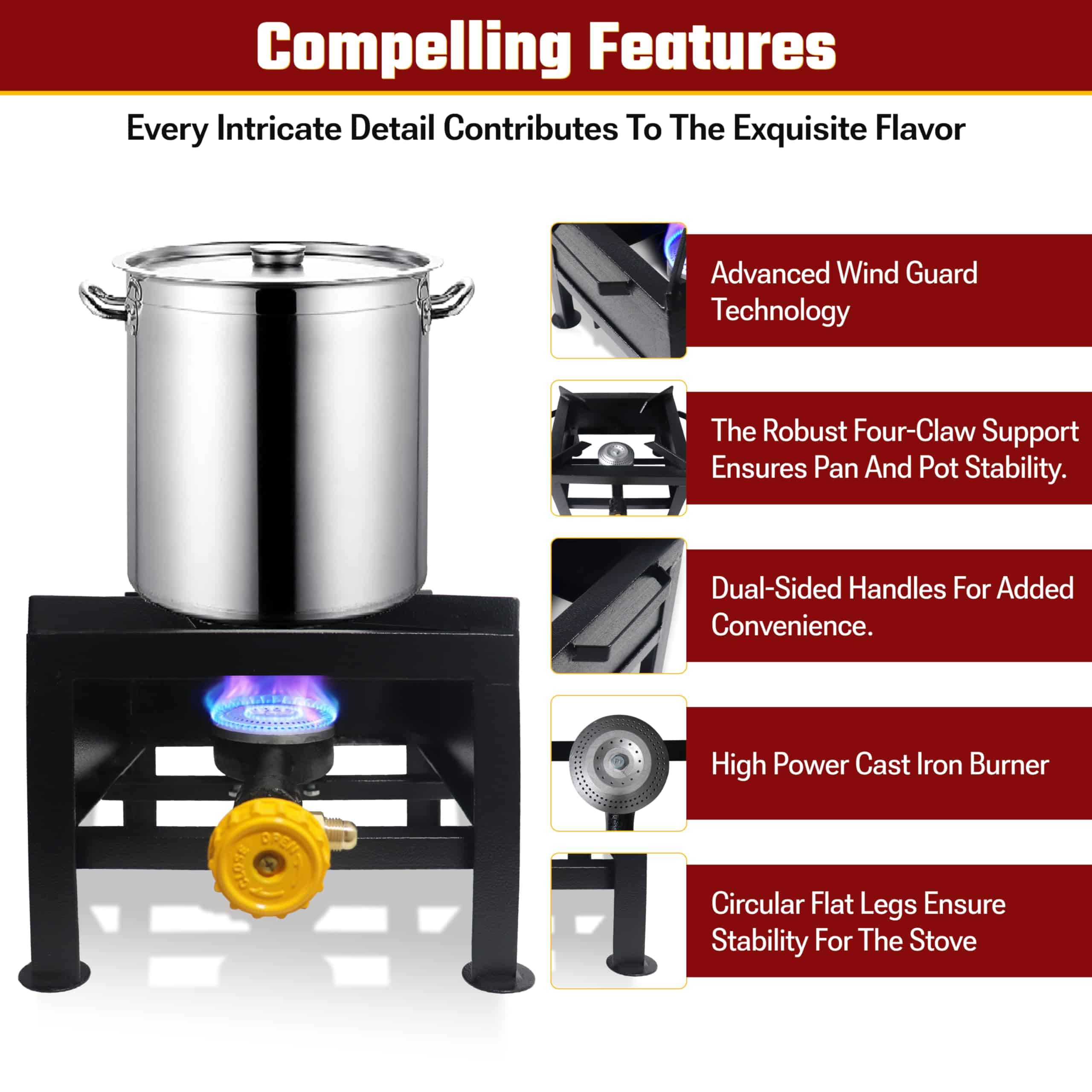 1. La elección preferida: Este quemador de propano de exterior de un solo quemador es compatible con todas las ollas y sartenes, con capacidad mínima de 7″. Perfecto quemador de propano de exterior & para cocinar en interiores. 2. Diseño Resistente: Esta resistente estufa de propano de un solo quemador para freír pavos está hecha de acero de alta calidad y recubrimiento en polvo, lo que la hace lo suficientemente resistente para soportar altas temperaturas. Su diseño duradero garantiza una larga durabilidad de uso. 3. Protector contra el Viento Incorporado: Nuestra estufa de propano de un solo quemador para cocinar en exteriores cuenta con un bloqueador de viento incorporado, asegurando una llama estable para cocinar incluso en condiciones ventosas. Perfecto para freír pavos con quemadores de propano al aire libre y cocedor de cangrejos. 4. Quemador de Alta Presión: Quemador de propano al aire libre para olla grande quemador de propano de alta potencia ofrece una alta producción para un solo quemador al aire libre y se puede llamar quemador de pavos, quemador de cerveza casera de propano o quemador de cangrejos. 5. Estufa de Propano para Elaboración de Cerveza Económica: Nuestros quemadores de propano para cocinar al aire libre ayudan a una cocina económica para preparar comidas sobre la marcha de forma económica, quemador de freír pavos de escala grande solamente, quemador de caldera de cerveza.